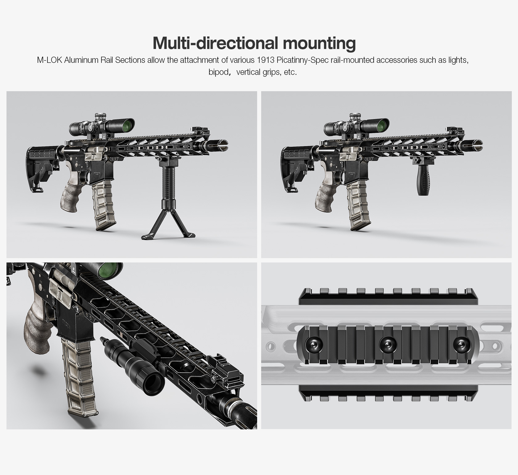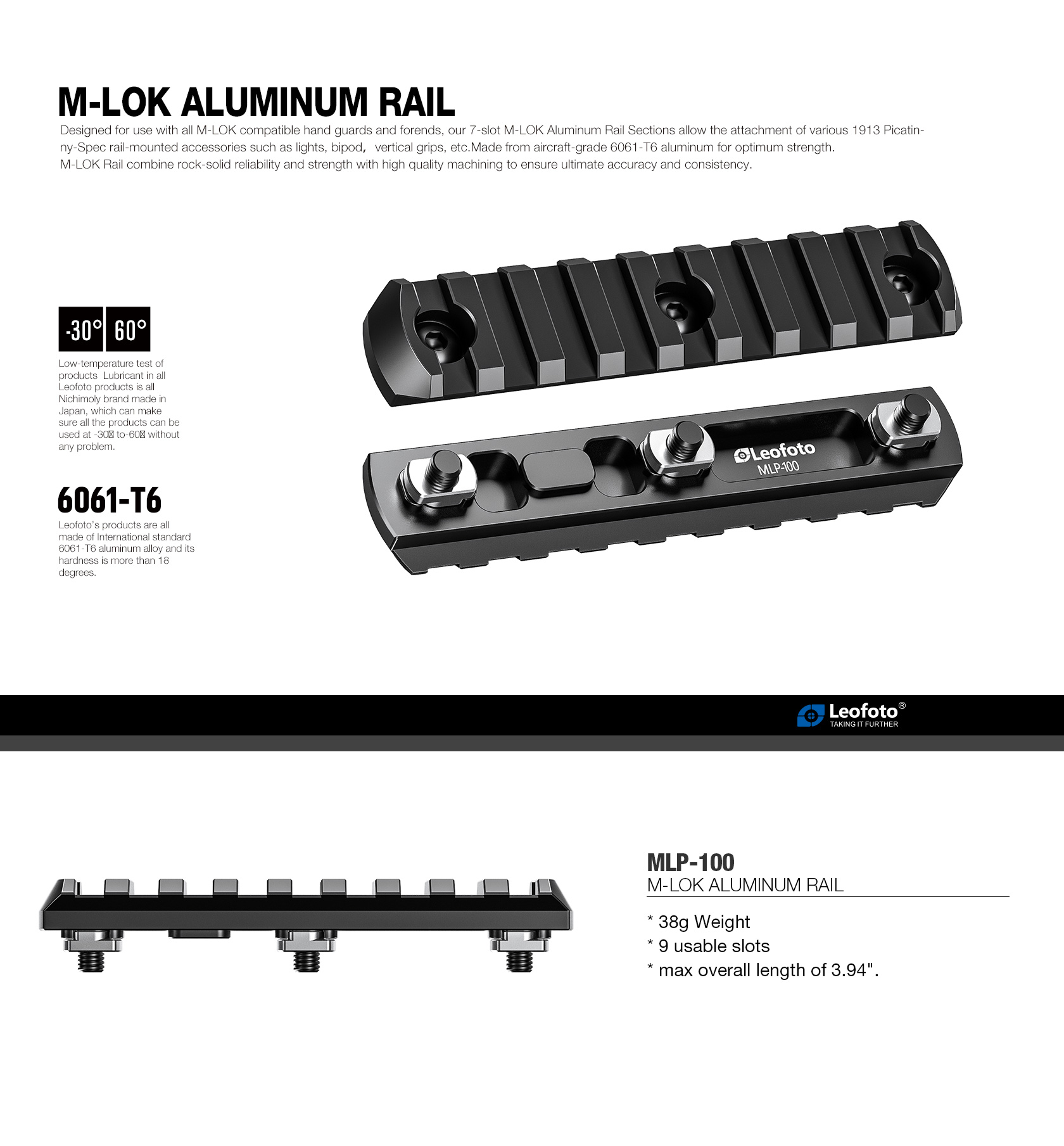 The Leofoto MLP Series M-LOK Quick Release Plate is Picatinny compatible. The plate is CNC machined from T6061 and hard anodized for durability and can be secured to the M-LOK handguard of compatible rifles. Rifle accessories can then be easily mounted via the picatinny rail.