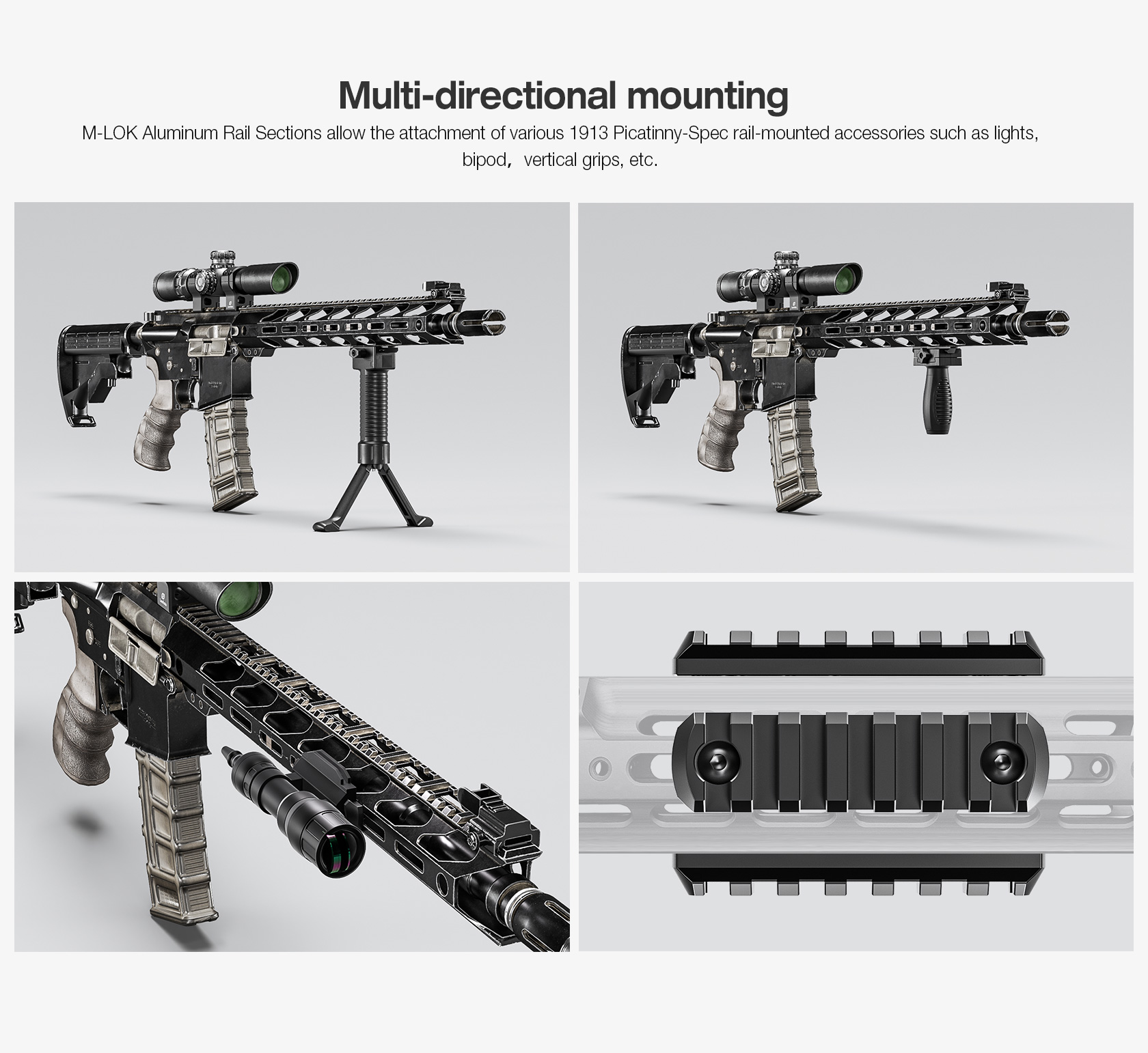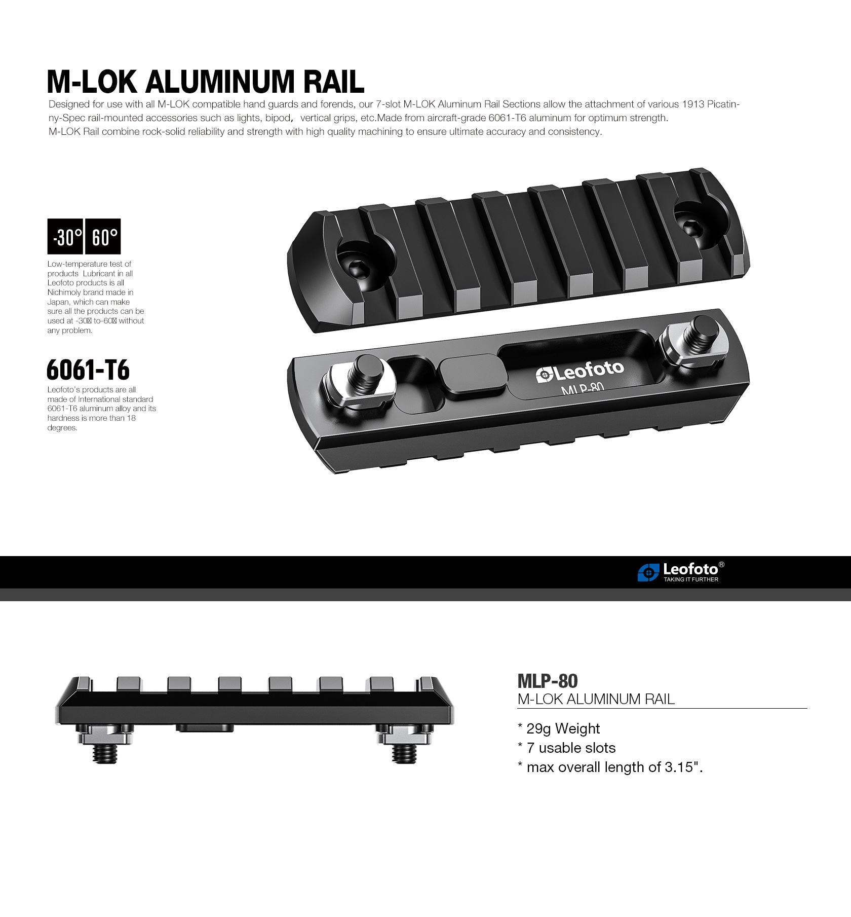 The Leofoto MLP Series M-LOK Quick Release Plate is Picatinny compatible. The plate is CNC machined from T6061 and hard anodized for durability and can be secured to the M-LOK handguard of compatible rifles. Rifle accessories can then be easily mounted via the picatinny rail.