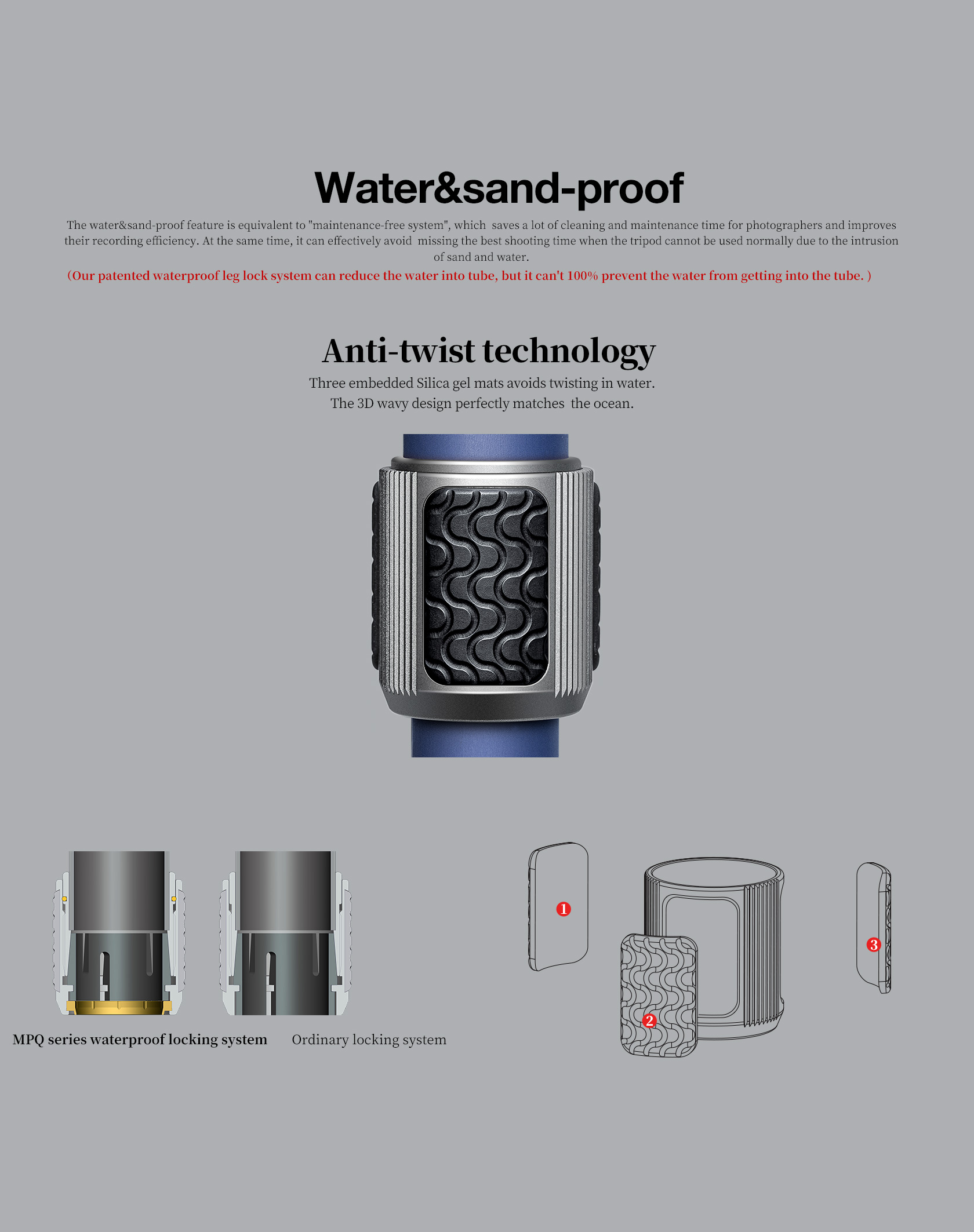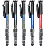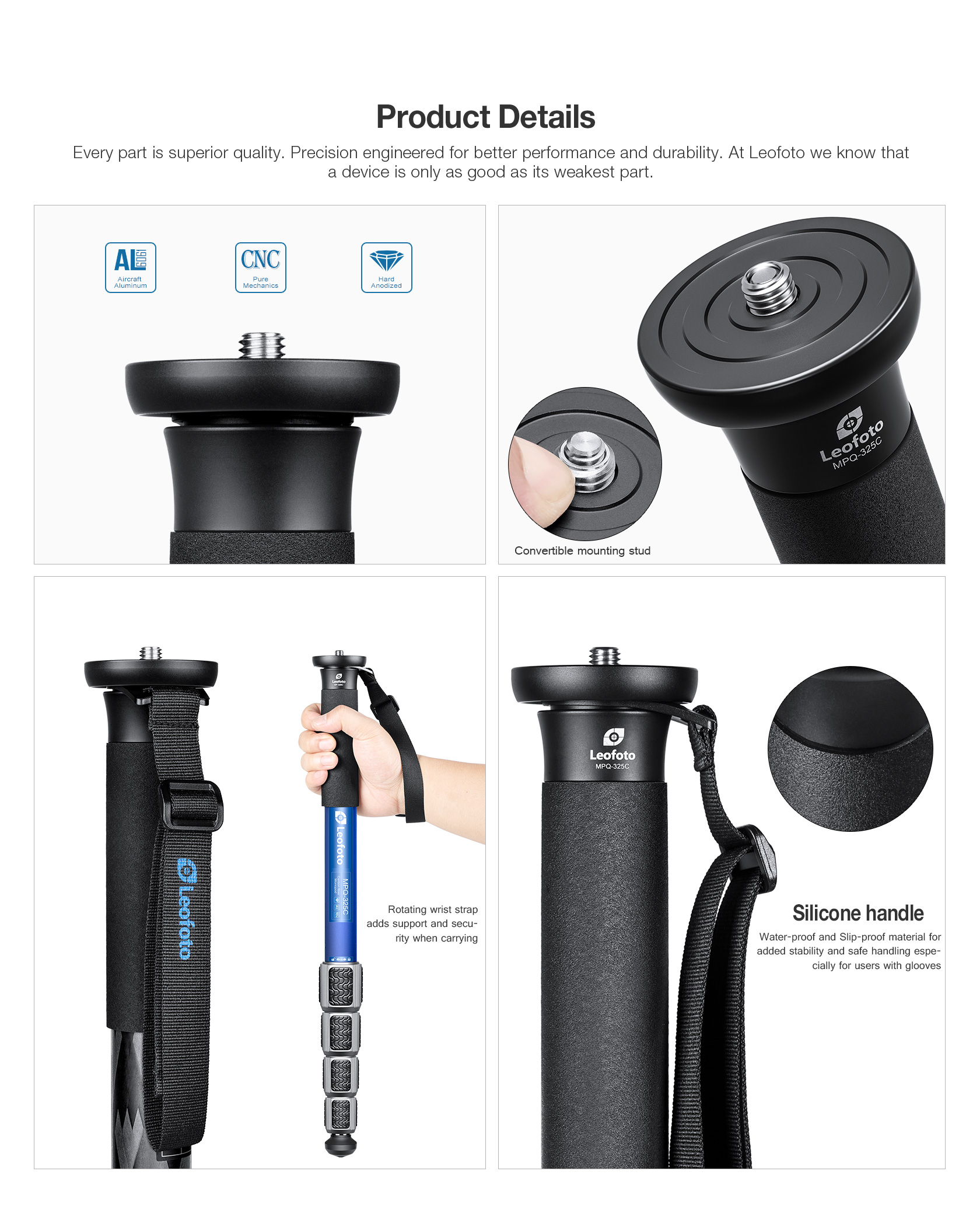 The Leofoto MPQ Series Monopods include all of the same great features found on the MP Series monopods and combines them with the latest premium quality carbon fiber of the LQ Series tripods and the water-proof twist leg locks from the LP/LA Sea Series tripods. The MPQ monopods are constructed with Leofoto’s latest 3rd generation carbon fiber with increased density and a new “snow capped mountain pattern” inspired by nature. Featuring a durable rubber grip and wrist strap for security, the MPQ Series monopod is capable of supporting cameras with large telephoto lenses. The rubber foot prevents it from sliding on smooth surfaces, but is also removable and can be replaced with a separately available steel claw, spike, or other Leofoto accessory to facilitate the best traction for any given terrain. When not in use, turn the ergonomic twist leg locks to collapse the support down and pack it in the included carrying case. The threaded mounting stud on the top of the monopod features a convertible 1/4″-20 and 3/8″-16 screw, making it universal for most cameras and lenses.