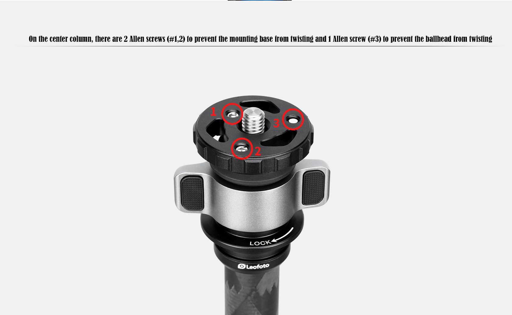 • On the center column, there are 2 Allen screws (#1,2) to prevent the mounting base from twisting and 1 Allen screw (#3) to prevent the ballhead from twisting.