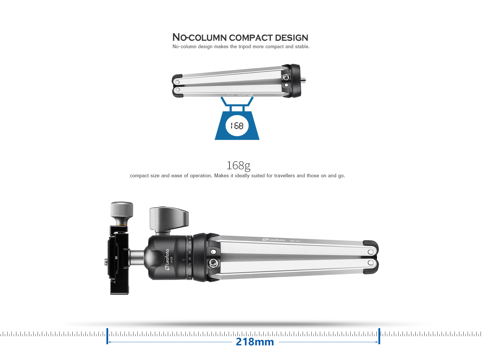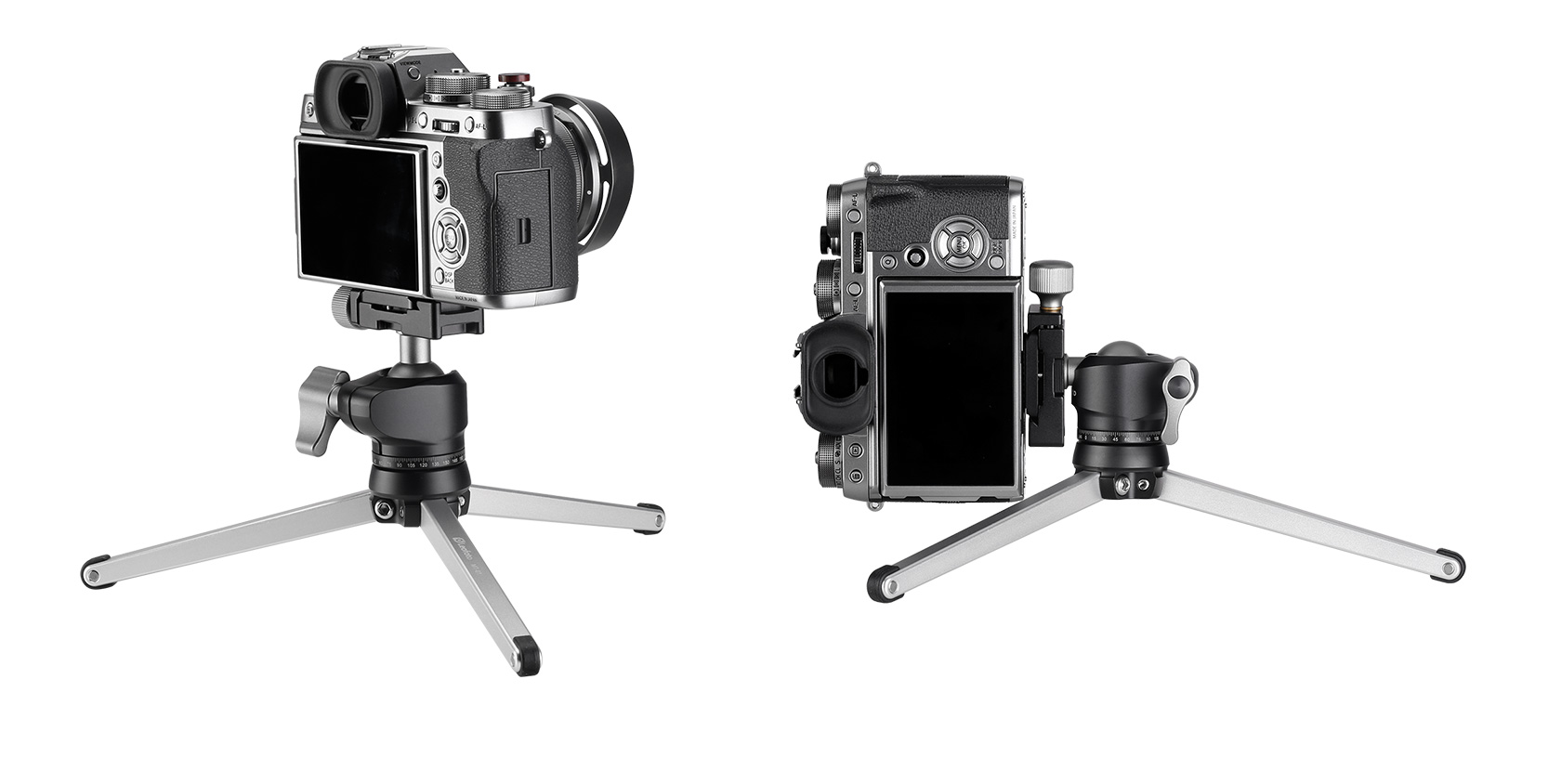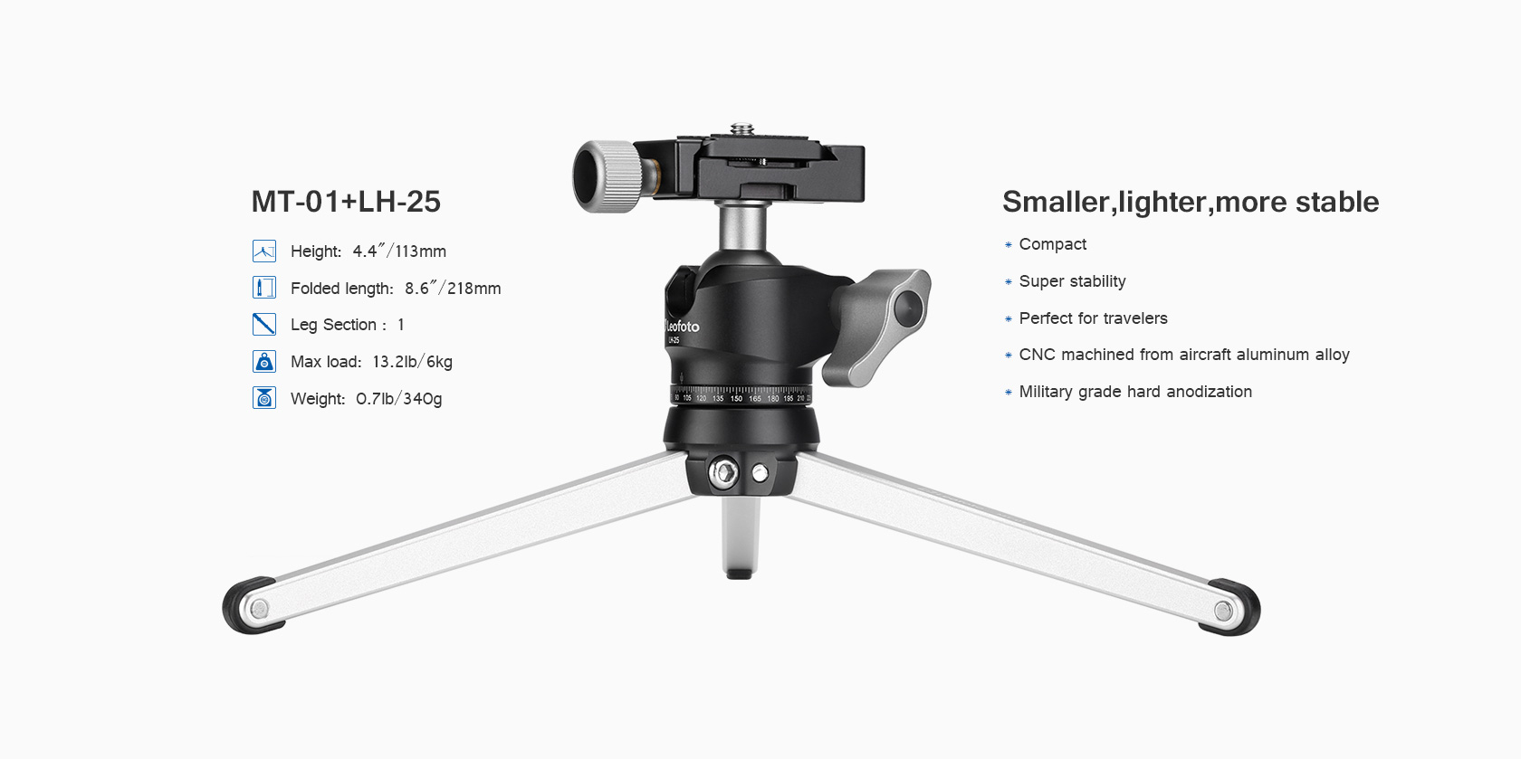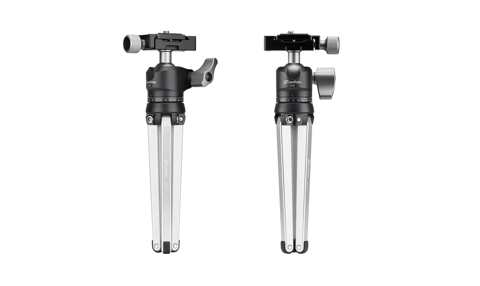 The Leofoto MT-01 Mini Tripod adjusts into different positions without any knobs or levers having to be used. Just set each leg to the desired angle individually. The compact single leg section tabletop tripod features a 1/4″-20 mounting screw and comes with a 3/8″-16 mounting socket.