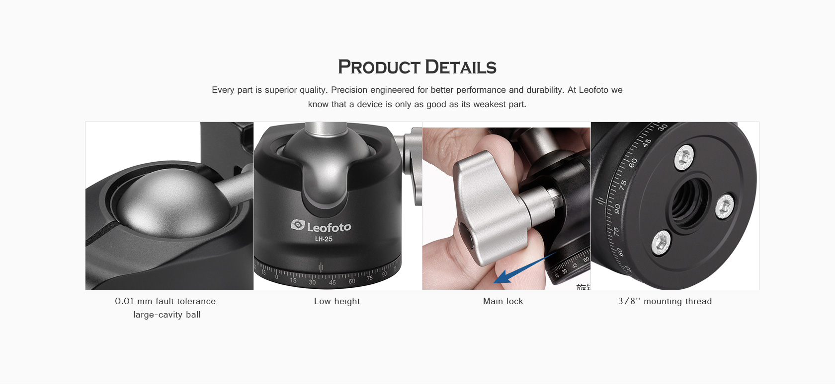 Made of aluminum with an anodized finish for durability, the Leofoto LH-25 Mini Ball Head uses a screw-knob clamp and features a compact design, which makes it easy to travel with and use.