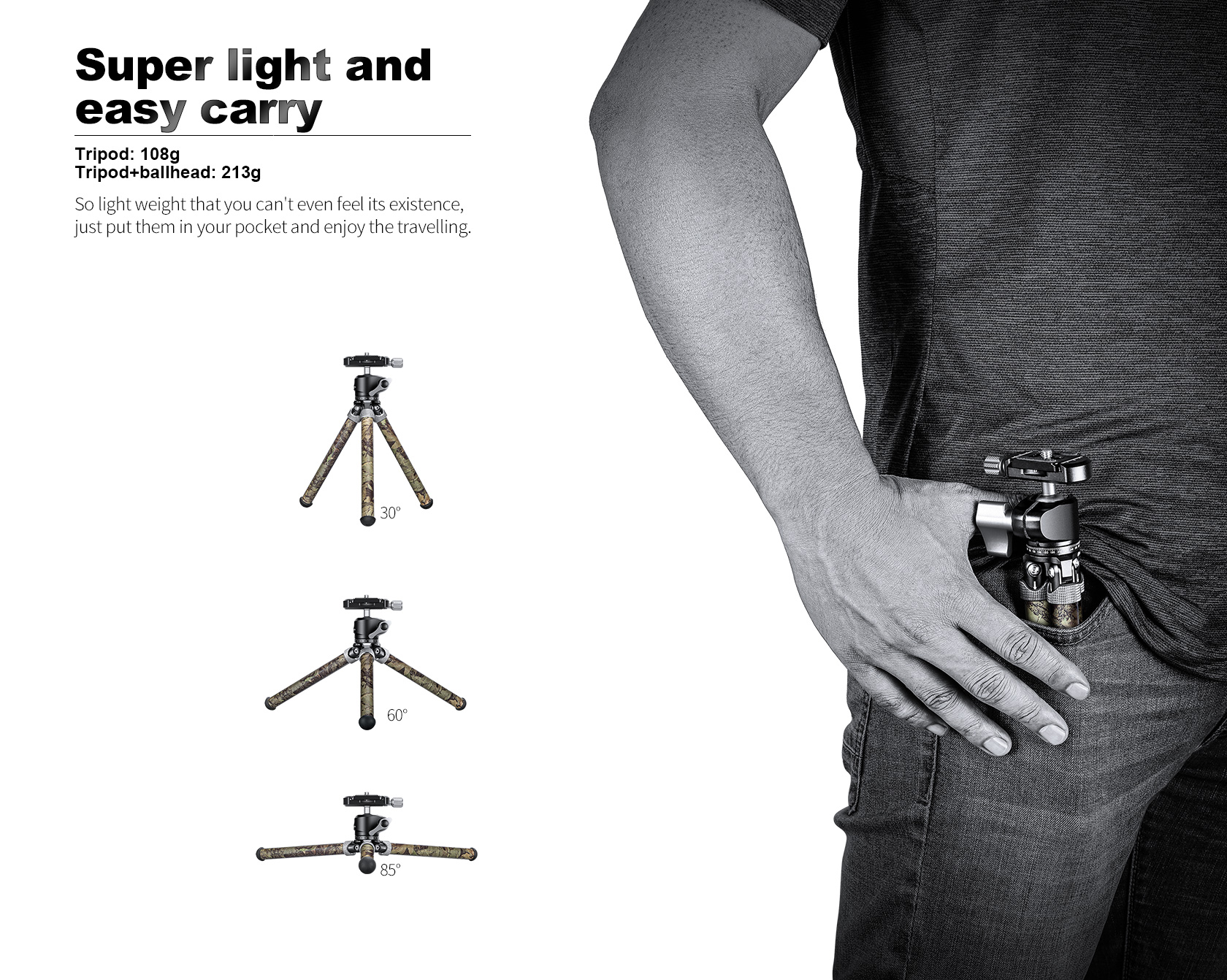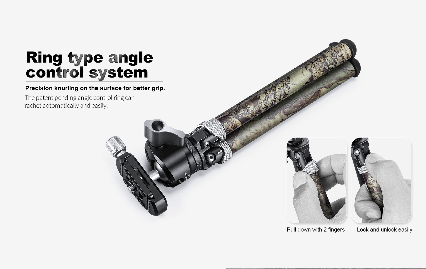 The Leofoto MT-02C Mini Tripod adjusts into different positions without any knobs or levers having to be used. The featured two-finger, knurled leg locks are extremely convenient for setting each leg to the desired angle individually. The legs allow you to have 3 variable leg angles, 30-degree, 60-degree, and 85-degree. The compact single leg section tabletop tripod features a 1/4″-20 mounting screw.