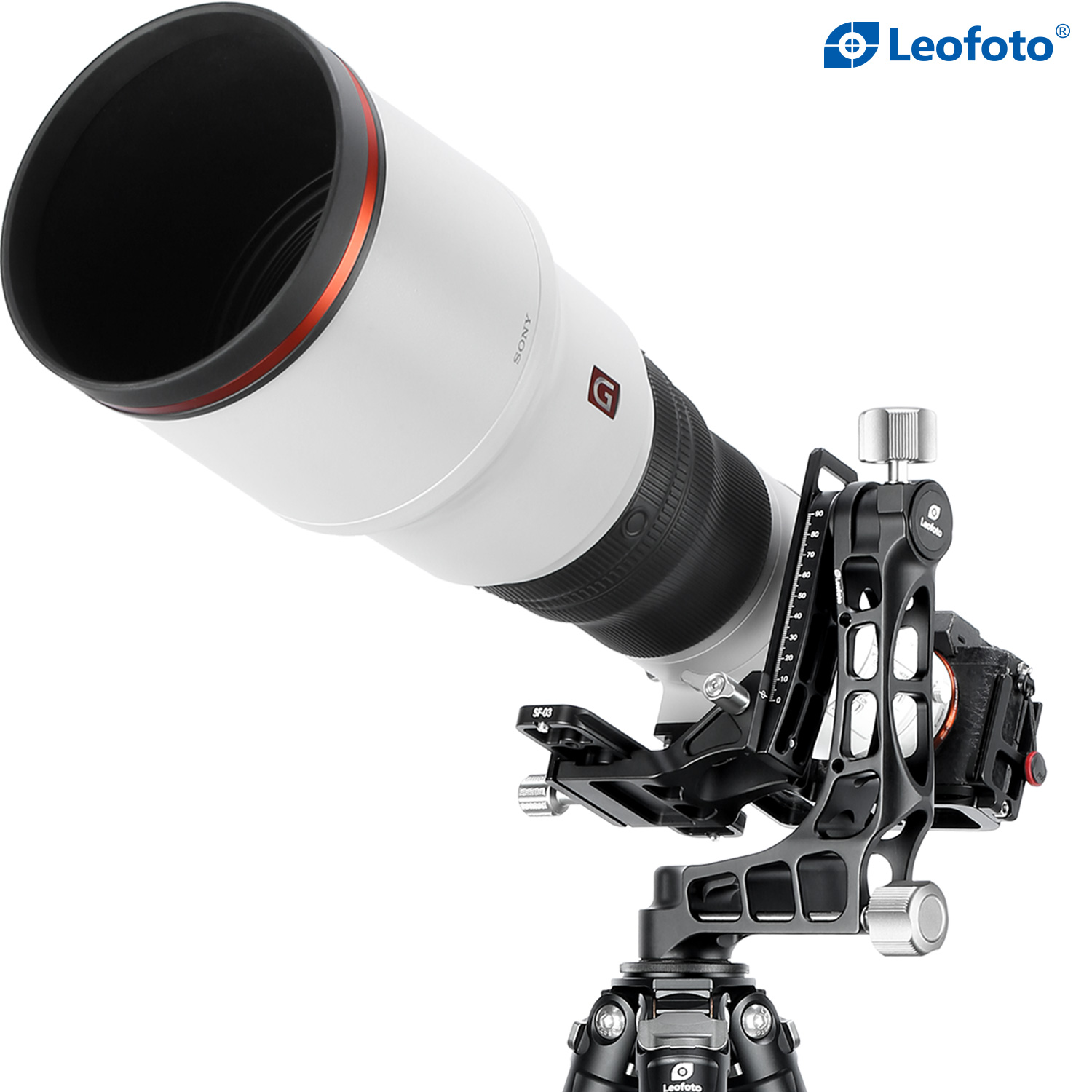 Travel lightly with the Leofoto PG-1 Gimbal Head constructed from T6061 aluminum. The PG-1 enables you to capture fast-moving subjects with a large and heavy telephoto lens that you otherwise could not do manually holding the lens. The arm swings back and forth and can be locked down at the required angle. The camera platform, which is Arca-type compatible, has height adjustability to help balance a telephoto lens on the head. Future setups can be easily repeated because of the printed scale on the side of the swing arm. Also, on the side of the arm are 1/4″-20 sockets for accessories. The gimbal head can easily hold up to 55 lb of equipment and rotate a full 360° while keeping the horizon straight using the bubble level at the base of the head.