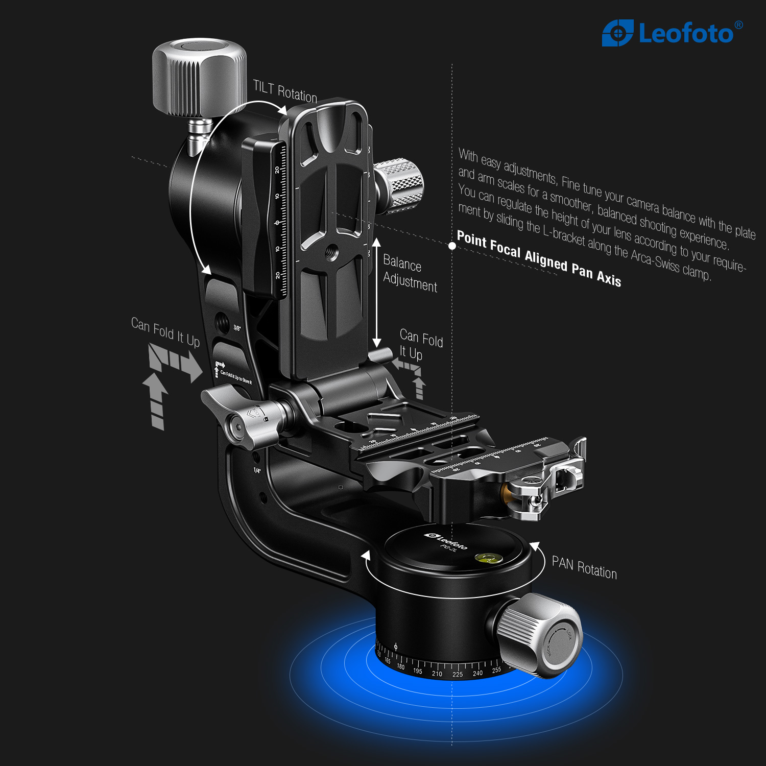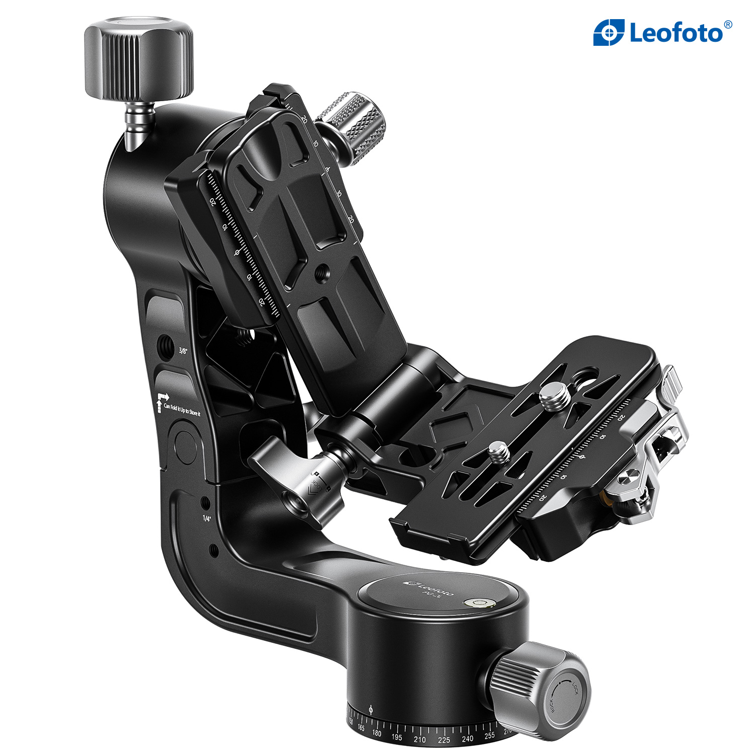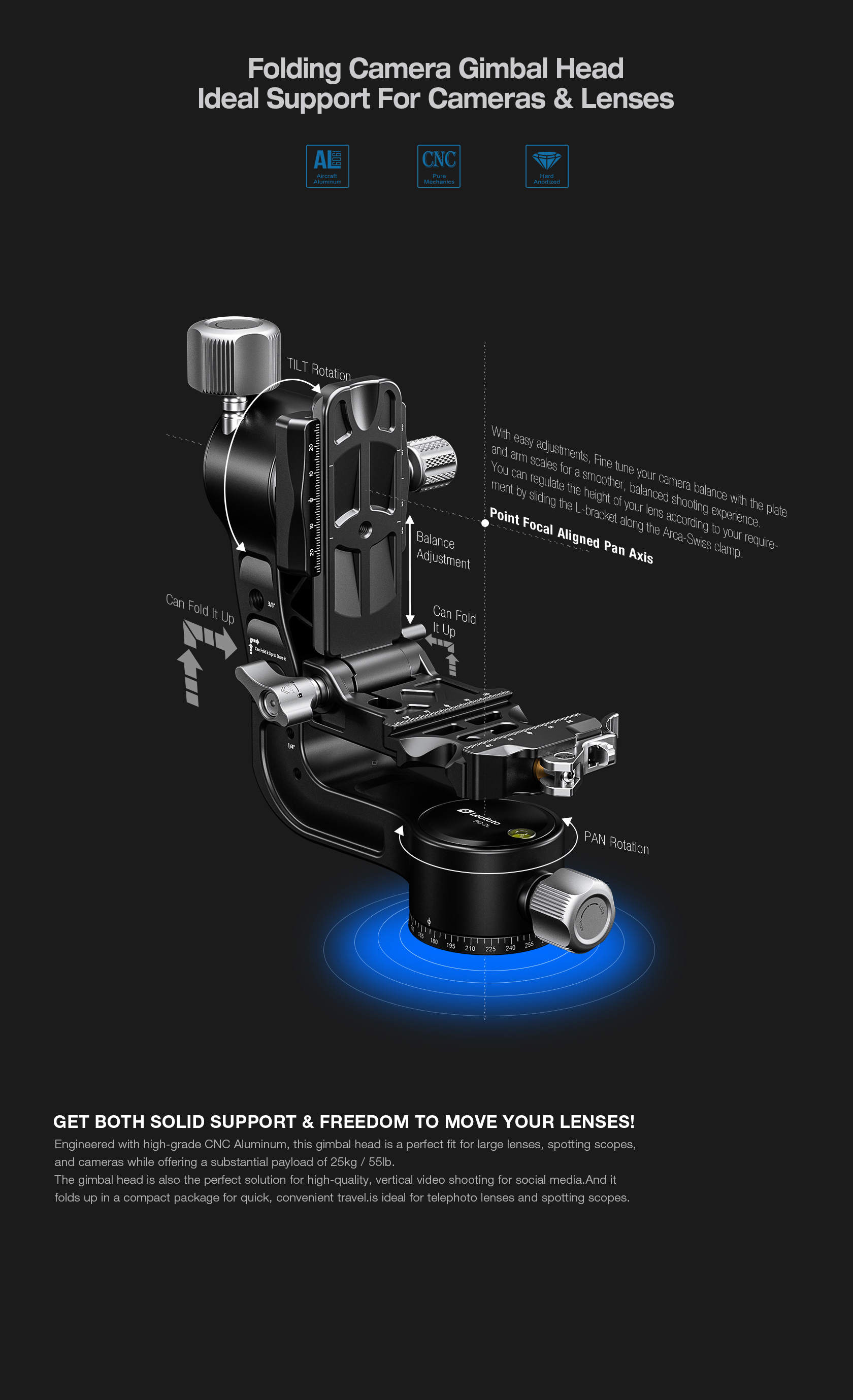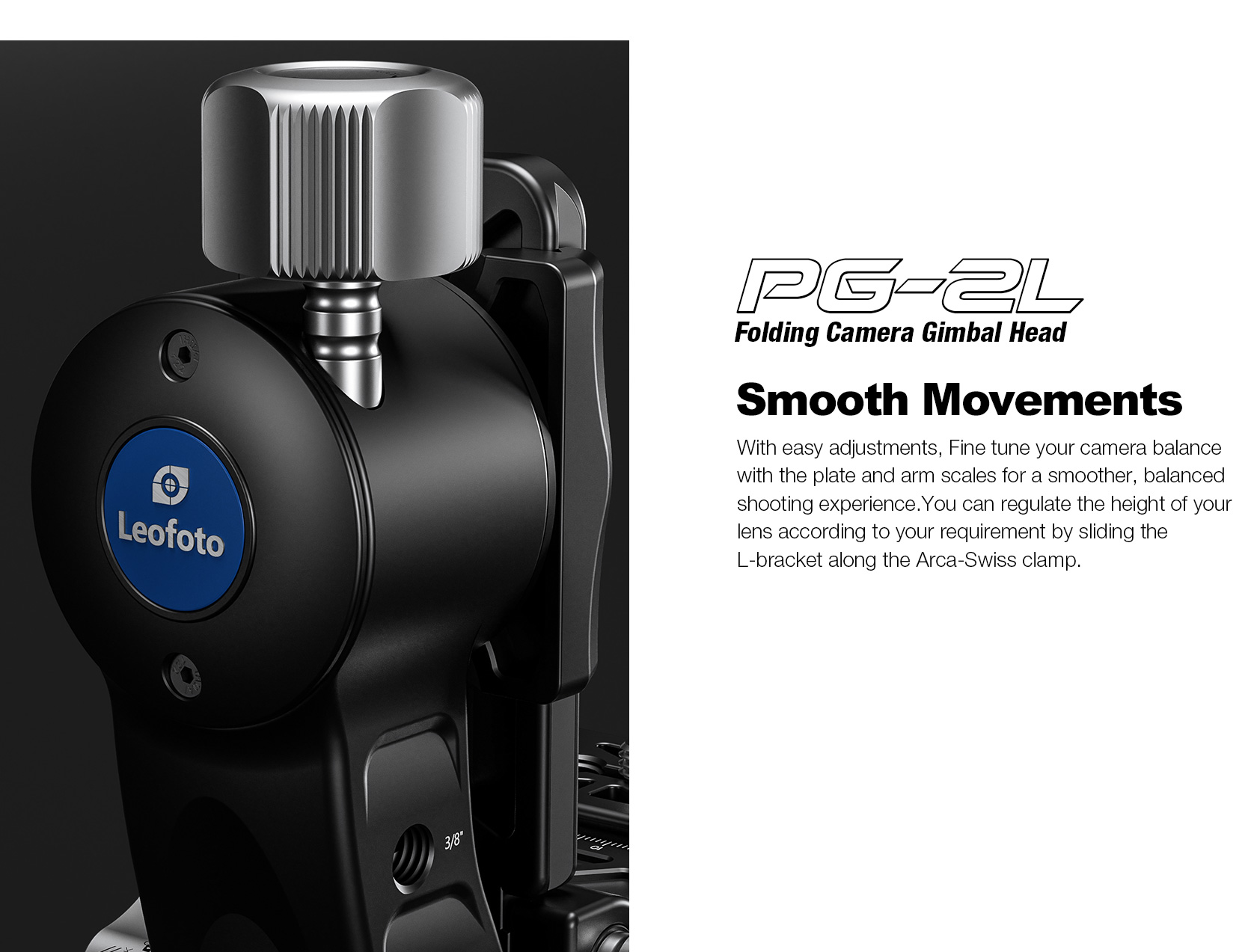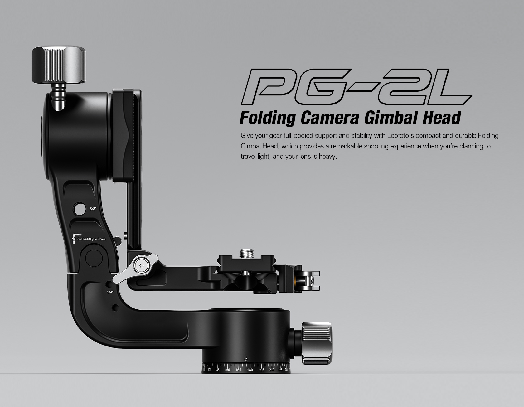 The Leofoto PG-2/PG-2L Folding Gimbal Head is constructed from T-6061 aluminum and hard anodized for maximum strength and durability. The PG-2 enables you to capture fast-moving subjects with a large and heavy telephoto lens that you otherwise could not do manually holding the lens. The arm swings back and forth and can be locked down at the required angle and the gimbal also has a bubble level on the base. The camera platform, which is Arca-type compatible, has height adjustability to help balance a telephoto lens on the head. Along the arm of the gimbal are a 3/8″ and two 1/4″ accessory sockets. The design of the PG-2/PG-2L allows for the gimbal to collapse for a more portable footprint, perfect for traveling when space is limited. The body has also been hollowed-out to optimize the weight to strength ratio.