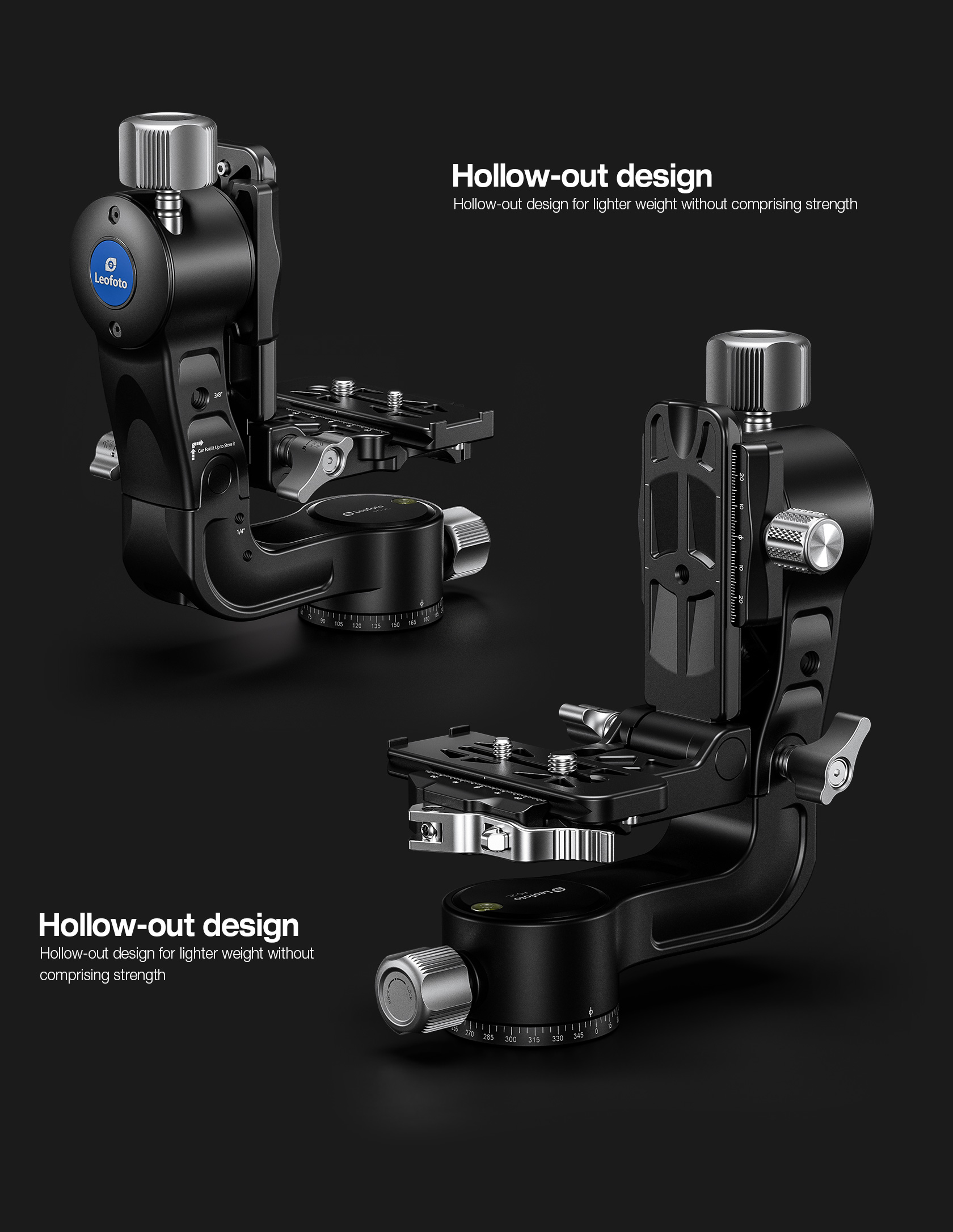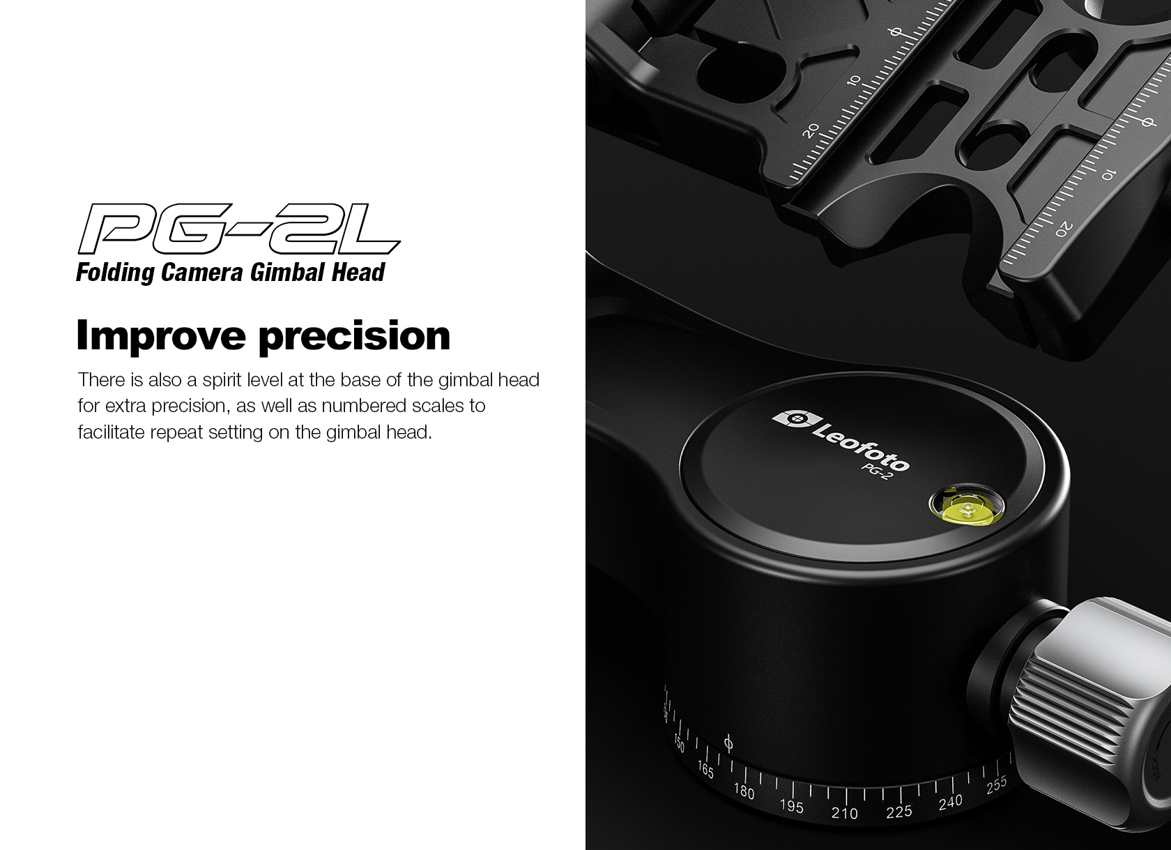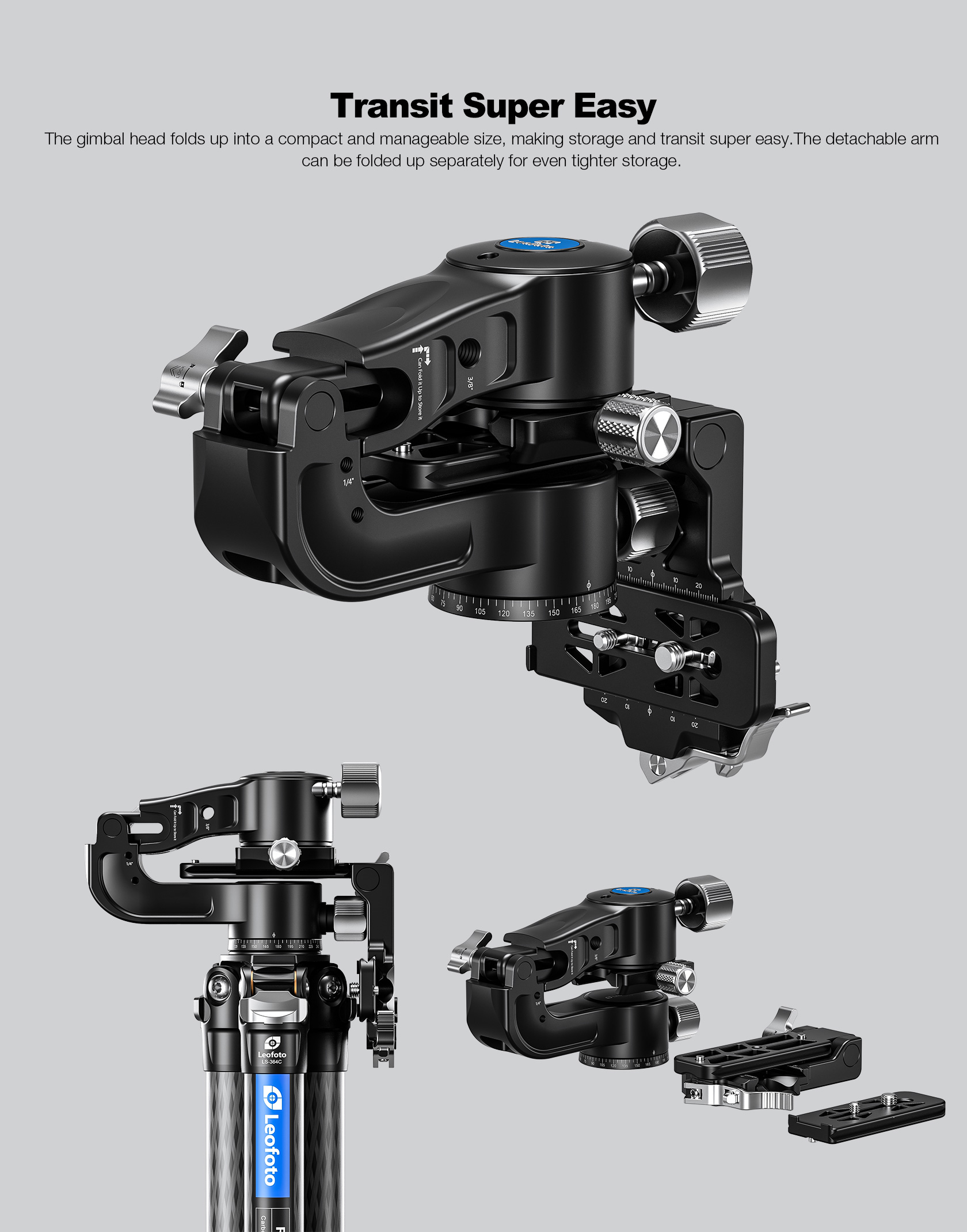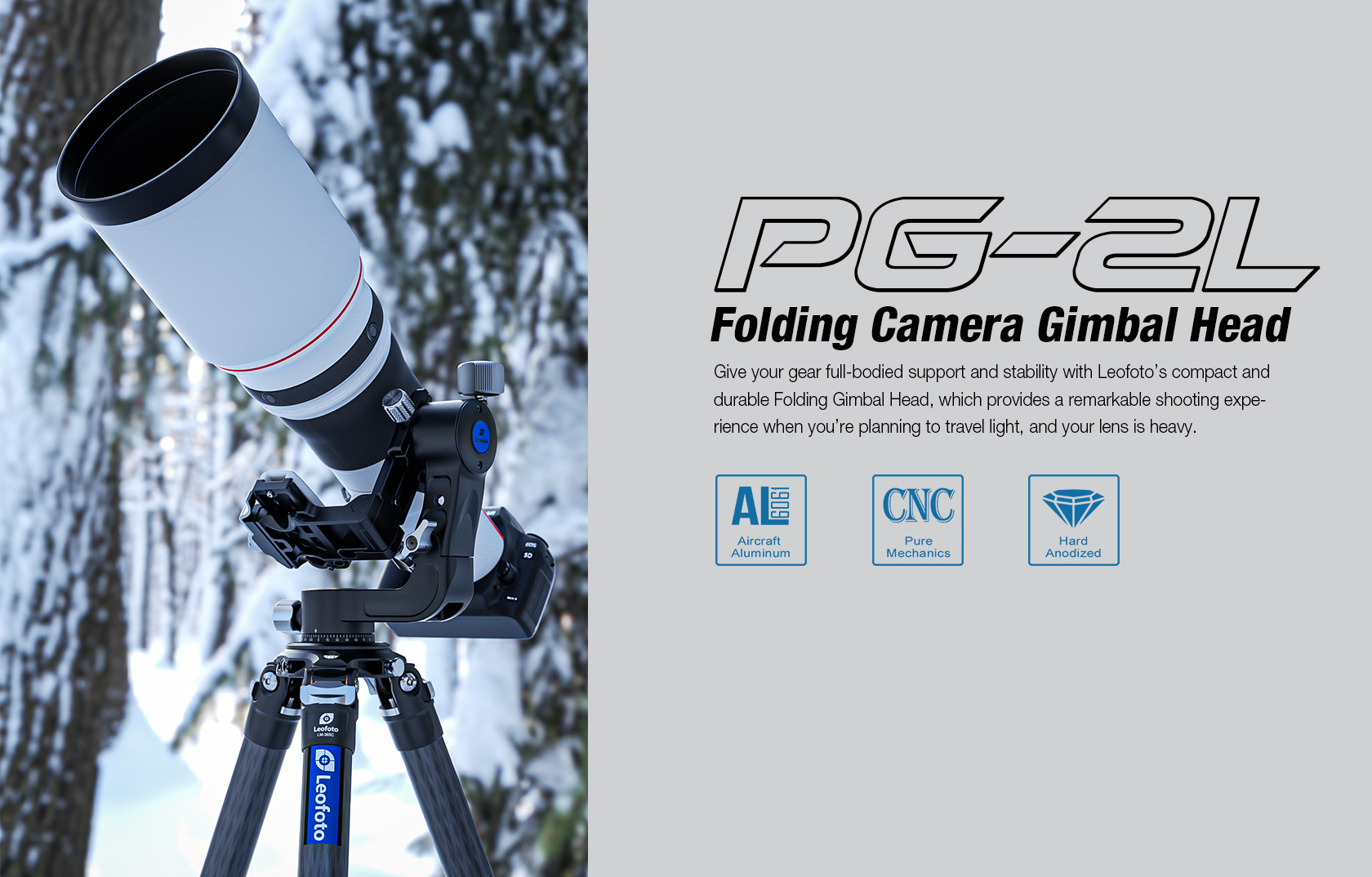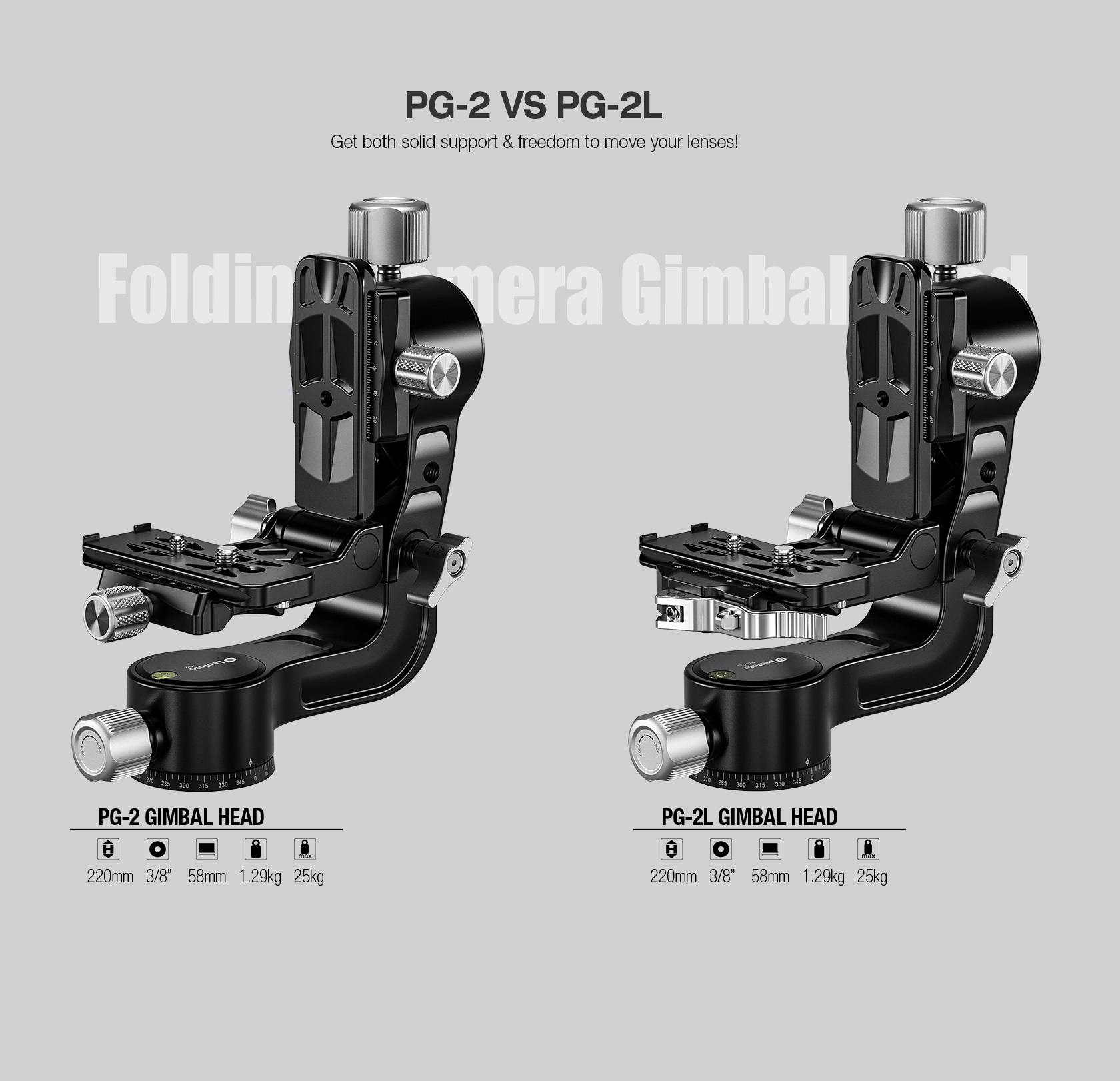 The Leofoto PG-2/PG-2L Folding Gimbal Head is constructed from T-6061 aluminum and hard anodized for maximum strength and durability. The PG-2 enables you to capture fast-moving subjects with a large and heavy telephoto lens that you otherwise could not do manually holding the lens. The arm swings back and forth and can be locked down at the required angle and the gimbal also has a bubble level on the base. The camera platform, which is Arca-type compatible, has height adjustability to help balance a telephoto lens on the head. Along the arm of the gimbal are a 3/8″ and two 1/4″ accessory sockets. The design of the PG-2/PG-2L allows for the gimbal to collapse for a more portable footprint, perfect for traveling when space is limited. The body has also been hollowed-out to optimize the weight to strength ratio.