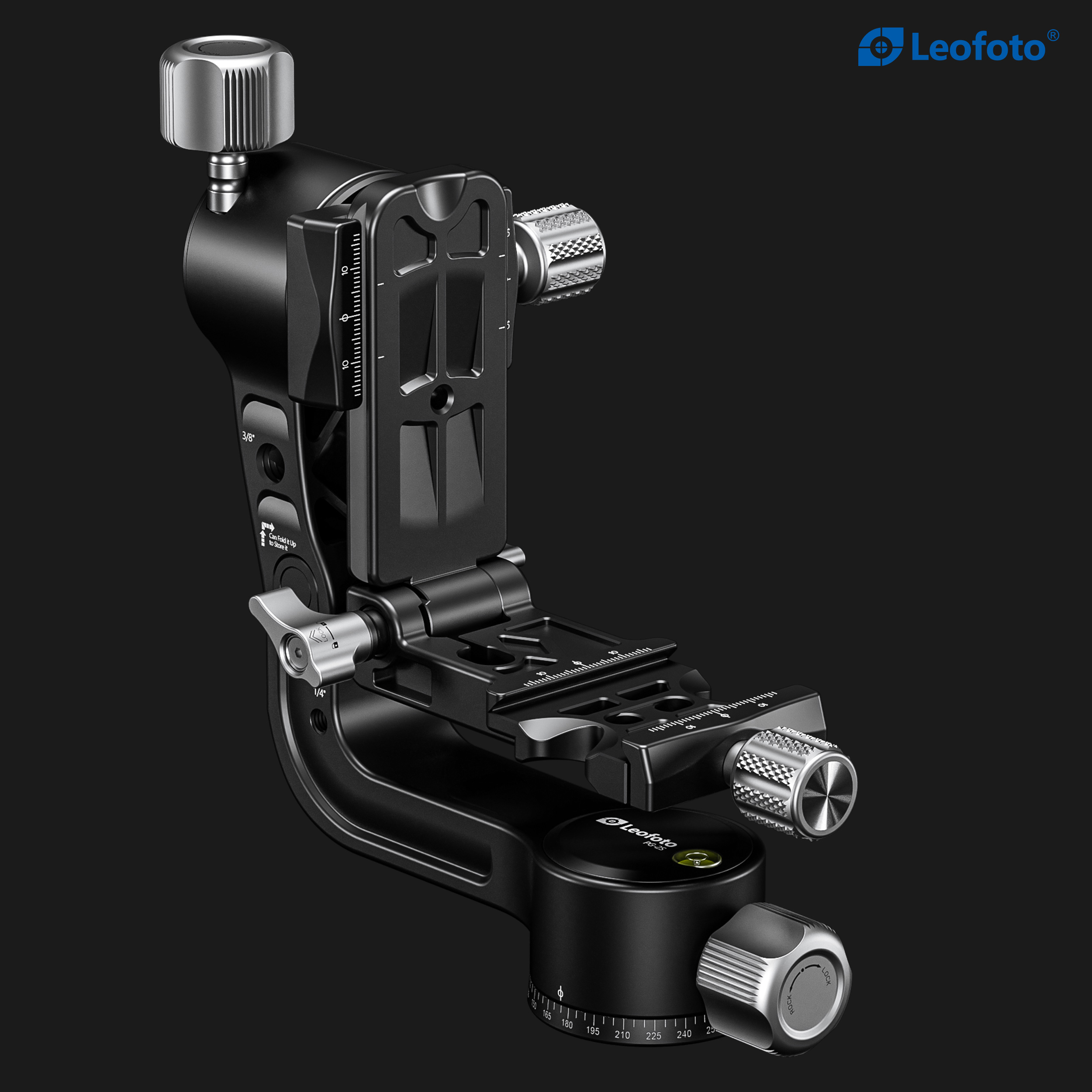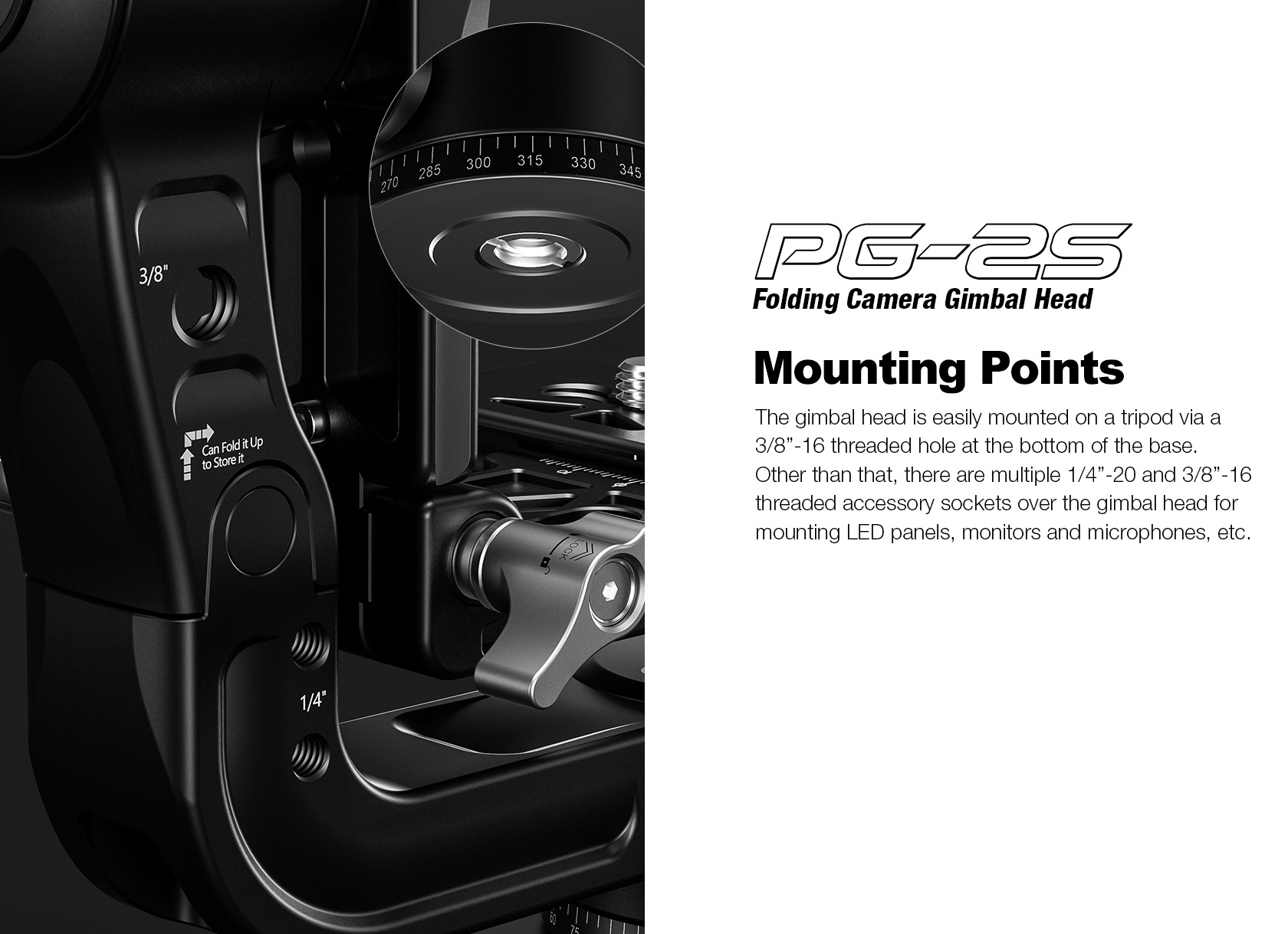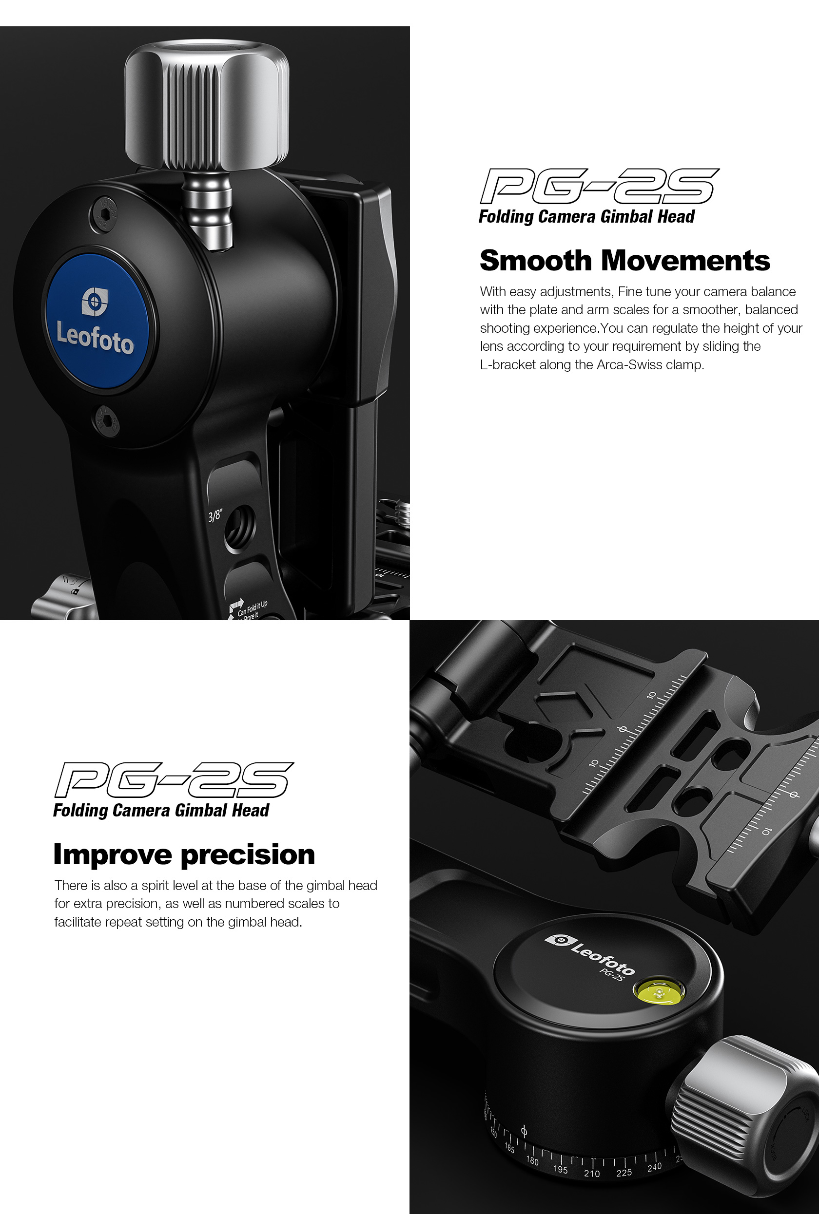 The Leofoto PG-2S Compact Mini Folding Gimbal Head is a smaller and more compact iteration of the PG-2 head, designed for enhanced portability and compact usage. It is constructed from T-6061 aluminum and hard anodized for maximum strength and durability. The PG-2S enables you to capture fast-moving subjects with a large and heavy telephoto lens that you otherwise could not do manually holding the lens. The arm swings back and forth and can be locked down at the required angle and the gimbal also has a bubble level on the base. The camera platform, which is Arca-type compatible, has height adjustability to help balance a telephoto lens on the head.  Along the arm of the gimbal are a 3/8″ and two 1/4″ accessory sockets. The design of the PG-2S allows for the gimbal to collapse for a more portable footprint, perfect for traveling when space is limited. The body has also been hollowed-out to optimize the weight to strength ratio. There is a certain stiffness designed with this model to enhance control and stability during use.
