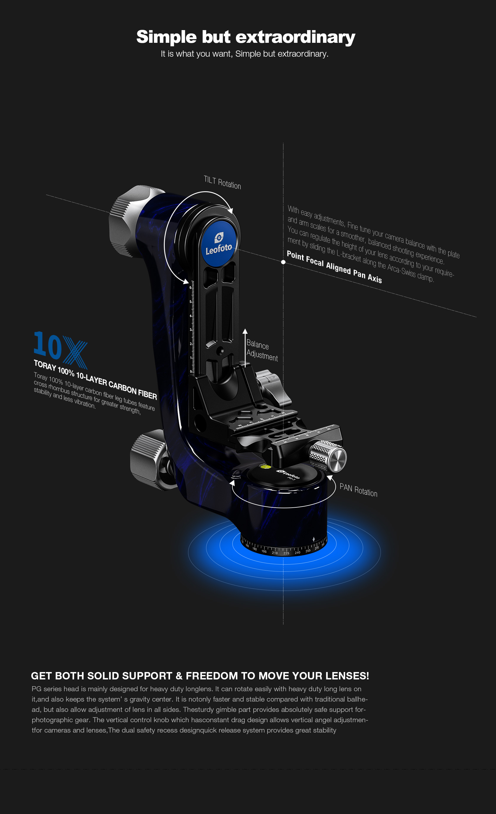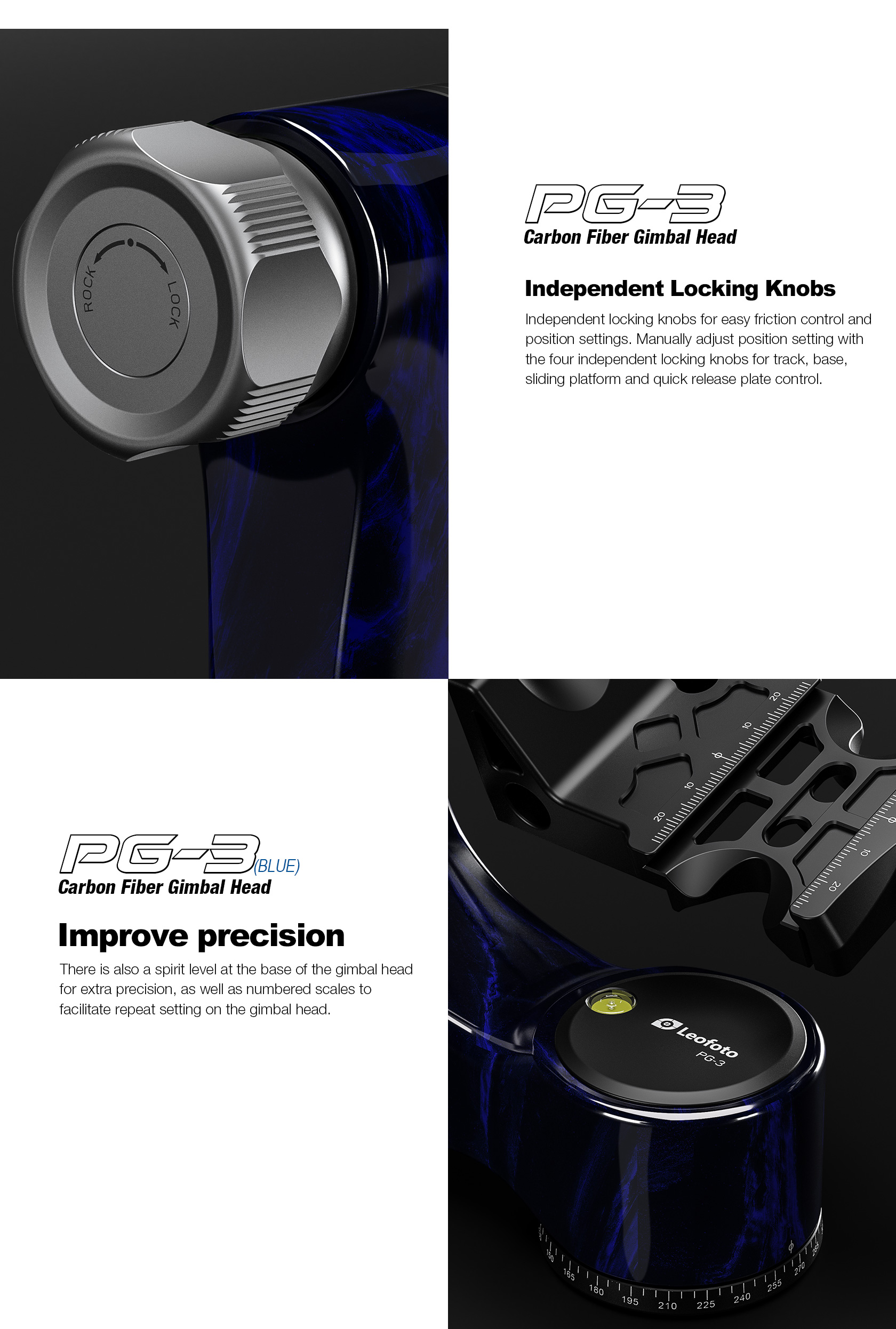 The Leofoto PG-3/L Carbon Fiber Gimbal Head is crafted from 10 layers of Toray carbon fiber, offering a lightweight yet robust gimbal setup. Its newly designed control knobs are smooth and positioned to avoid interfering with lens movement. The PG-3 allows photographers to track fast-moving subjects with large, heavy telephoto lenses, while the swinging arm can be locked at the desired angle and features a bubble level on the base. The Arca-type compatible camera platform includes height adjustability for precise lens balance, and the printed scale on the swing arm enables repeatable setups. A redesigned Arca plate optimized for long lenses supports both 1/4” and 3/8” screws, making the PG-3 ideal for portability without compromising performance.