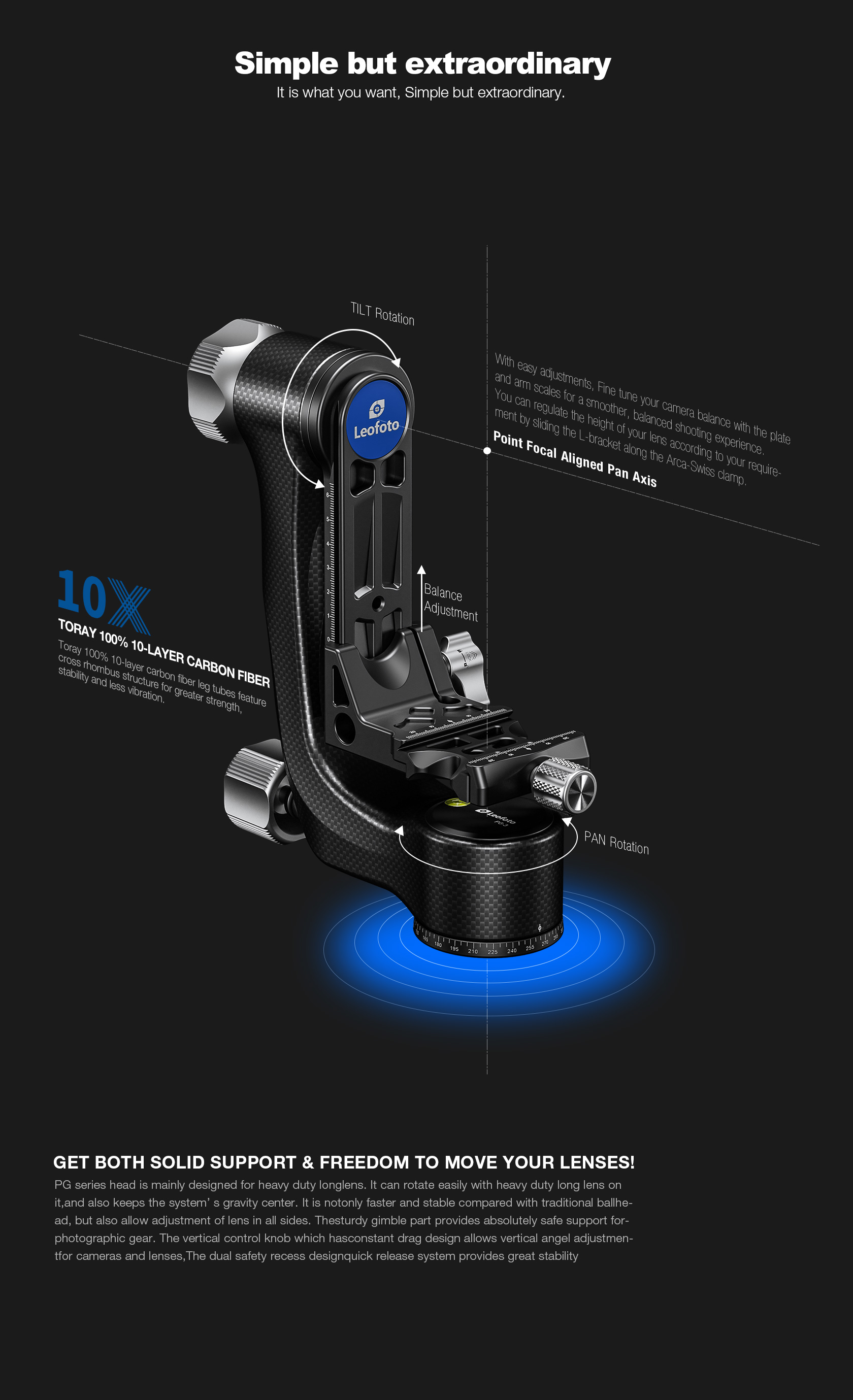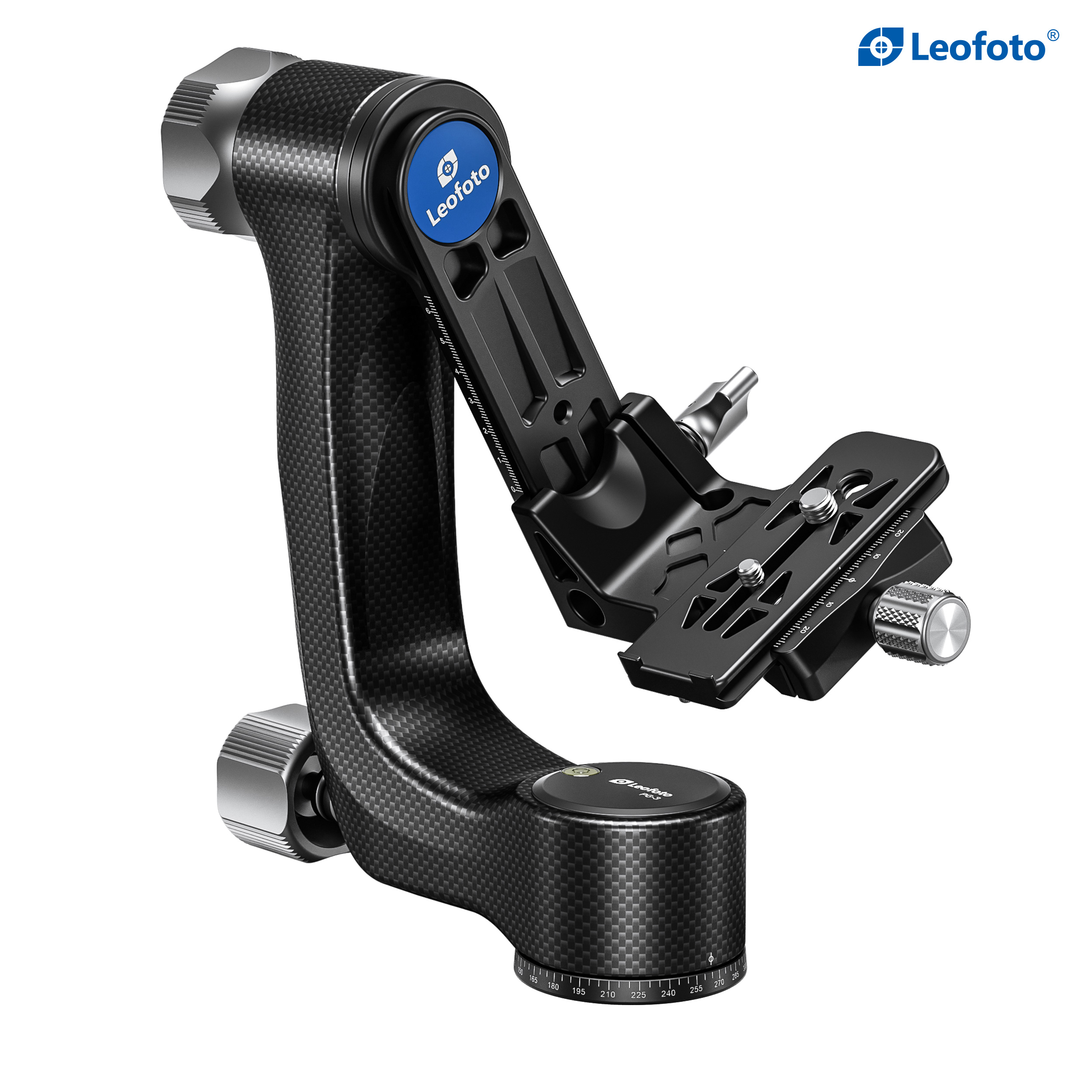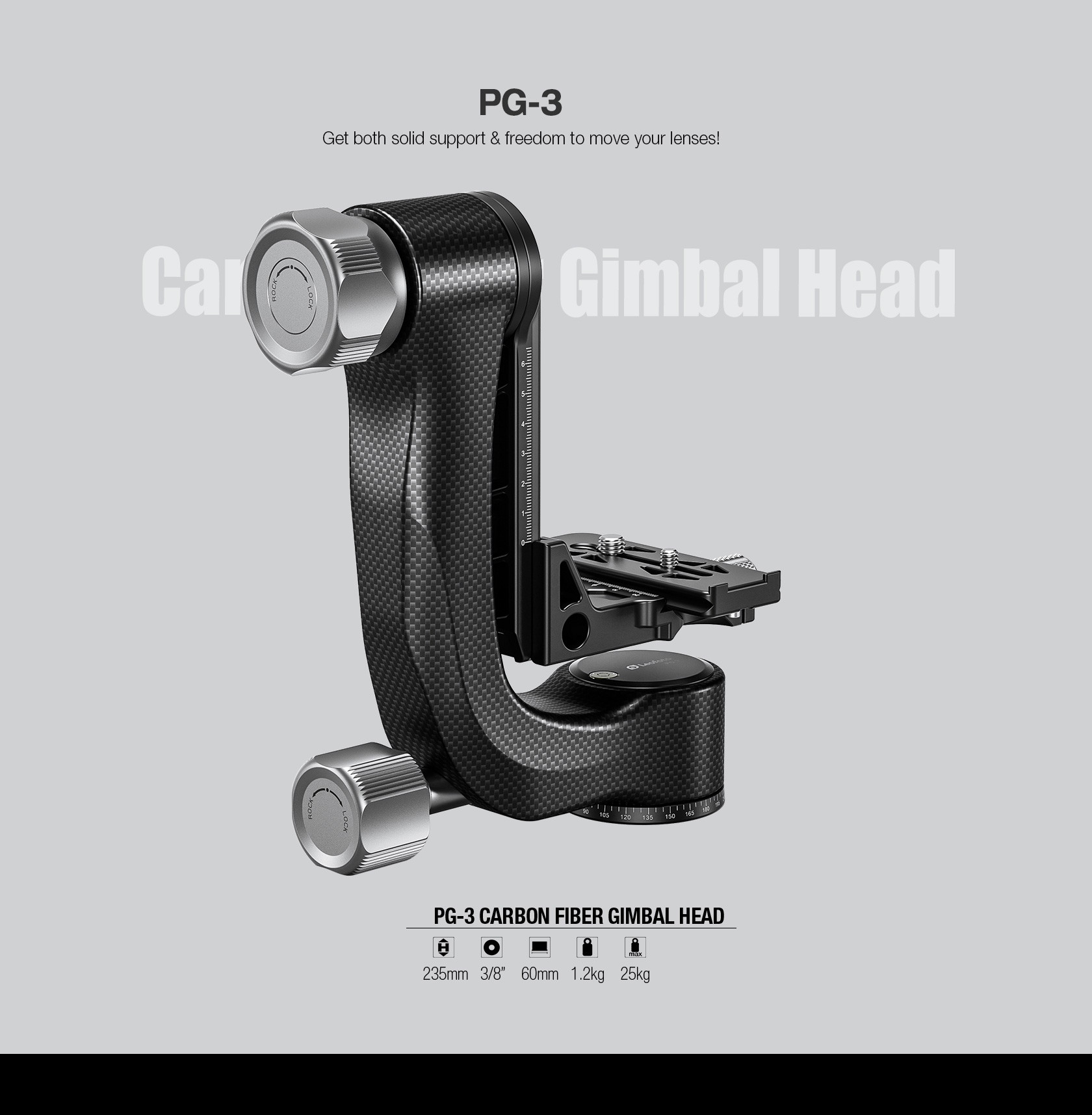 The Leofoto PG-3/L Carbon Fiber Gimbal Head is crafted from 10 layers of Toray carbon fiber, offering a lightweight yet robust gimbal setup. Its newly designed control knobs are smooth and positioned to avoid interfering with lens movement. The PG-3 allows photographers to track fast-moving subjects with large, heavy telephoto lenses, while the swinging arm can be locked at the desired angle and features a bubble level on the base. The Arca-type compatible camera platform includes height adjustability for precise lens balance, and the printed scale on the swing arm enables repeatable setups. A redesigned Arca plate optimized for long lenses supports both 1/4” and 3/8” screws, making the PG-3 ideal for portability without compromising performance.