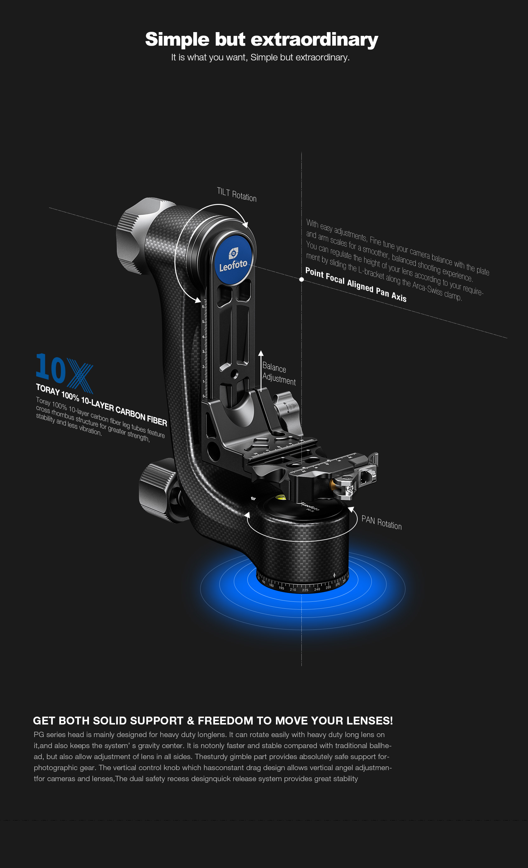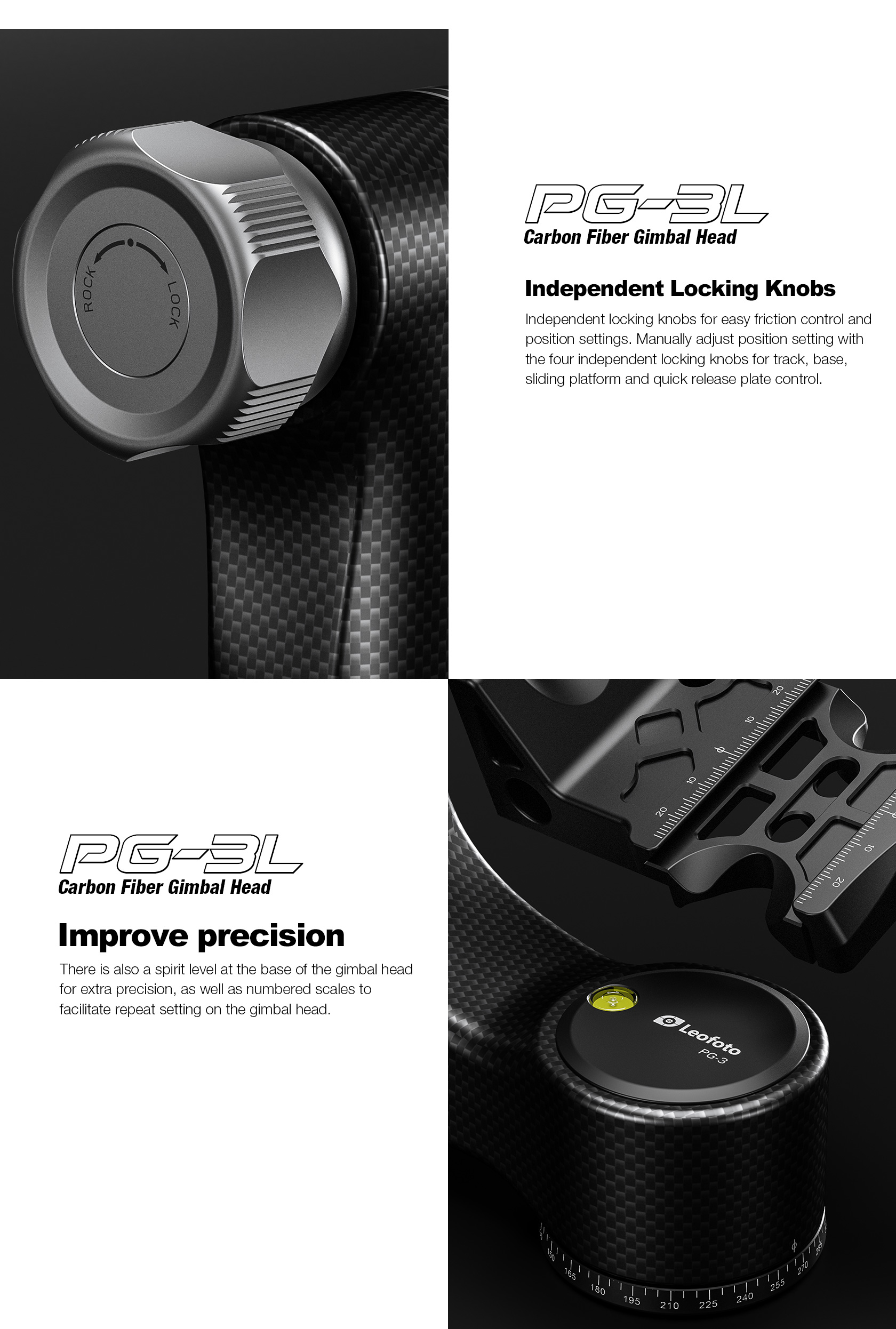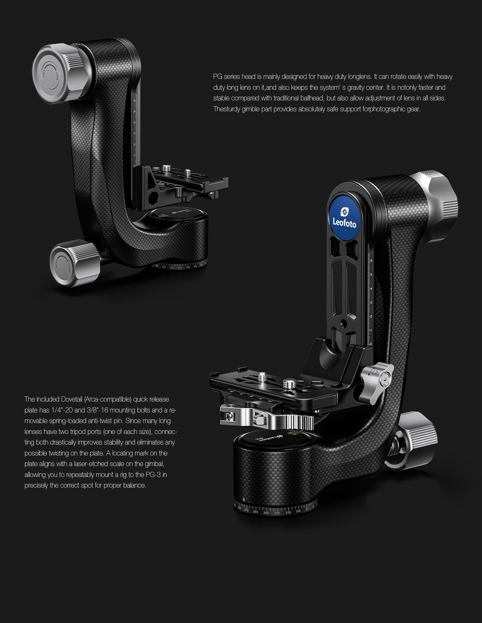 The Leofoto PG-3/L Carbon Fiber Gimbal Head is crafted from 10 layers of Toray carbon fiber, offering a lightweight yet robust gimbal setup. Its newly designed control knobs are smooth and positioned to avoid interfering with lens movement. The PG-3 allows photographers to track fast-moving subjects with large, heavy telephoto lenses, while the swinging arm can be locked at the desired angle and features a bubble level on the base. The Arca-type compatible camera platform includes height adjustability for precise lens balance, and the printed scale on the swing arm enables repeatable setups. A redesigned Arca plate optimized for long lenses supports both 1/4” and 3/8” screws, making the PG-3 ideal for portability without compromising performance.
