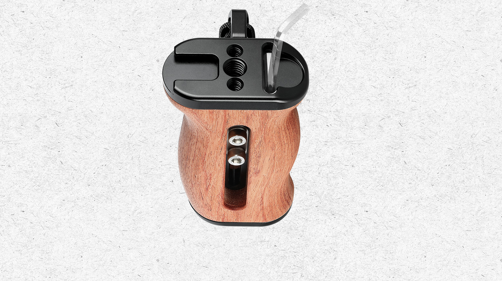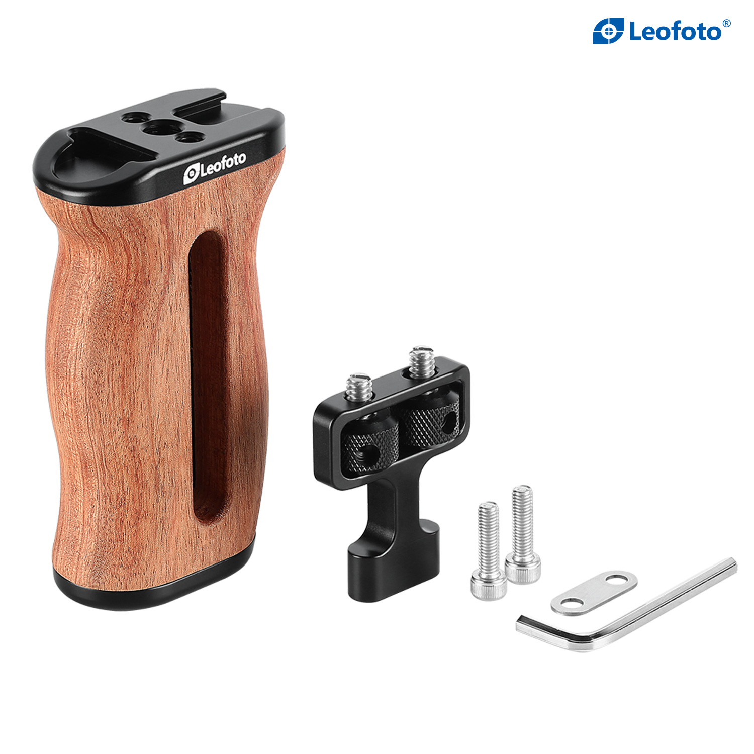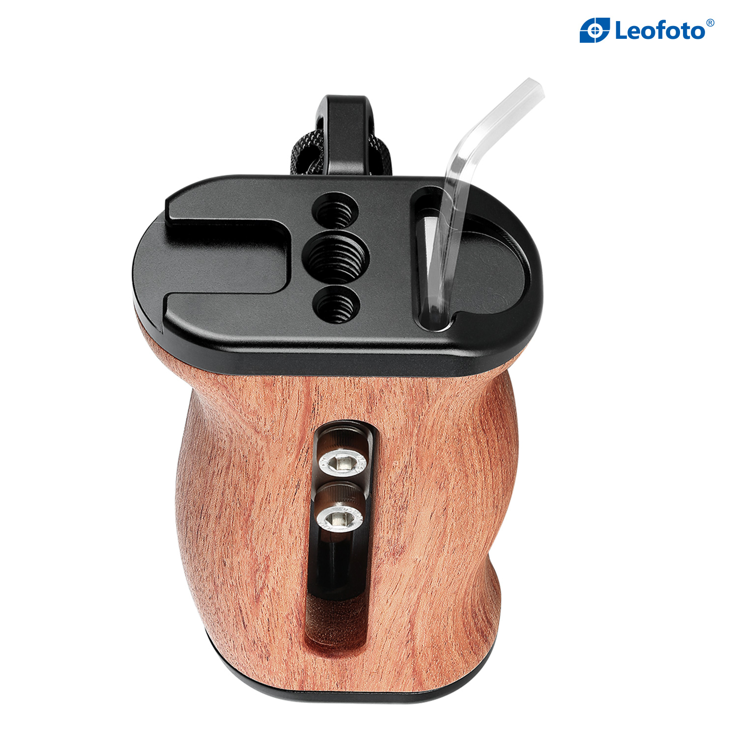 A comfortable grip with a unique Brazilian rosewood grain pattern, the Leofoto Rosewood Handgrip can be attached to most cages with 1/4″-20 mounting threads on the side. The handgrip can be used on either the right or left side by adjusting the orientation of the mounting bracket. The mounting screws are set into knurled knobs that allow you to finger-tighten the mounting screws to your cage.