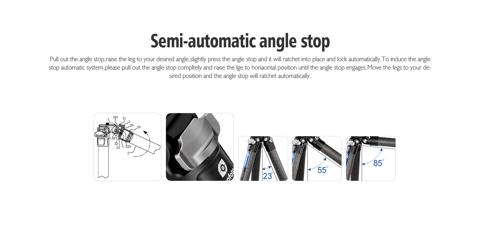 * Tripods must occasionally withstand tremendous bending and torsion loads. It is crucial that the leg angle stops and all other structural joints are well supported. Leofoto offset leg joints fully support the leg angle stops allowing loads to be transferred straight through the strongest members of the tripod. This also means the tripod is more compact when collapsed
