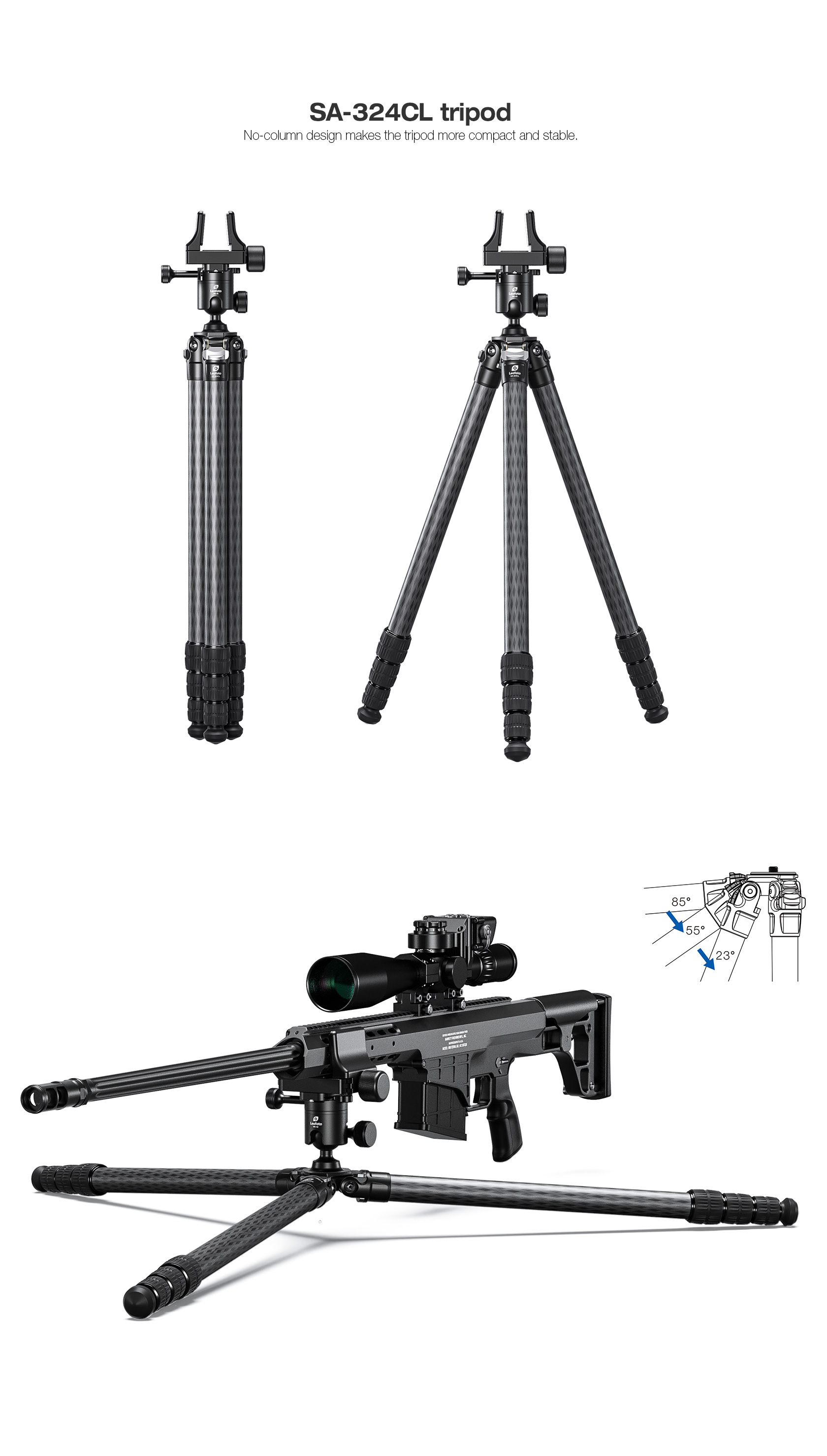 The Leofoto SA Series tripods are one of the most compact collapsed setups on the market with a perfectly balanced weight to strength ratio. The angle stop design has also been improved from the standard pull tab to a knurled bar which allows the user to adjust the angles with only one hand as opposed to two. The SA Series offers unparalleled versatility, built as a hunter’s companion who also enjoys long days on the range, but most requested by military, law enforcement, competitive shooters or those simply looking for one of the most compact and reliable shooting supports on the market. The SA Series tripods offer maximum rigidity, capable of supporting non-traditional shooting positions with a heavy load capacity. These tripods feature three angle stop positions to increase shooting capabilities and a compact design which maintains a small footprint, creating a tripod setup which is extremely easy to pack and carry on the go.