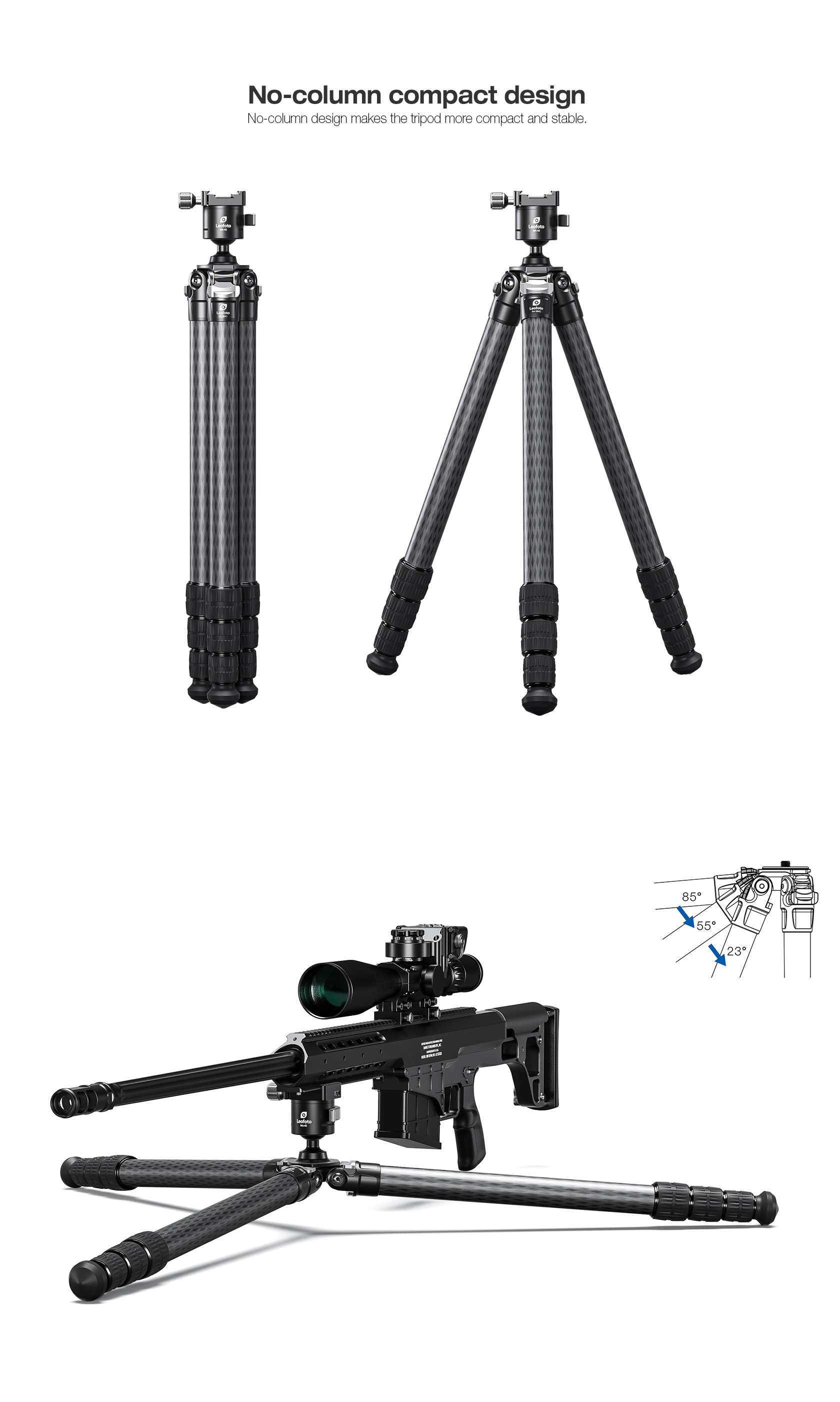 The Leofoto SA Series tripods are one of the most compact collapsed setups on the market with a perfectly balanced weight to strength ratio. The angle stop design has also been improved from the standard pull tab to a knurled bar which allows the user to adjust the angles with only one hand as opposed to two. The SA Series offers unparalleled versatility, built as a hunter’s companion who also enjoys long days on the range, but most requested by military, law enforcement, competitive shooters or those simply looking for one of the most compact and reliable shooting supports on the market. The SA Series tripods offer maximum rigidity, capable of supporting non-traditional shooting positions with a heavy load capacity. These tripods feature three angle stop positions to increase shooting capabilities and a compact design which maintains a small footprint, creating a tripod setup which is extremely easy to pack and carry on the go.