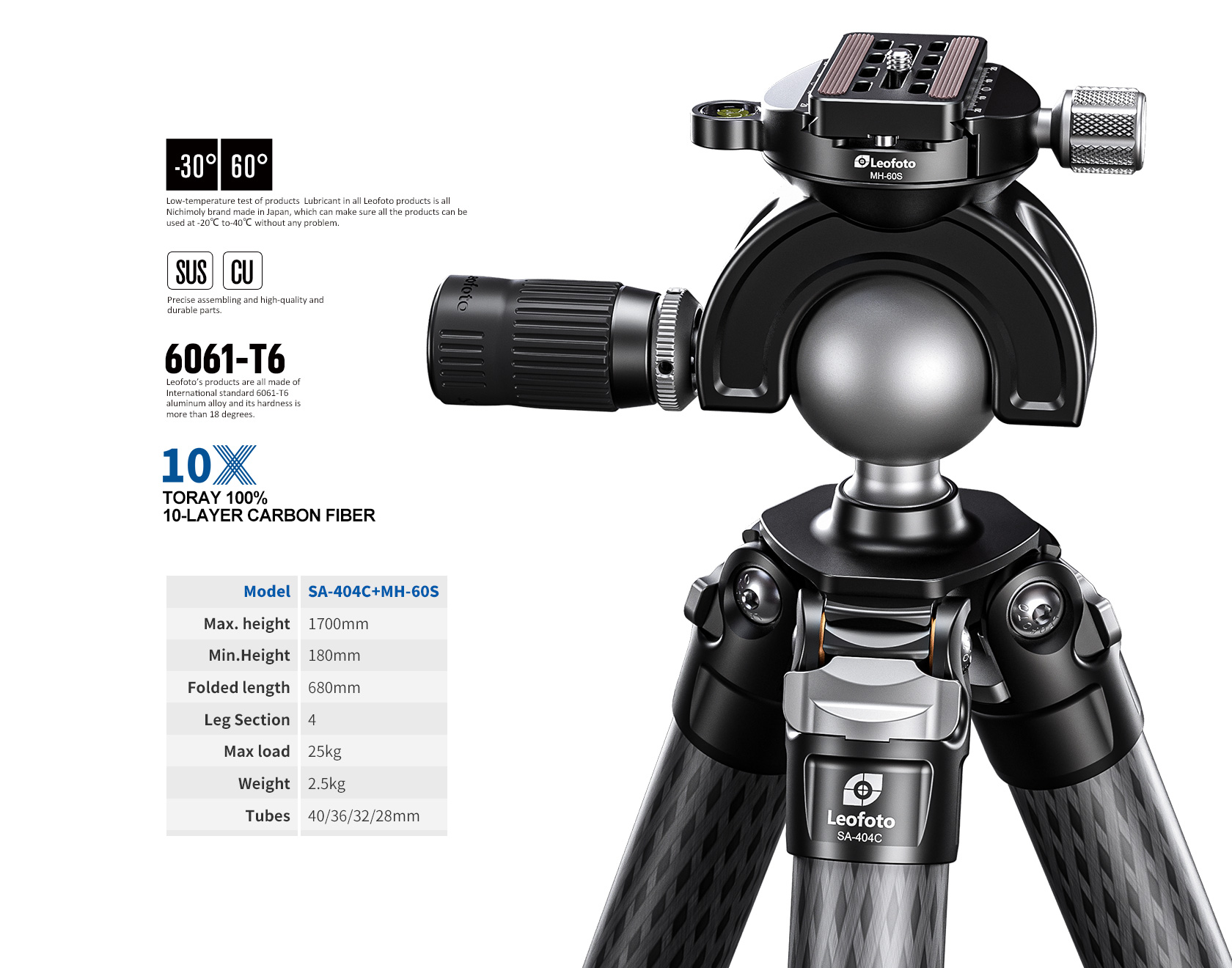 Leofoto SA-404C+MH-60S Professional carbon fiber Tripod