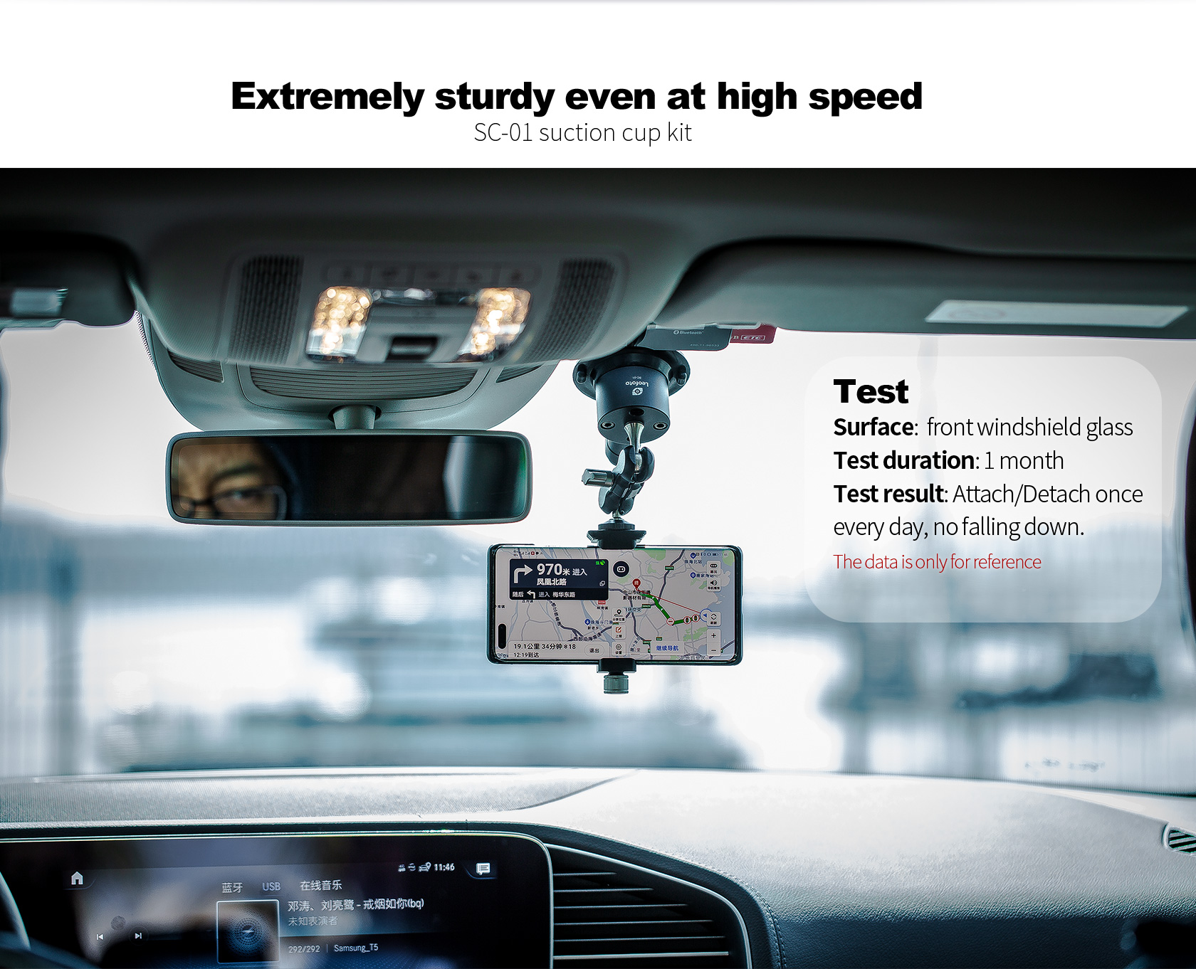 Mount a smartphone on a vehicle for motion shots with the Leofoto SC-01 Suction Cup Mounting Base. The suction cup mounts onto a flat, clean, non-porous surface and supports up to a maximum 55lb load.