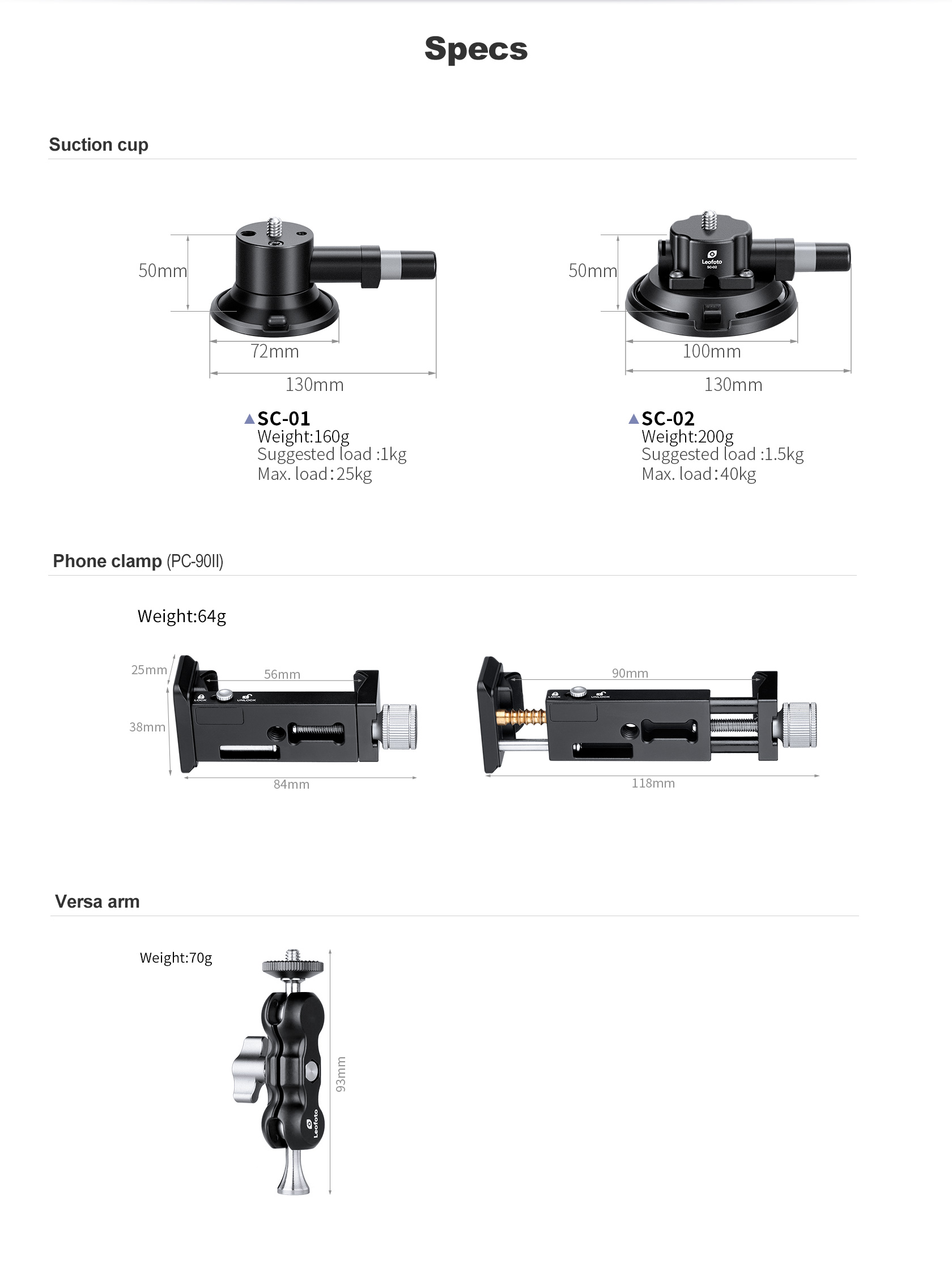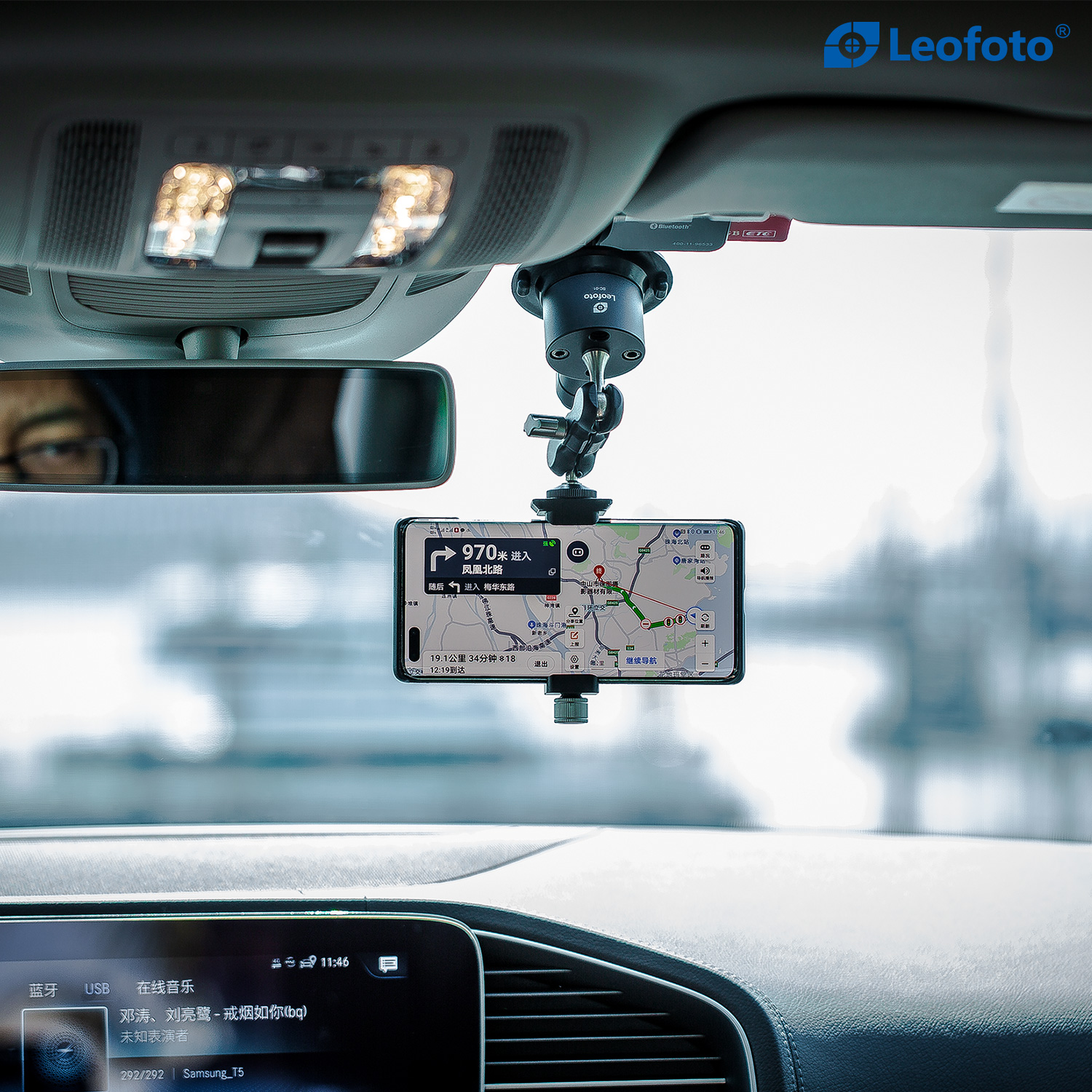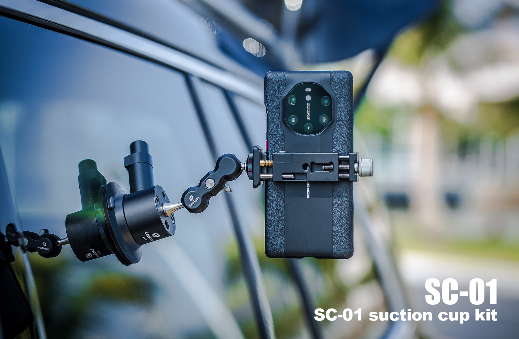 Mount a smartphone on a vehicle for motion shots with the Leofoto SC-01 Suction Cup Mounting Kit. The kit consists of a strong SC-01 suction cup, an articulating versa magic-arm, and a PC-90II smartphone clamp. The suction cup mounts onto a flat, clean, non-porous surface and supports up to a maximum 55lb load.
