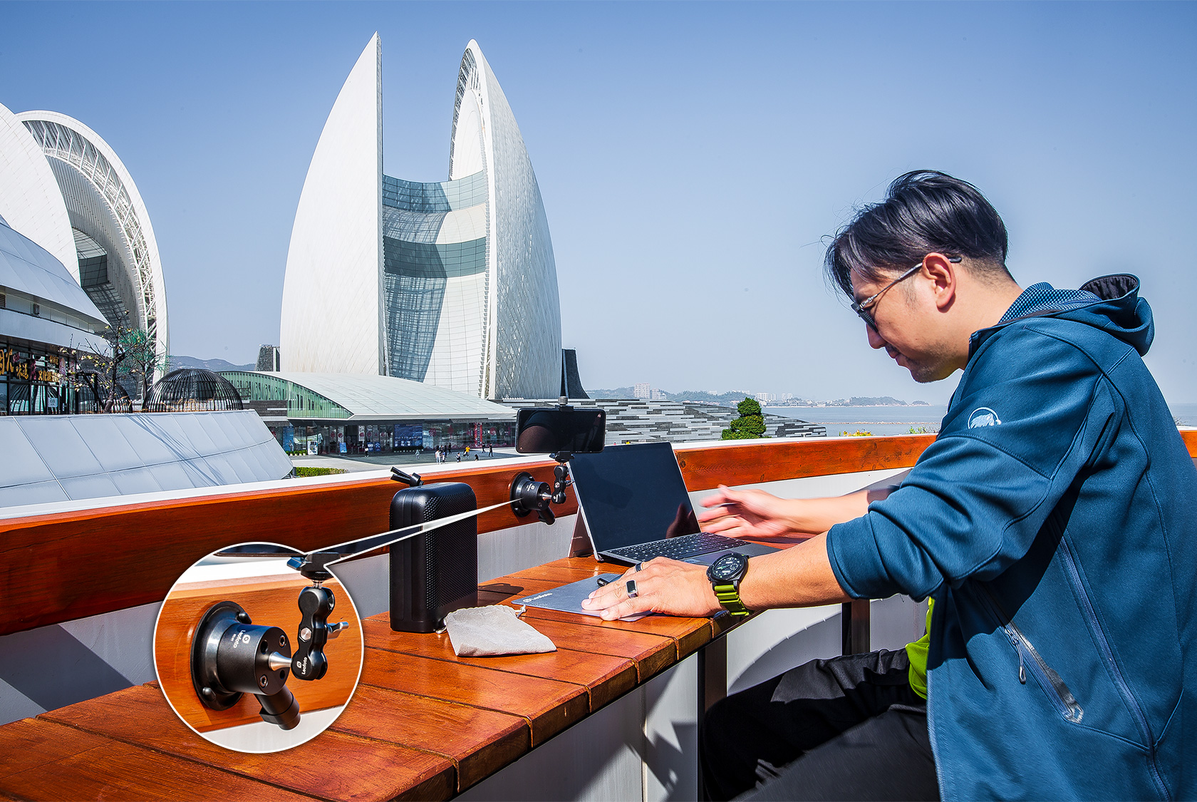 The Leofoto AM Series Versa Magic-Arm has a 1/4″-20 screw on one end and a 1/4″-20 thread on the other end. It mounts onto the suction cup and the smartphone clamp mounts onto the top of the arm.
