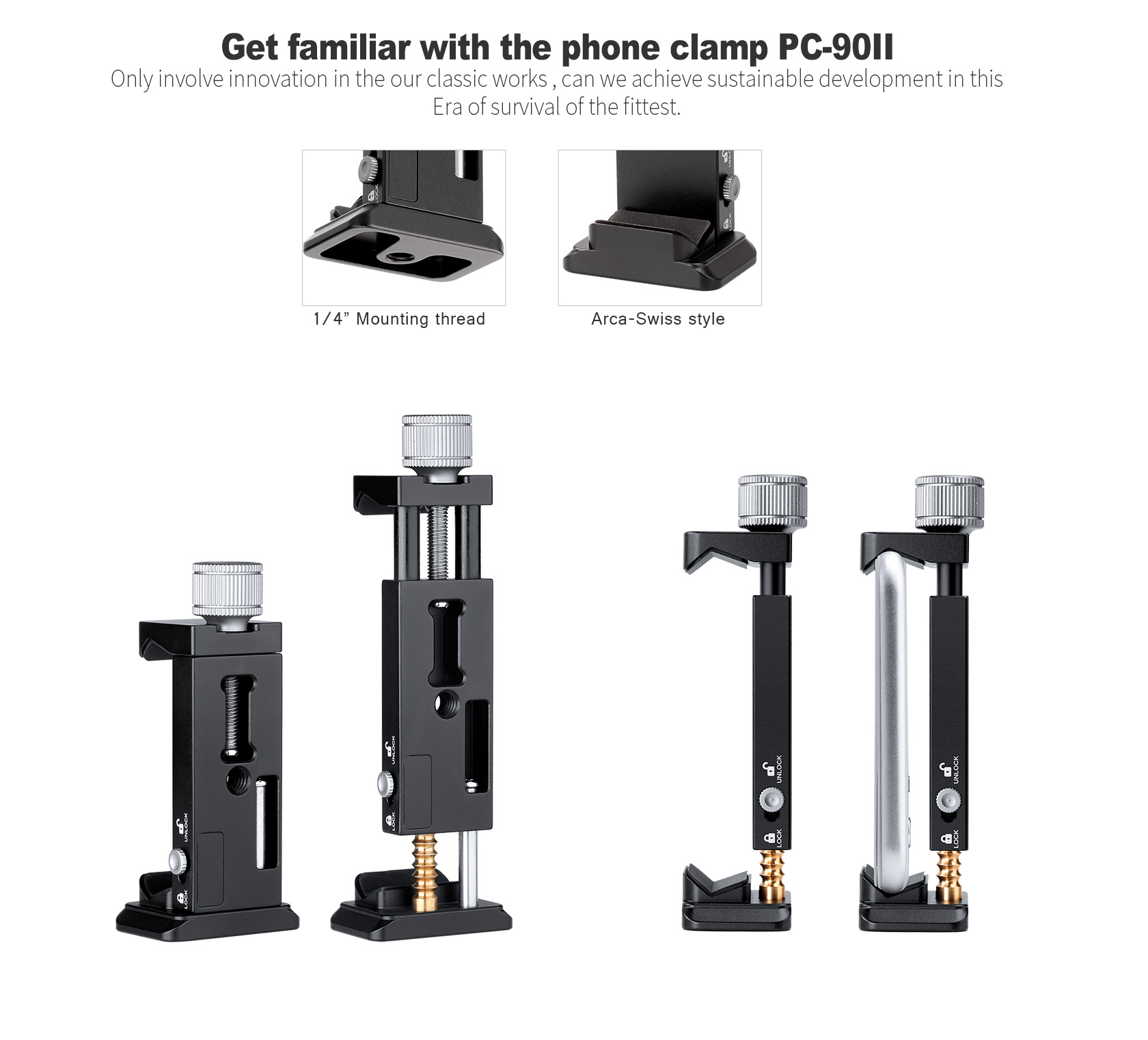 The Leofoto PC-90II is an adjustable smartphone clamp that allows you to securely mount your phone onto a tripod or other support system. The height of the phone clamp can be adjusted from 56-90mm / 2.2-3.5 inches, with a slider on the side that locks the height in place.