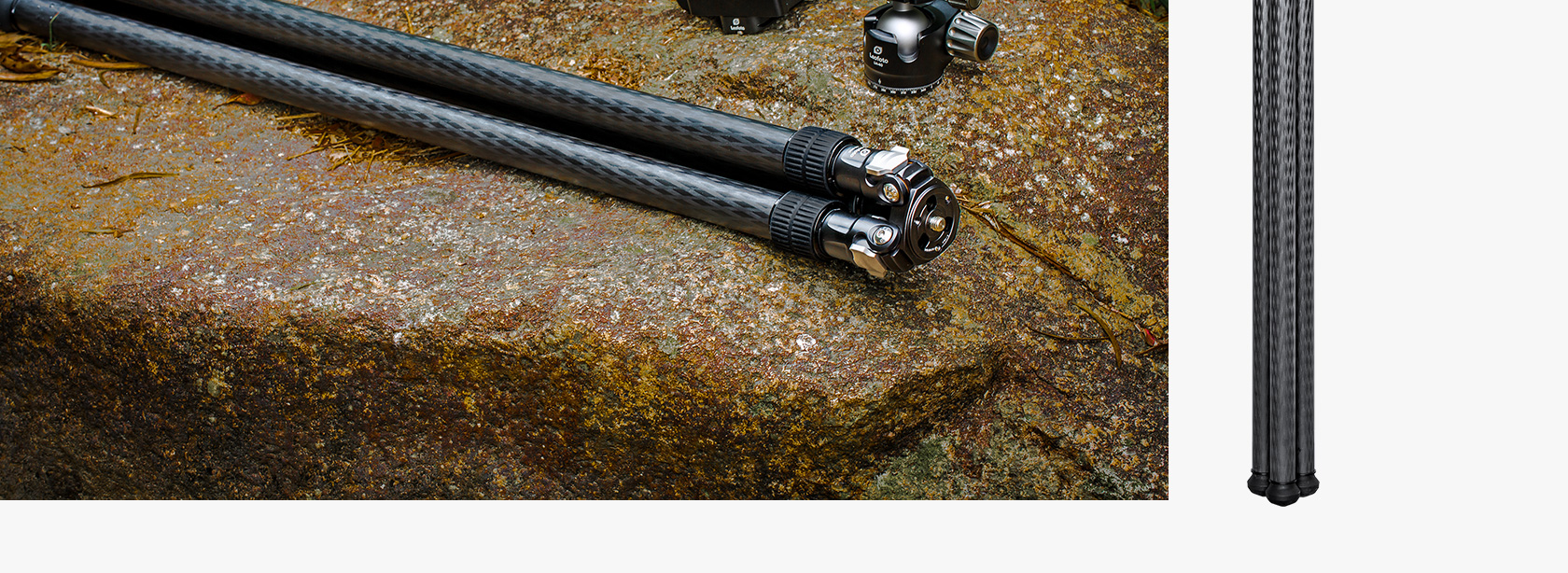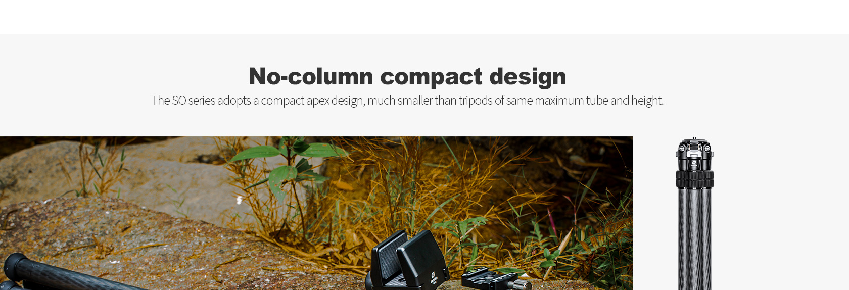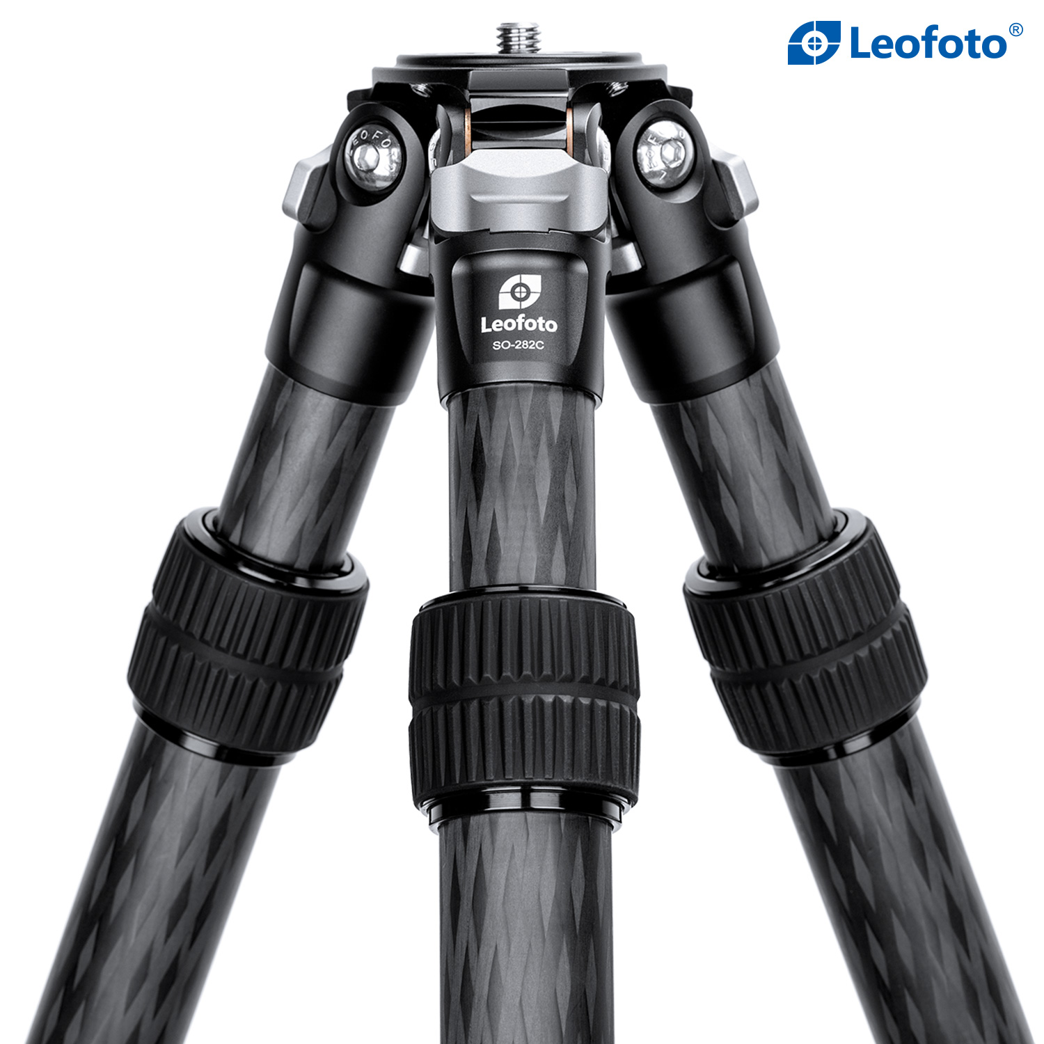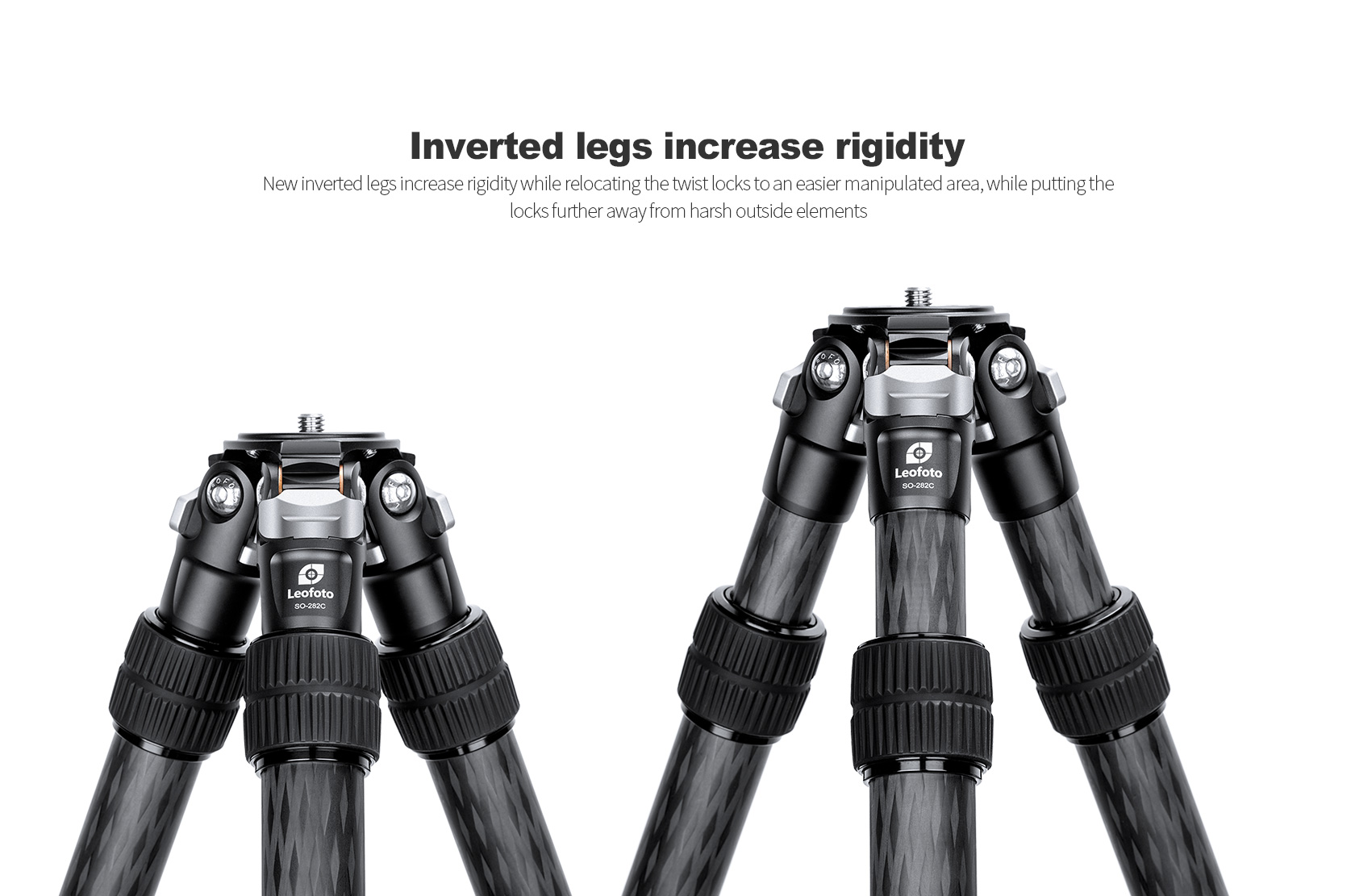 The carbon fiber legs are inverted, with the widest tube at the bottom, for added stability and incredibly quick full collapse and deployment. The legs feature twist-lock joints, individual spread and three available locking positions making it possible to achieve the proper level even when on uneven terrain. This lightweight tripod has a fixed apex/platform which is more compact than the larger SO series tripods.