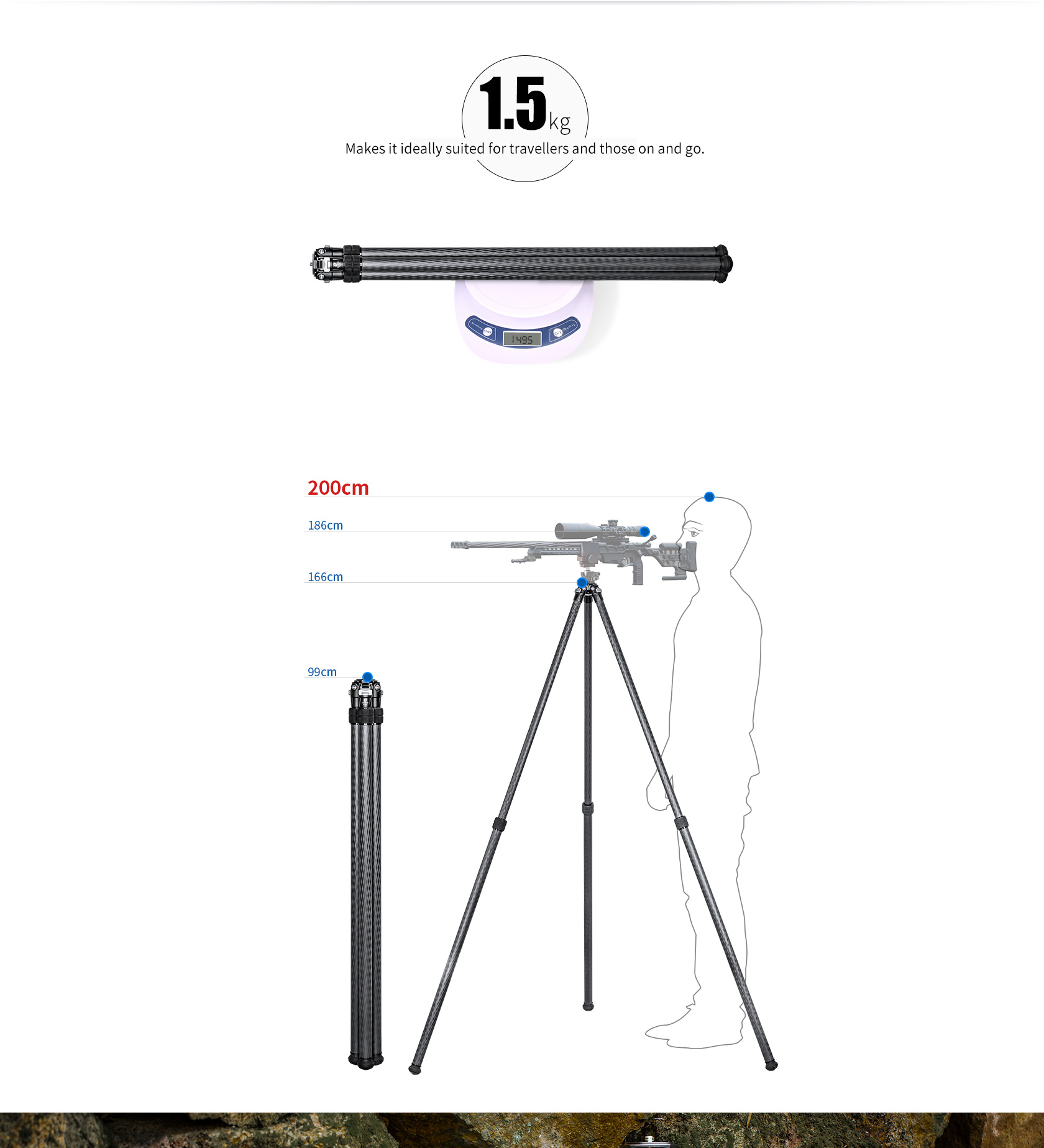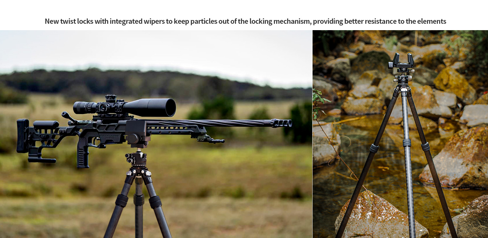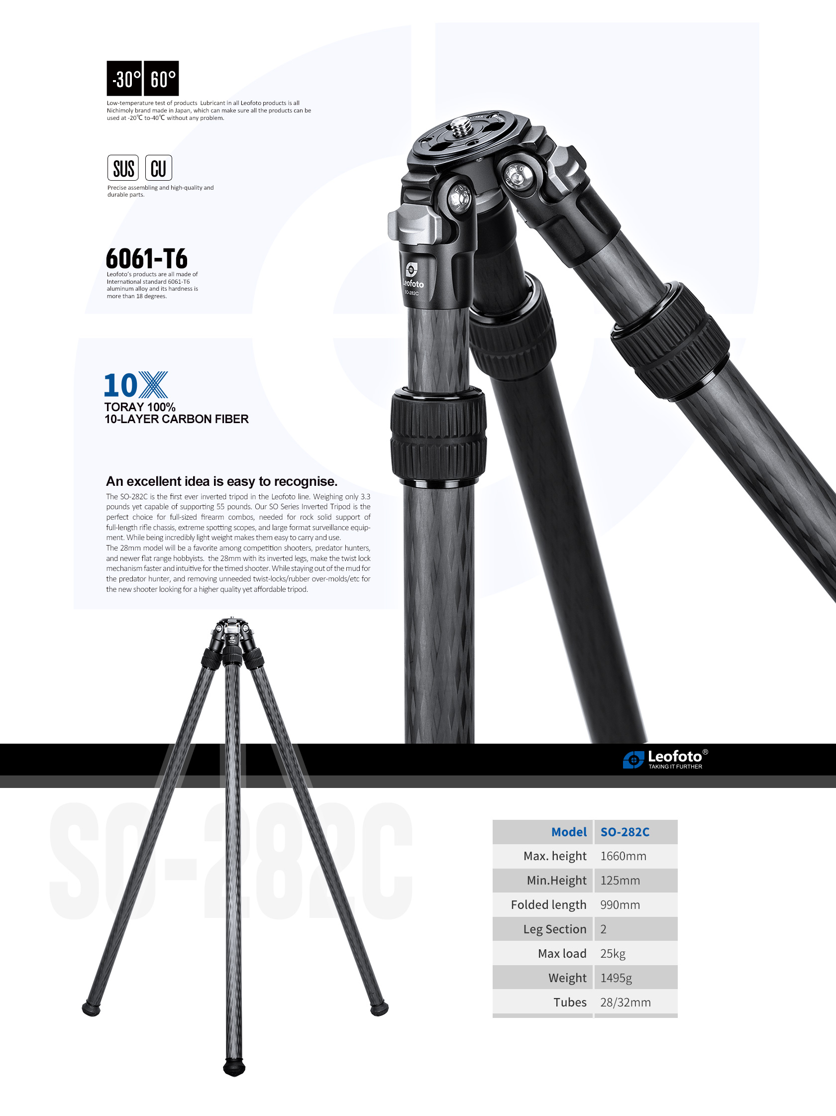 The Leofoto SO series 2-Section Inverted Carbon Fiber Tripod (FIXED Apex/Platform) is an excellent choice for full-sized firearm combos that need rock-solid support for a full-length rifle chassis with a spotting scope. Available in two sizes for your convenience: a small, portable option and a full-size version for all your needs. The robust load capacity also makes it suitable for use with extreme spotting scopes, cameras, and large format surveillance equipment. The new “X” version features a knurled-bar angle stop design which allows for one handed operation as well as leg tubes which do not cross.