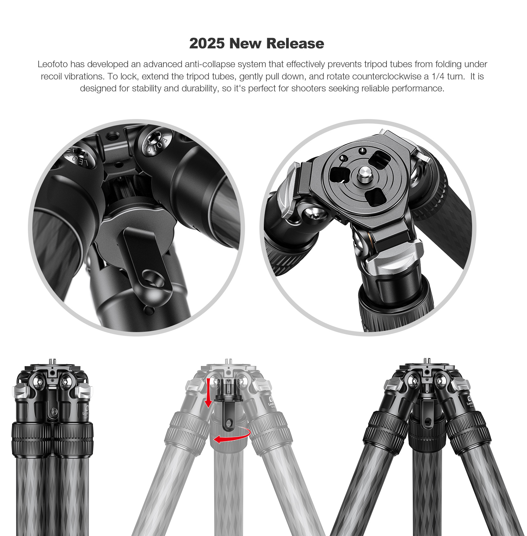 The carbon fiber legs are inverted, with the widest tube at the bottom, for added stability and incredibly quick full collapse and deployment. The legs feature twist-lock joints, individual spread and three available locking positions making it possible to achieve the proper level even when on uneven terrain. This lightweight tripod has a fixed apex/platform which is more compact than the larger SO series tripods.