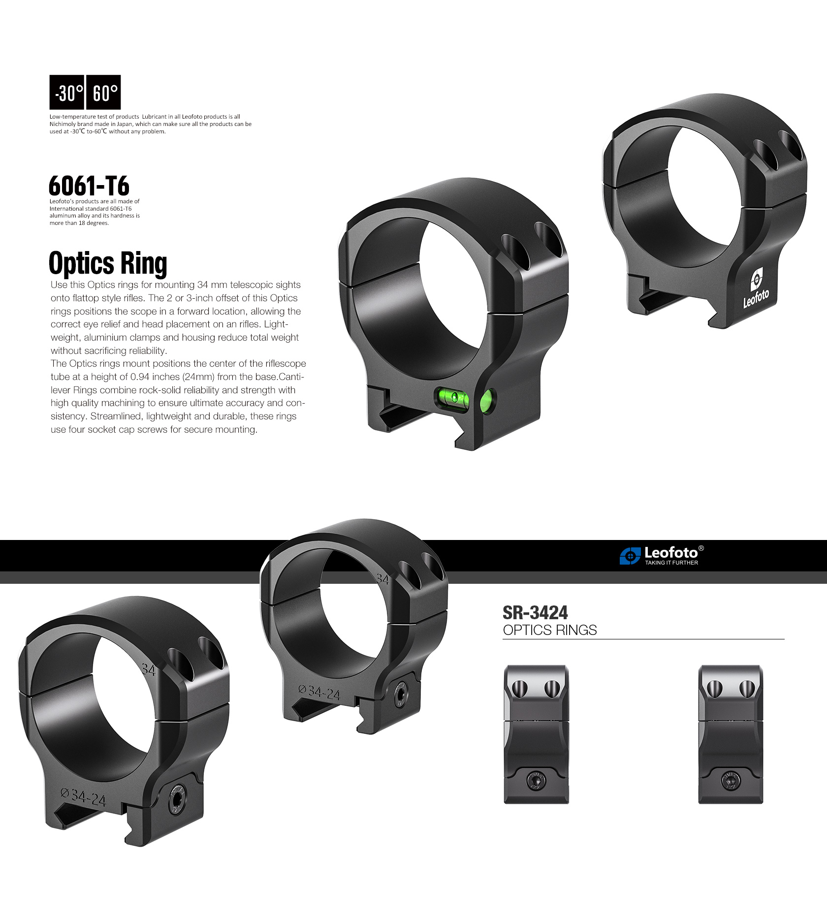 Use this Optics rings for mounting 34 mm telescopic sights onto flattop style rifles. The 2 or 3-inch offset of this Optics rings positions the scope in a forward location, allowing the correct eye relief and head placement on an rifles. Lightweight, aluminium clamps and housing reduce total weight without sacrificing reliability. The Optics rings mount positions the center of the riflescope tube at a height of 0.94 inches (24mm) from the base.Cantilever Rings combine rock-solid reliability and strength with high quality machining to ensure ultimate accuracy and consistency. Streamlined, lightweight and durable, these rings use four socket cap screws for secure mounting.