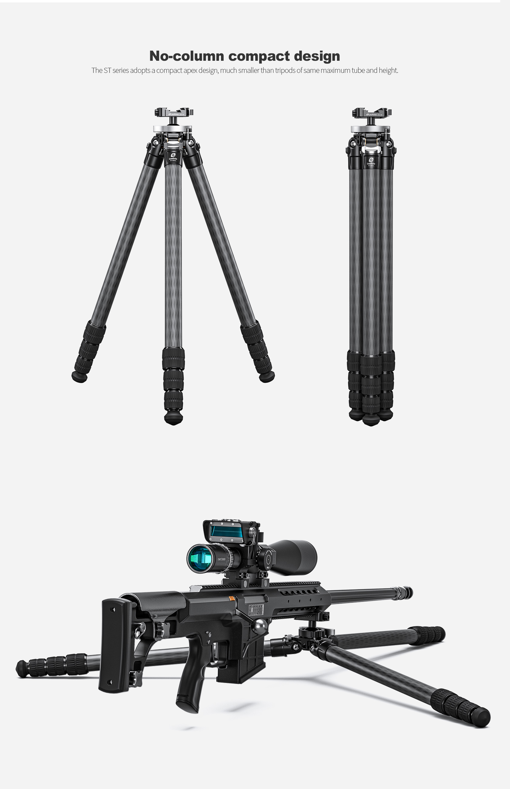 The Leofoto ST Series Rifle Tripods are one of the most compact apex setups on the market with a perfectly balanced weight to strength ratio. The ST Series features a knob-controlled clamp, with the option to choose either a dual Arca & Picatinny clamp or an Arca-only clamp, along with a knob-controlled, integrated ball head. These tripods provide maximum rigidity, making them ideal for supporting non-traditional shooting positions. They also feature three angle stop positions to increase shooting position capabilities and a compact design which maintains a small footprint, creating a tripod setup which is extremely easy to pack and carry on the go.