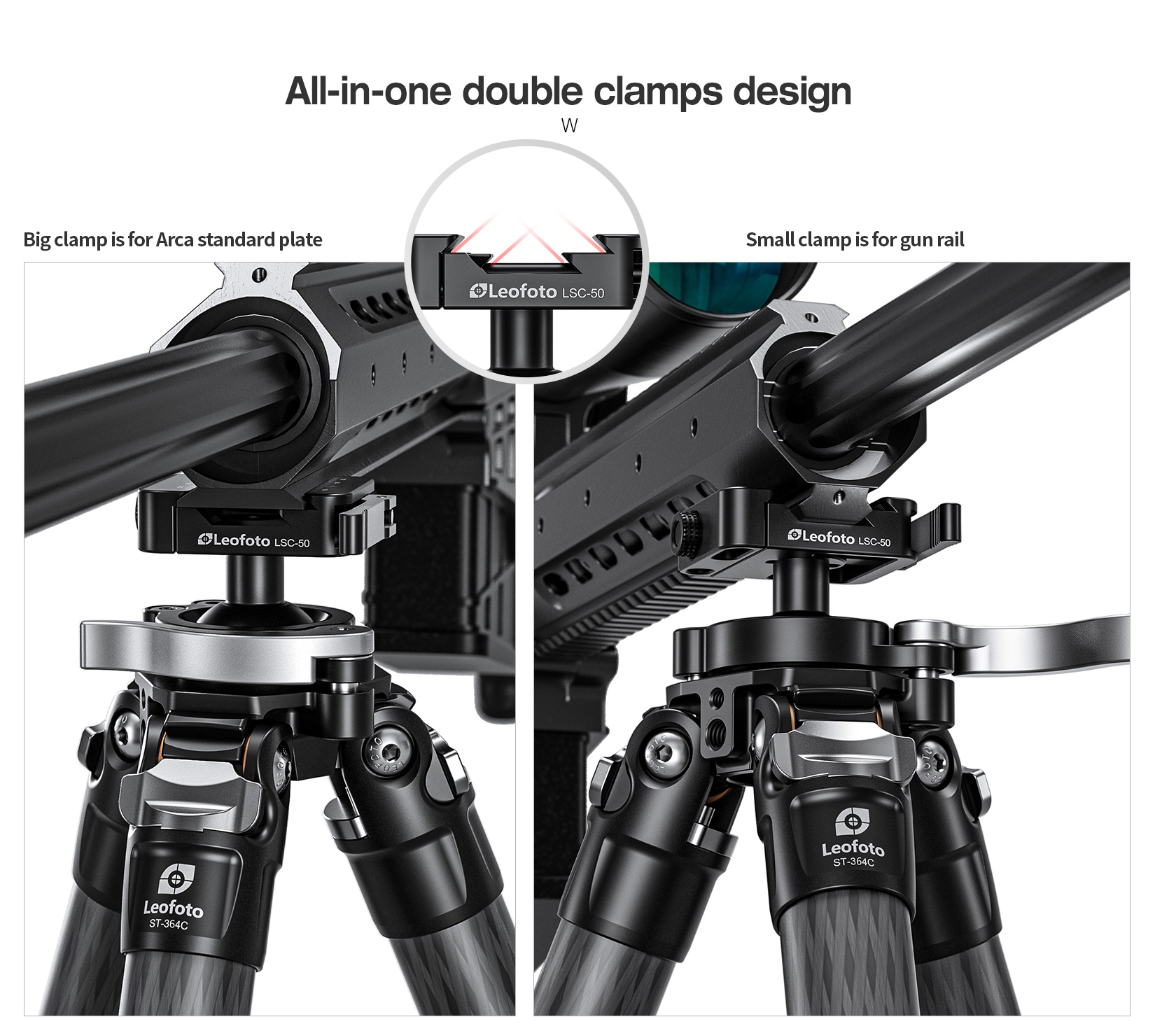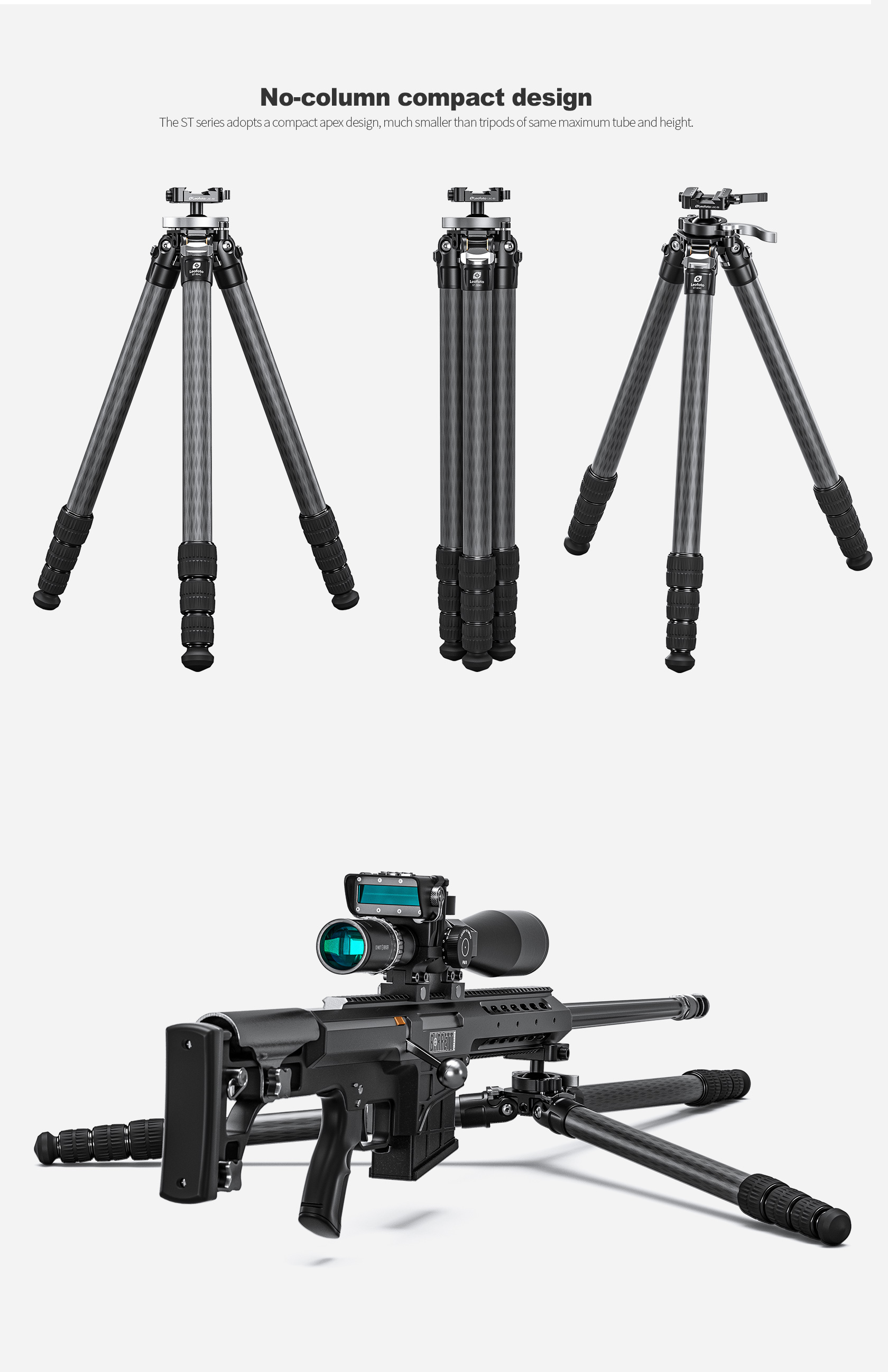 The Leofoto ST Series Rifle Tripods are one of the most compact apex setups on the market with a perfectly balanced weight to strength ratio. The ST Series features a knob-controlled clamp, with the option to choose either a dual Arca & Picatinny clamp or an Arca-only clamp, along with a knob-controlled, integrated ball head. These tripods provide maximum rigidity, making them ideal for supporting non-traditional shooting positions. They also feature three angle stop positions to increase shooting position capabilities and a compact design which maintains a small footprint, creating a tripod setup which is extremely easy to pack and carry on the go.