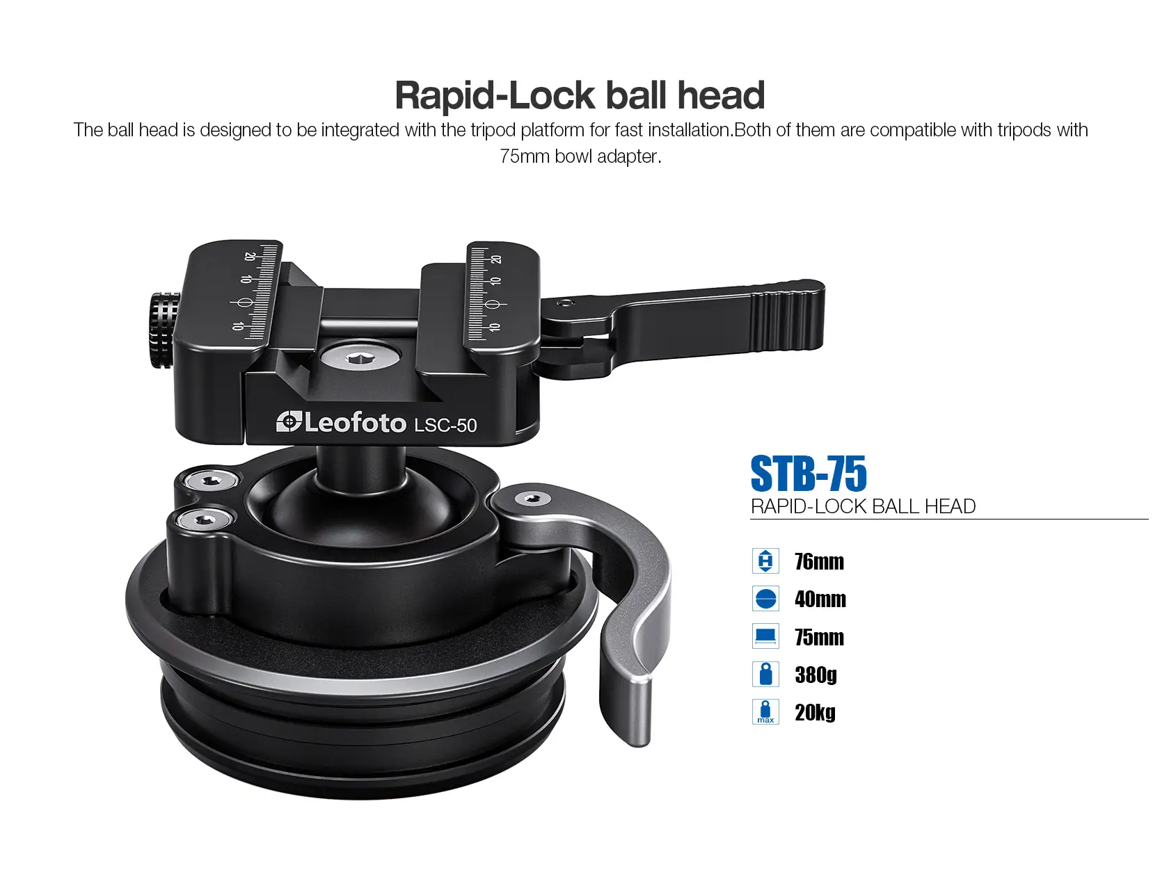 The Leofoto STB-75 Rapid Lever-Lock Rifle Ball Head is machined from solid aircraft grade aluminum and hard anodized for the optimal strength and durability. The STB-75 is designed to be used with 75mm compatible systematic tripod apexes. It features a redesigned lever-release clamp as well as a lever controlled ball lock which creates an extremely low-profile setup. The STB-75 has an integrated 75mm sized systematic adapter and cannot be used as a normal ball head and is not compatible with 3/8″ mounting studs. This product can only be placed into a 75mm systematic tripod apex.