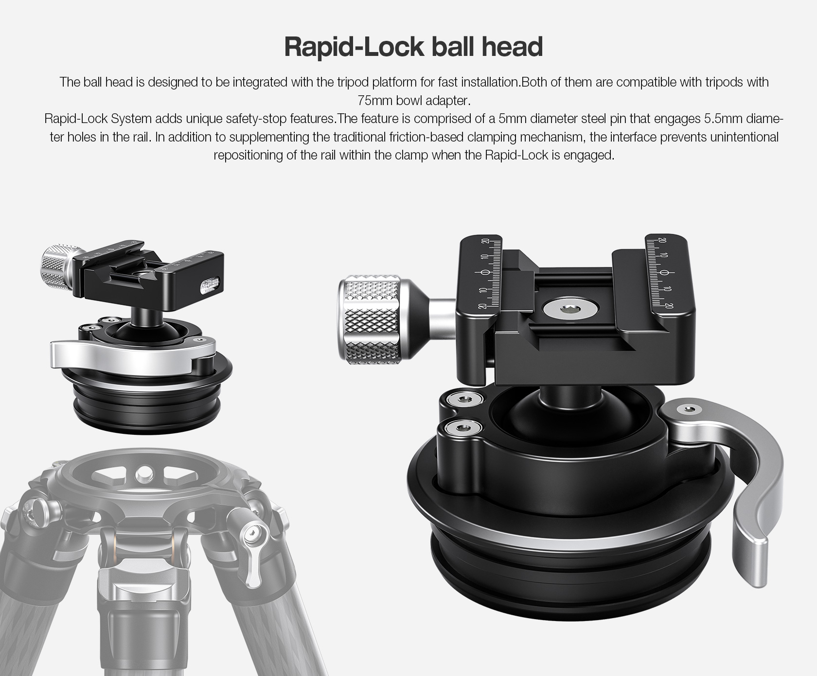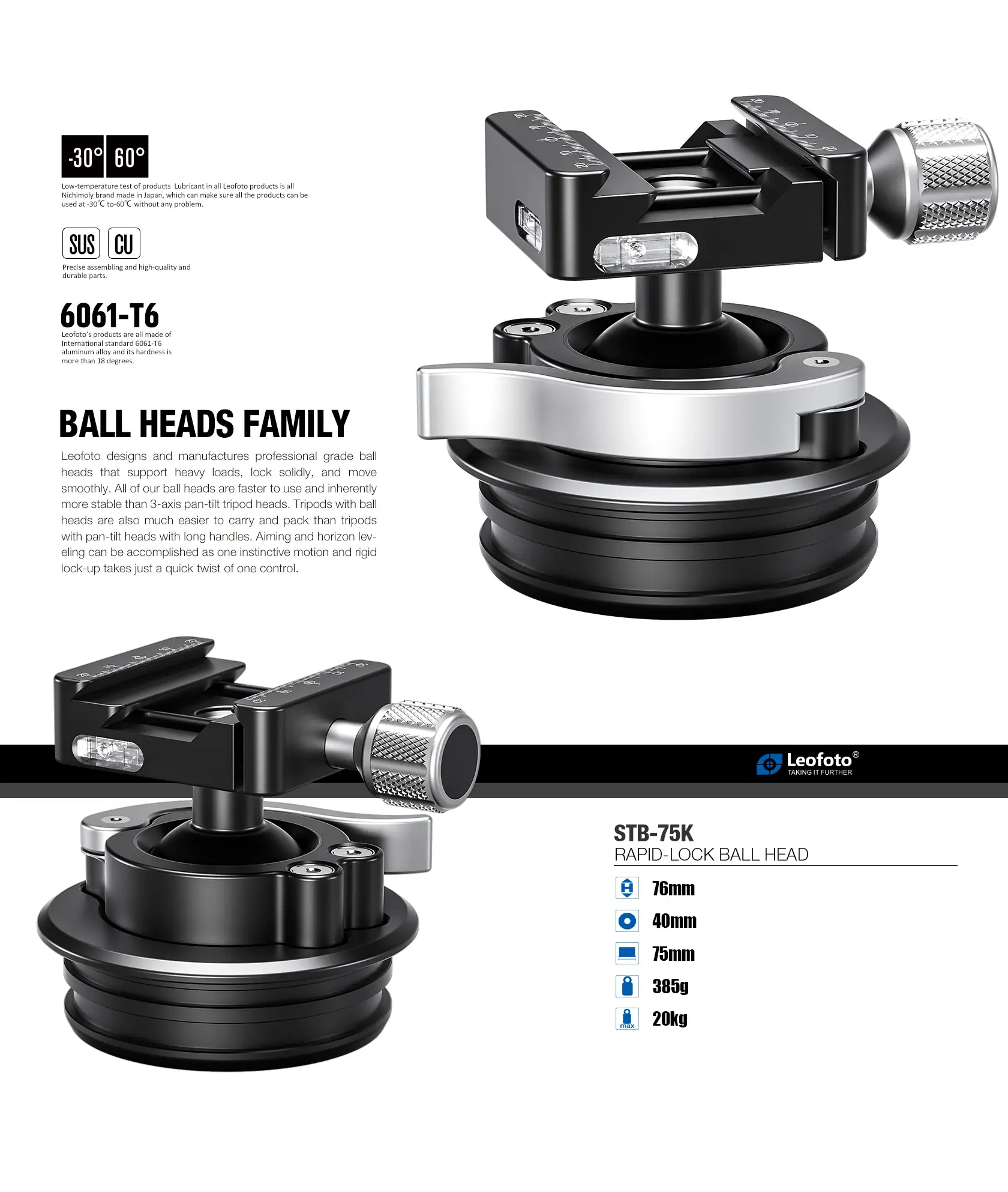 The Leofoto STB-75 Rapid Rifle Ball Head is machined from solid aircraft grade aluminum and hard anodized for the optimal strength and durability. The STB-75 is designed to be used with 75mm compatible systematic tripod apexes. The STB-75 has an integrated 75mm sized systematic adapter and cannot be used as a normal ball head and is not compatible with 3/8″ mounting studs. This product can only be placed into a 75mm systematic tripod apex.
