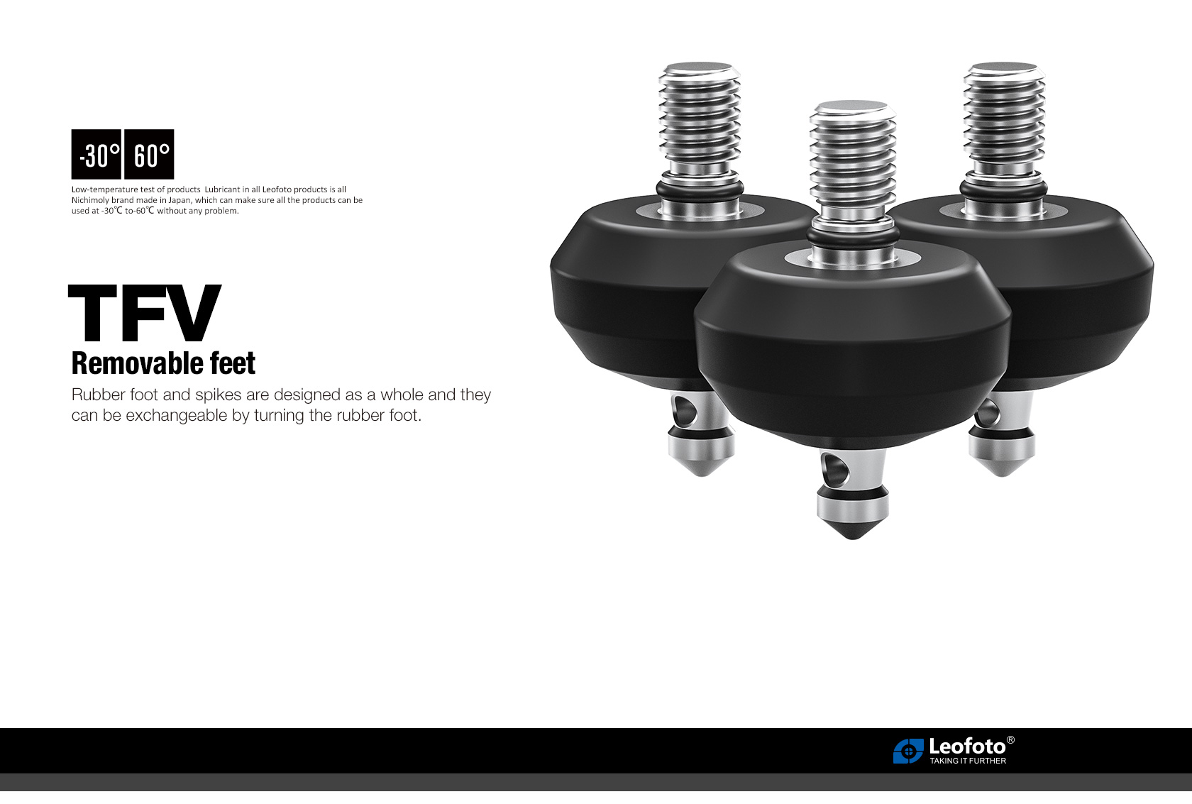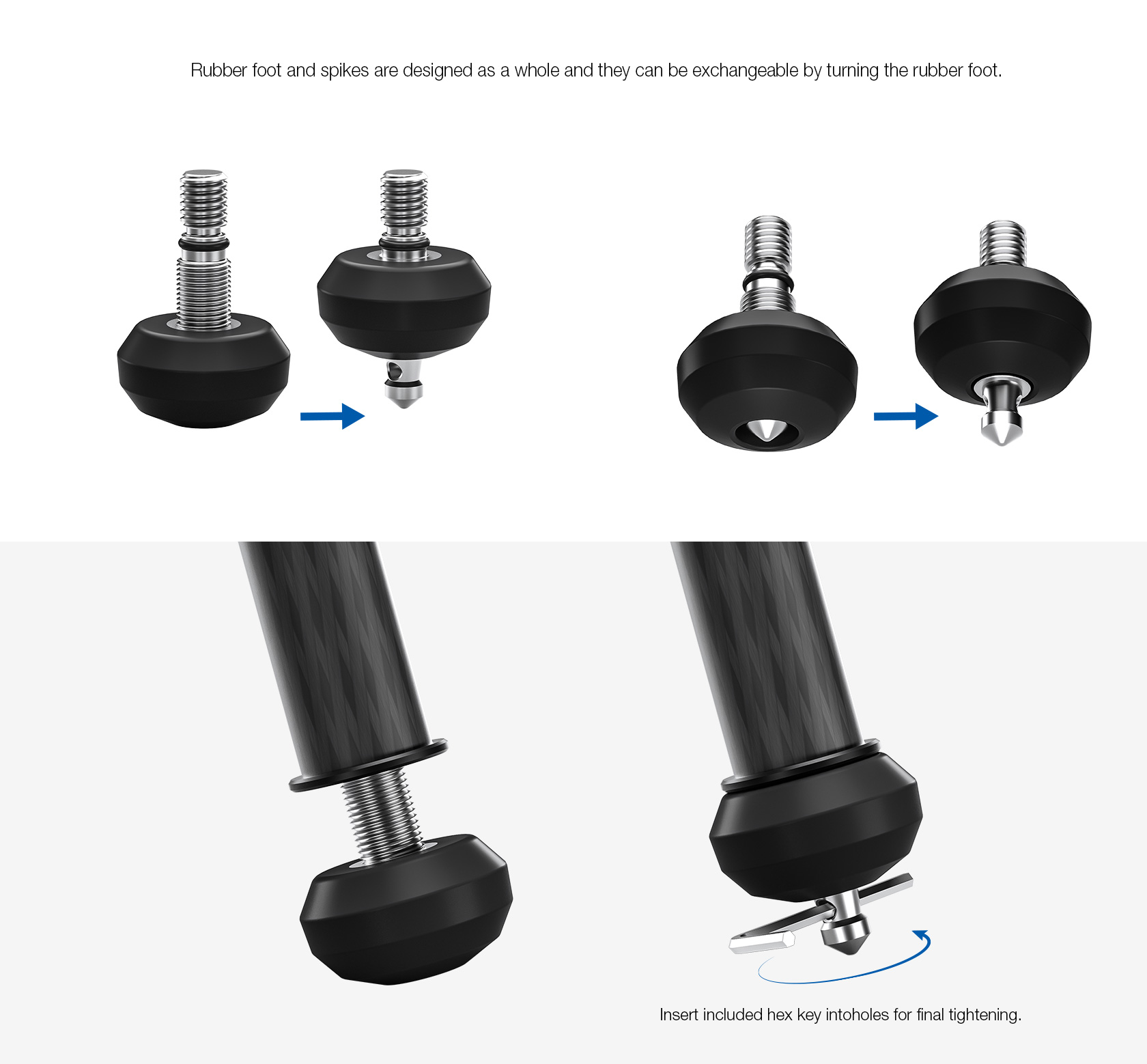 Rubber foot and spikes are designed as a whole and they can be exchangeable by turning the rubber foot.