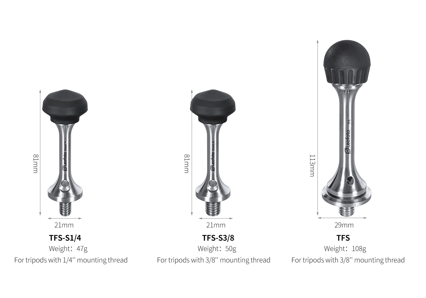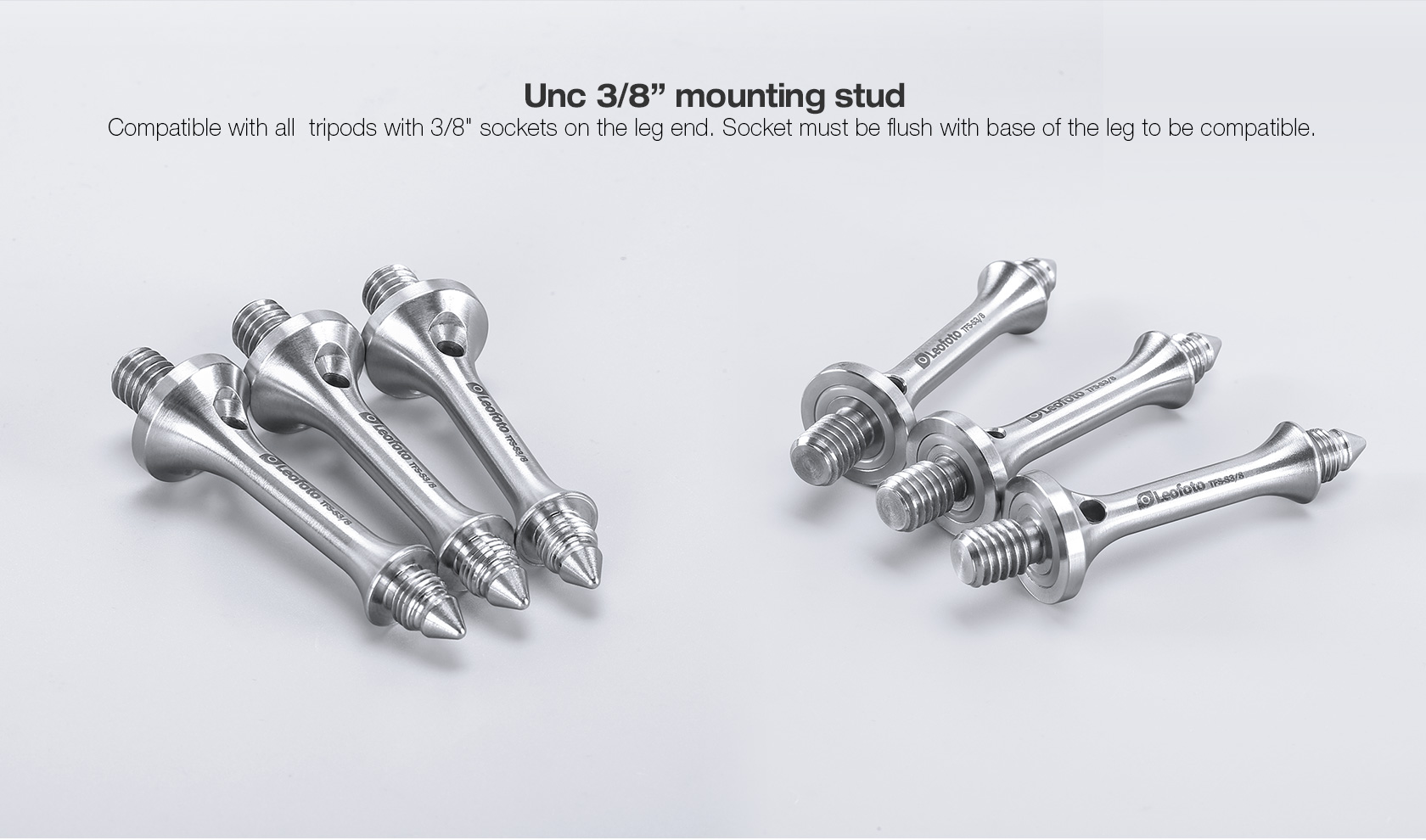 The Leofoto TFS 3/8 Long Spike/Rubber Foot Set comes with three long spikes with rubber end caps. The rubber end caps are used for indoor environments and may be removed for outdoor terrain. A rubber washer on the top of each spike ensures secure support for your tripod legs. Each claw features a 3/8″ mounting screw and can be attached to the bottom of tripod legs that have a 3/8″ thread for tripod feet.