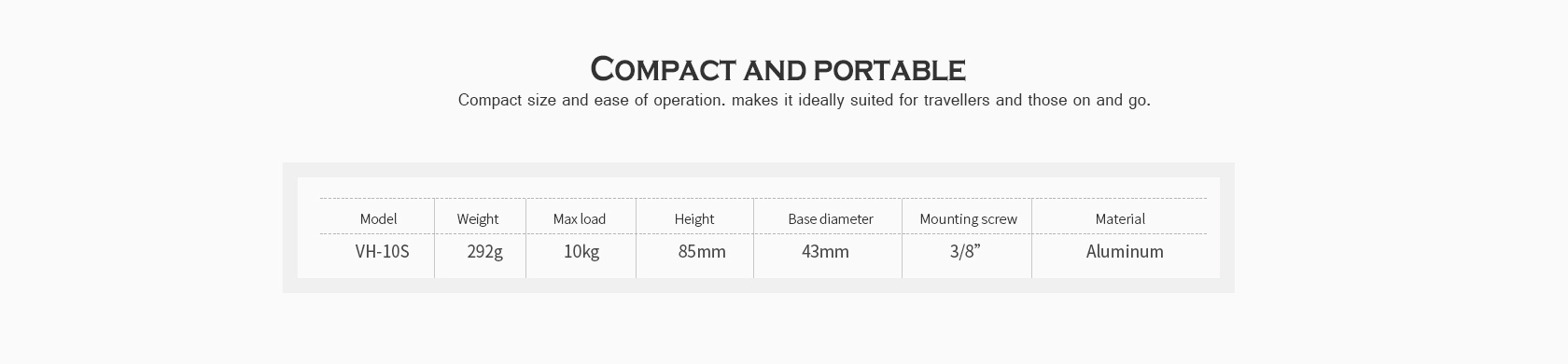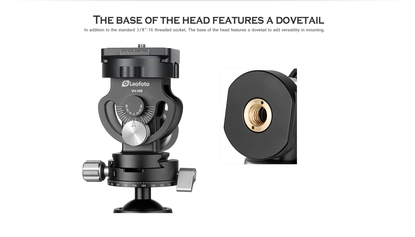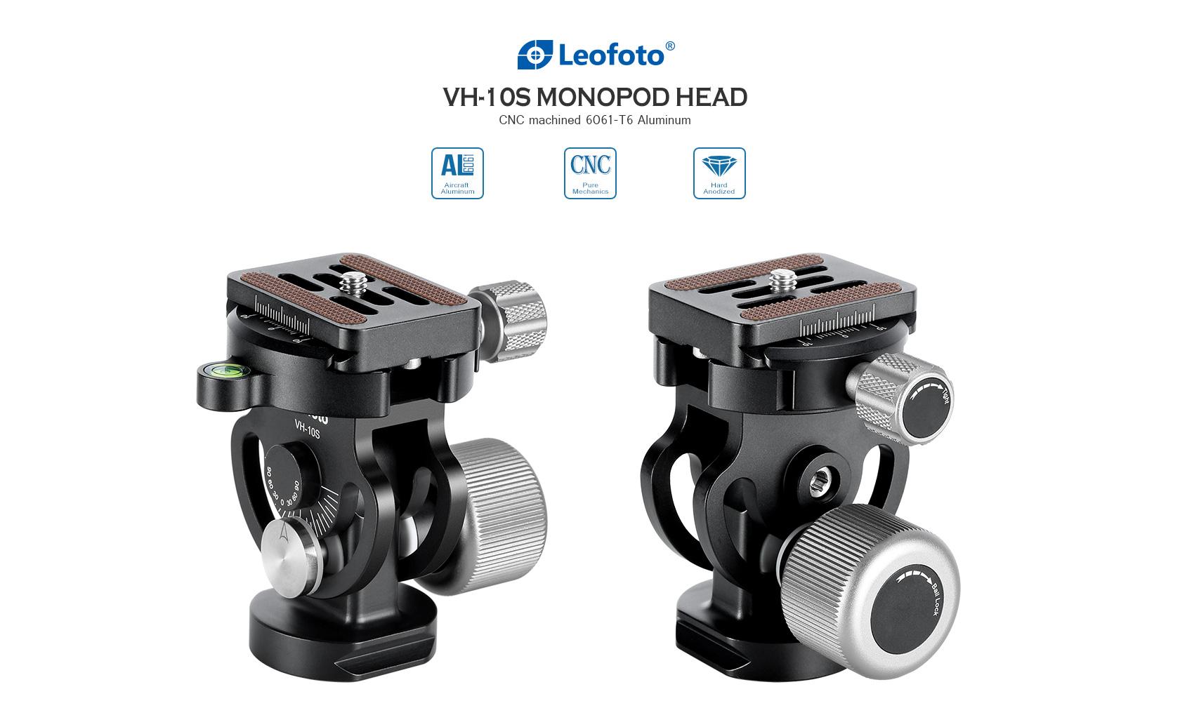 The Leofoto VH-10S 2-Way Monopod Head is a compact monopod head with an Arca compatible quick-release plate and clamp for supporting and positioning cameras and lenses weighing up to 22 pounds. It features large, knurled knobs for easy and secure tightening and numbered scales for precise and repeatable positioning. The head has a tilt range of 180°, and a bubble level for proper level orientation on uneven terrain. The VH-10S has a 3/8″-16 threaded mount in the base and an Arca-type dovetail design to be quickly mounted in an existing arca compatible clamp.