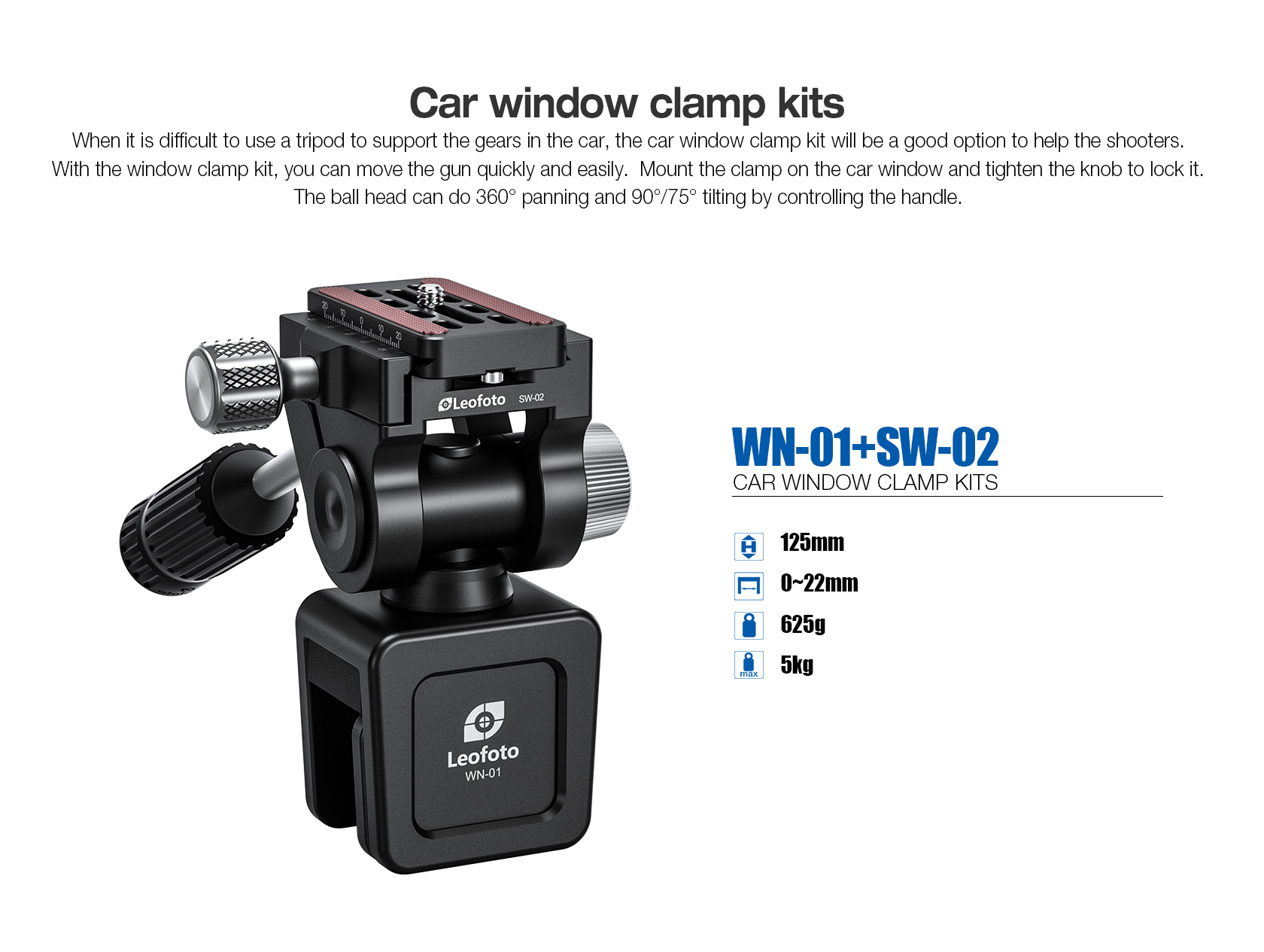 When it is difficult to use a tripod in the car, the car window clamp kit will come in handy. With the window clamp kit, you can move optics quickly and easily. Mount the clamp on the car window and tighten the knob to lock it in place. The ball head can do 360° panning and 90°/75° tilting by controlling the handle and there is a tension control knob on the side to adjust the friction. The window clamp kit features rubber along the clamp to protect your car window from damage. Included with the WN-01+SW-02 kit is a 70mm Q-R Plate.