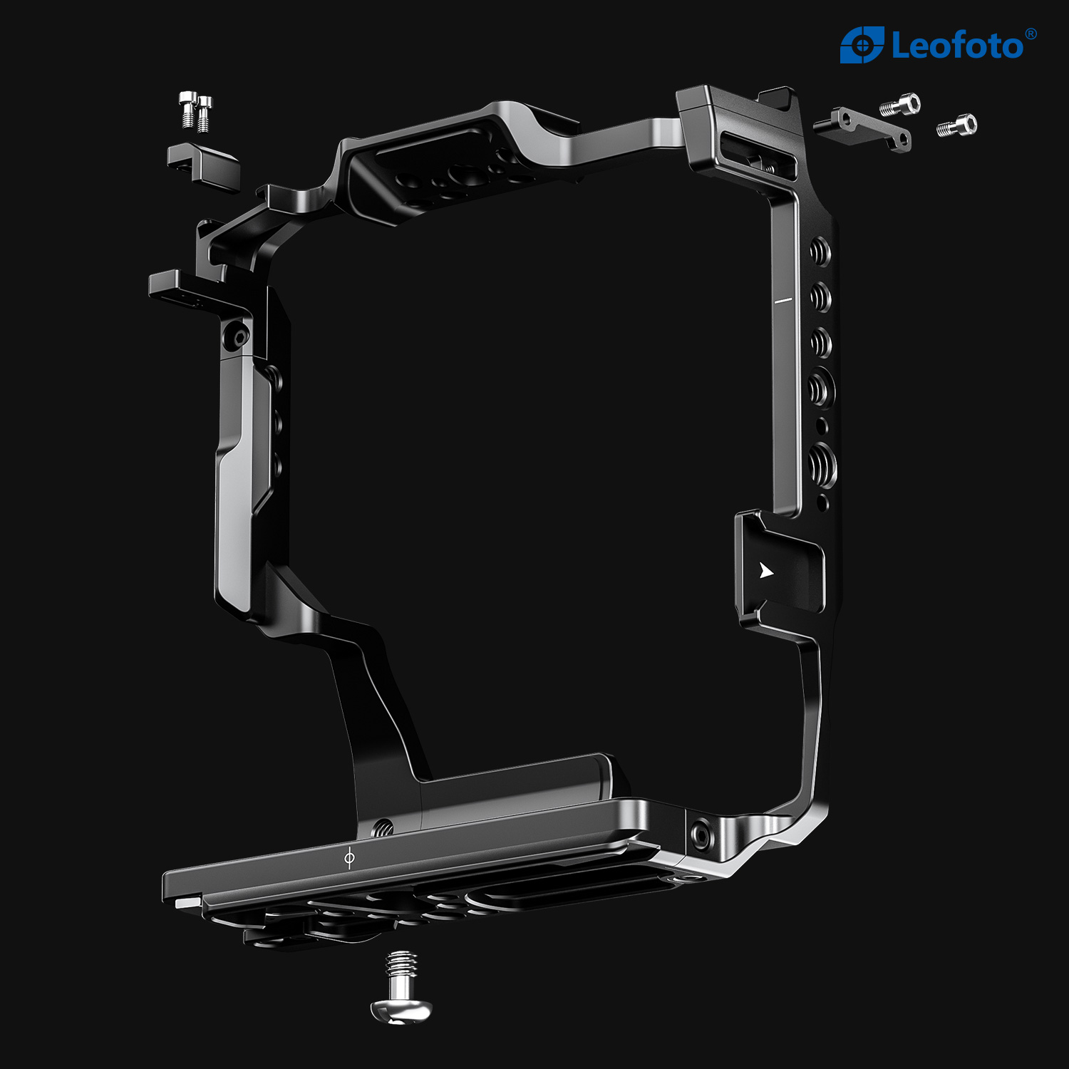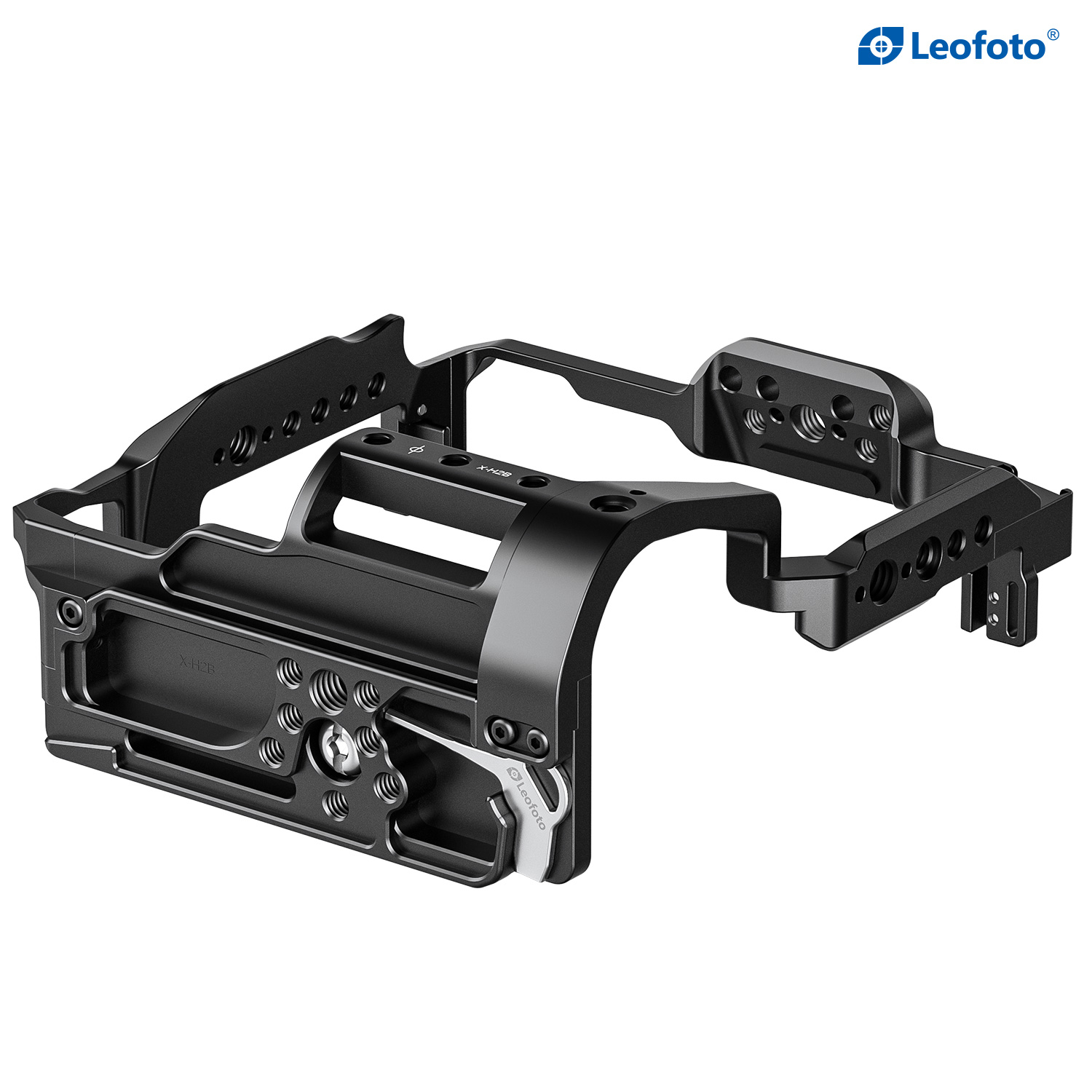 The Leofoto X-H2 Camera Cage for Fujifilm X-H2, X-H2S with FT-XH or VG-XH Battery Grip is precision machined from solid blocks of 6061-T6 aluminum. This cage features a 1/4”-20 mounting screw, compatible with any Arca-style clamp. The cage is precisely designed to fit the camera body without interference in the operation of the camera. There are multiple mounting threads on the cage to attach accessories such as microphones, handles, flashlights etc. There is also a magnetized allenkey on the bottom which is very convenient.