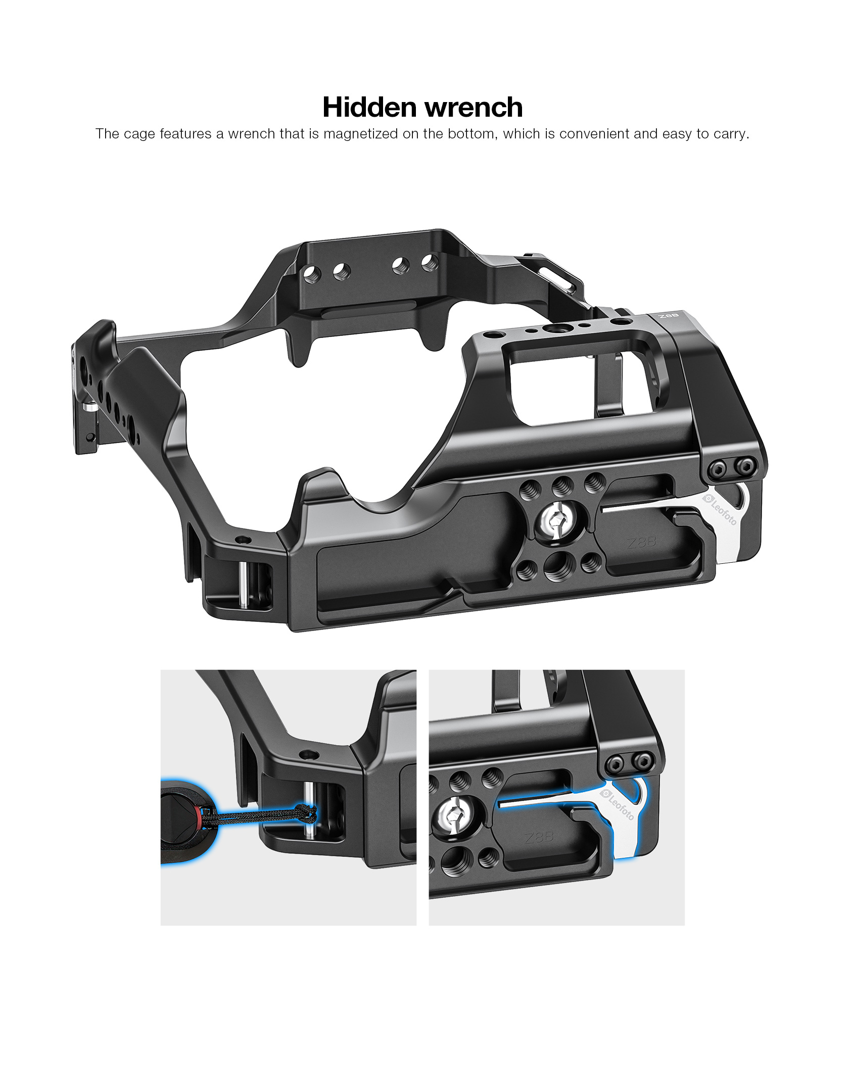 Protect and add accessories to your Nikon Z8 Battery Grip with this Leofoto Z8B Camera Cage. The form-fitting aluminum cage protects your camera without impeding access to your camera’s functions, displays, ports, or battery. The camera mounts on the cage via a 1/4″-20 stud screw, and the mounting surface features anti-slip pads that help hold your camera securely in the cage.