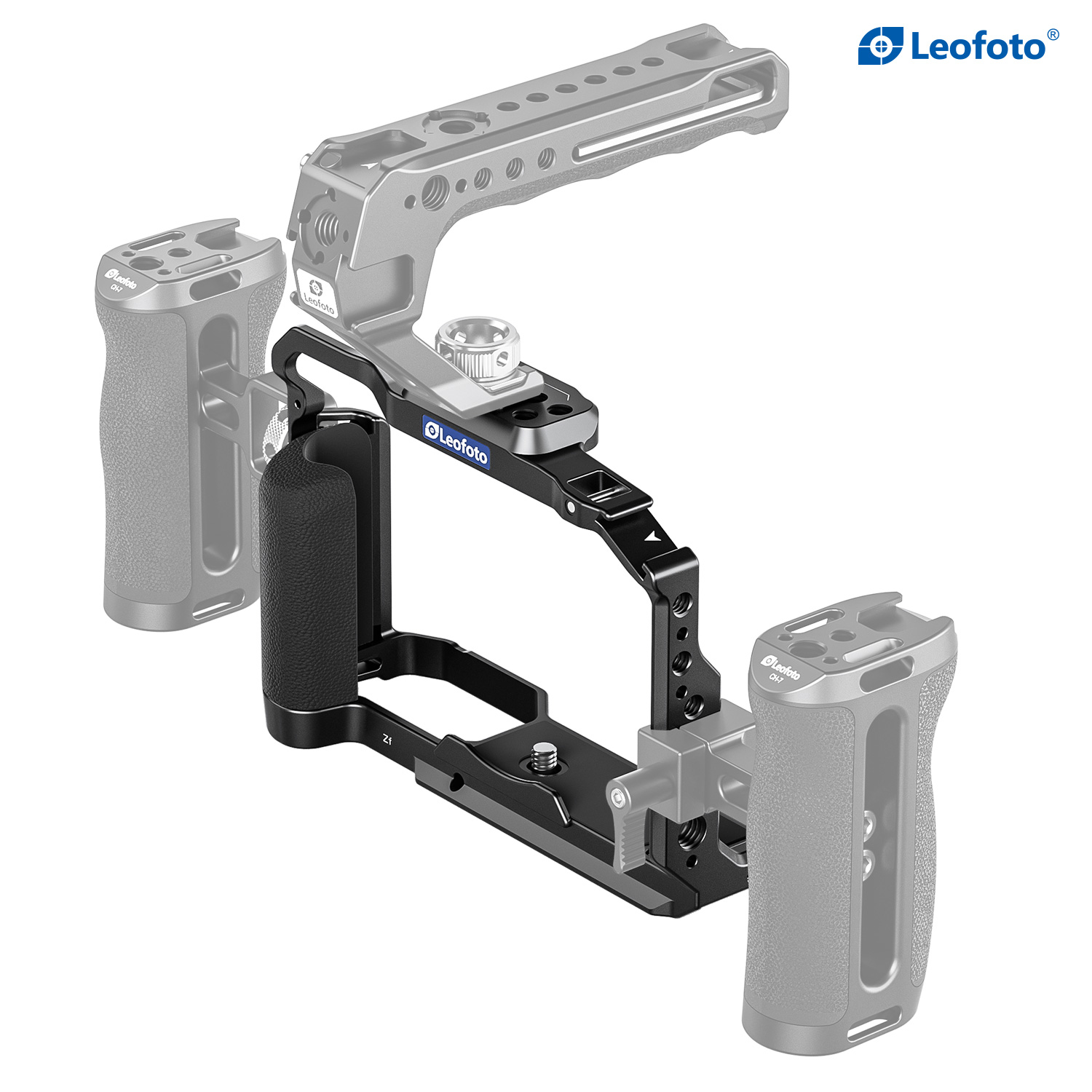 The cage incorporates multiple 1/4″-20 and 3/8″-16 ARRI-style accessory threads for additional mounting options. The bottom of the cage is tapped with 1/4″-20 and 3/8″-16 threads to connect a camera plate for tripod mounting.