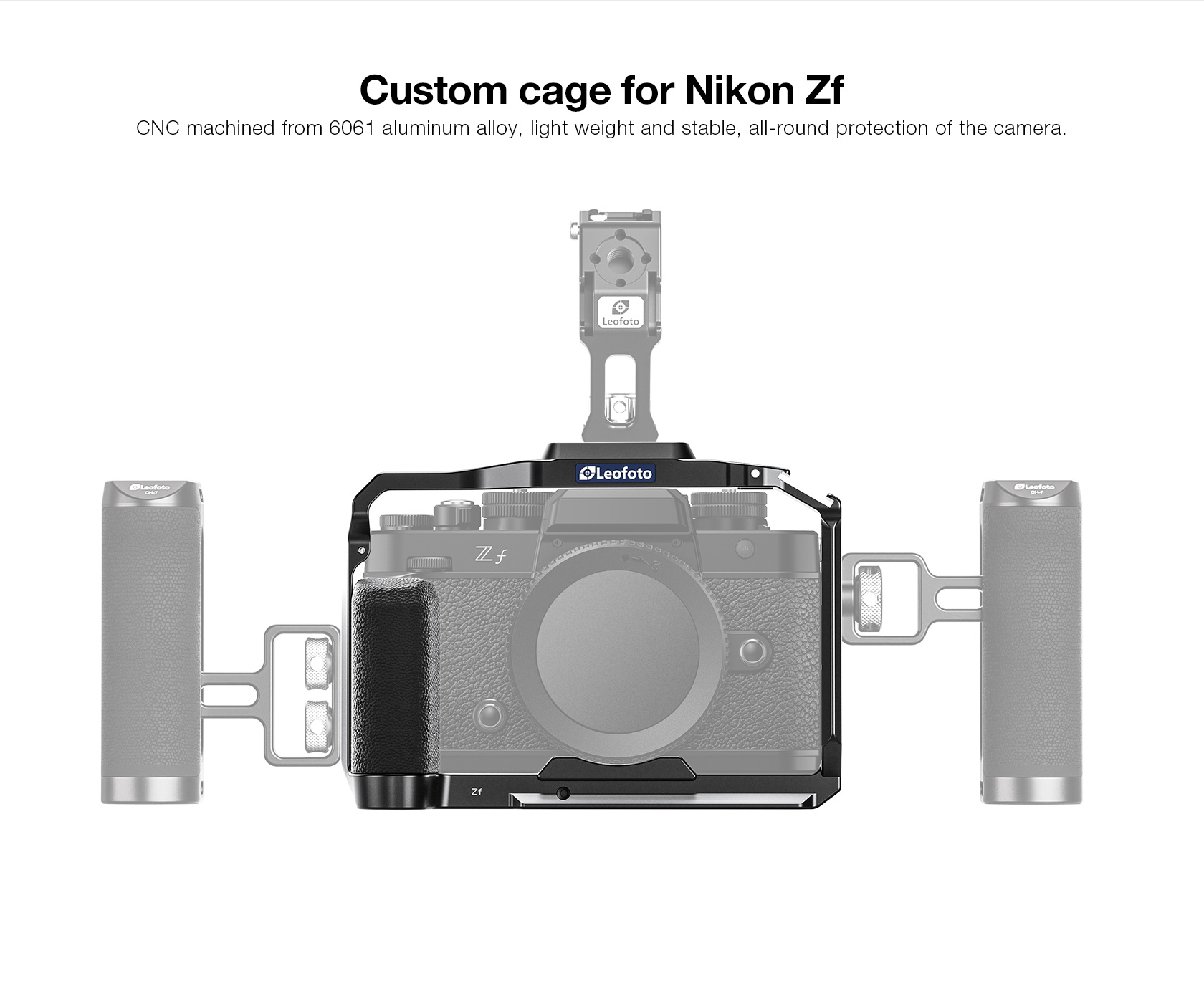 Protect and add accessories to your Nikon Zf camera with this Leofoto Zf Camera Cage. The form-fitting aluminum cage protects your camera without impeding access to your camera’s functions, displays, ports, or battery. The camera mounts on the cage via a 1/4″-20 stud screw, and the mounting surface features anti-slip pads that help hold your camera securely in the cage.