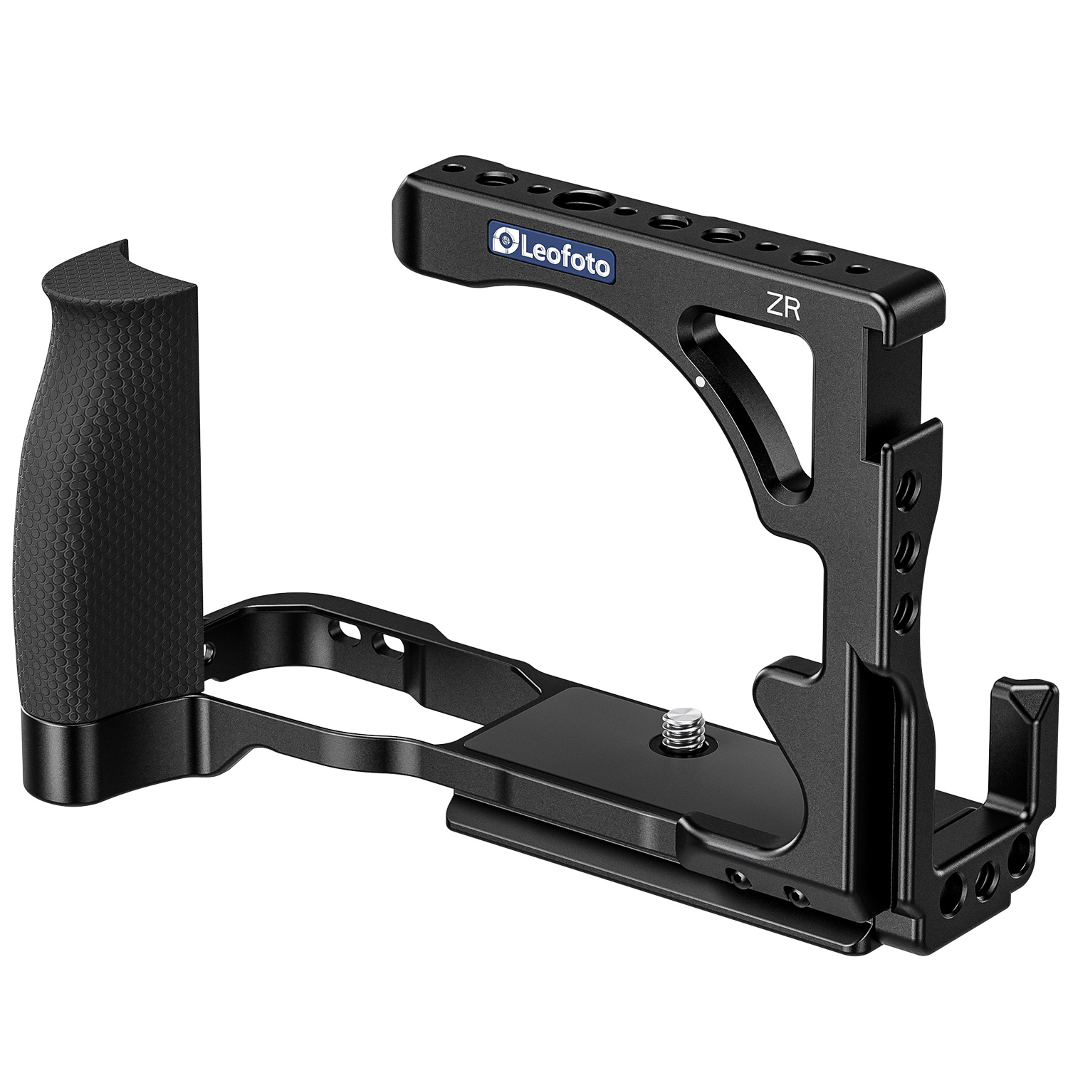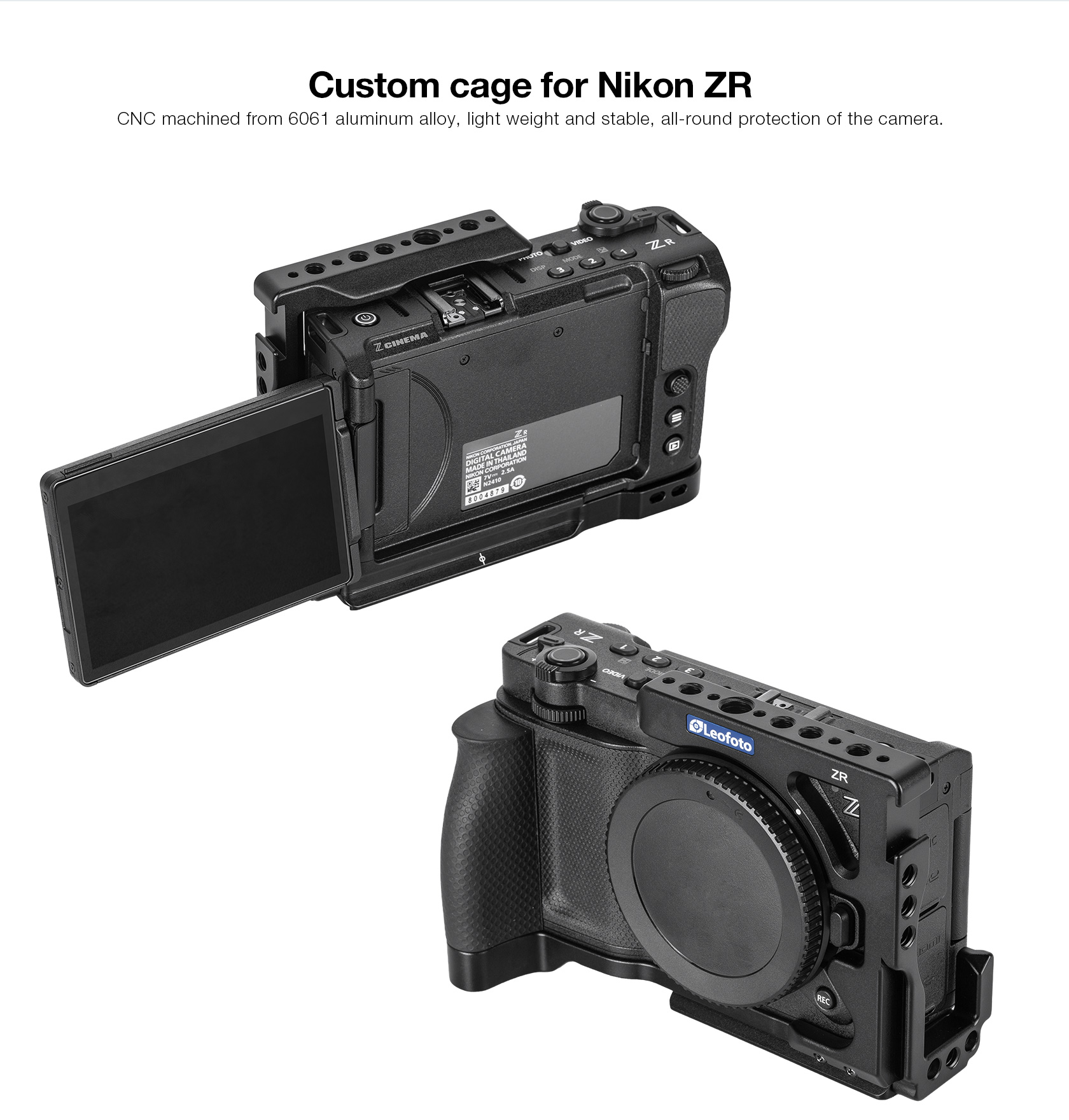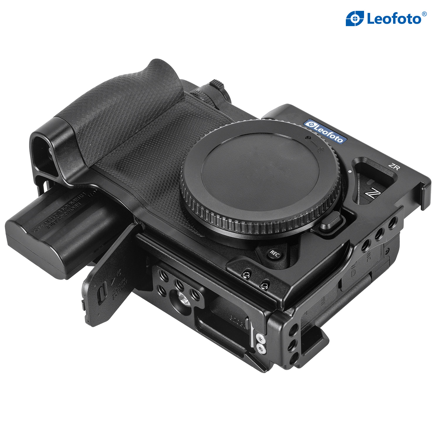 Protect and add accessories to your Nikon Zf camera with this Leofoto ZR Camera Cage. The form-fitting aluminum cage protects your camera without impeding access to your camera’s functions, displays, ports, or battery. The camera mounts on the cage via a 1/4″-20 stud screw, and the mounting surface features anti-slip pads that help hold your camera securely in the cage.