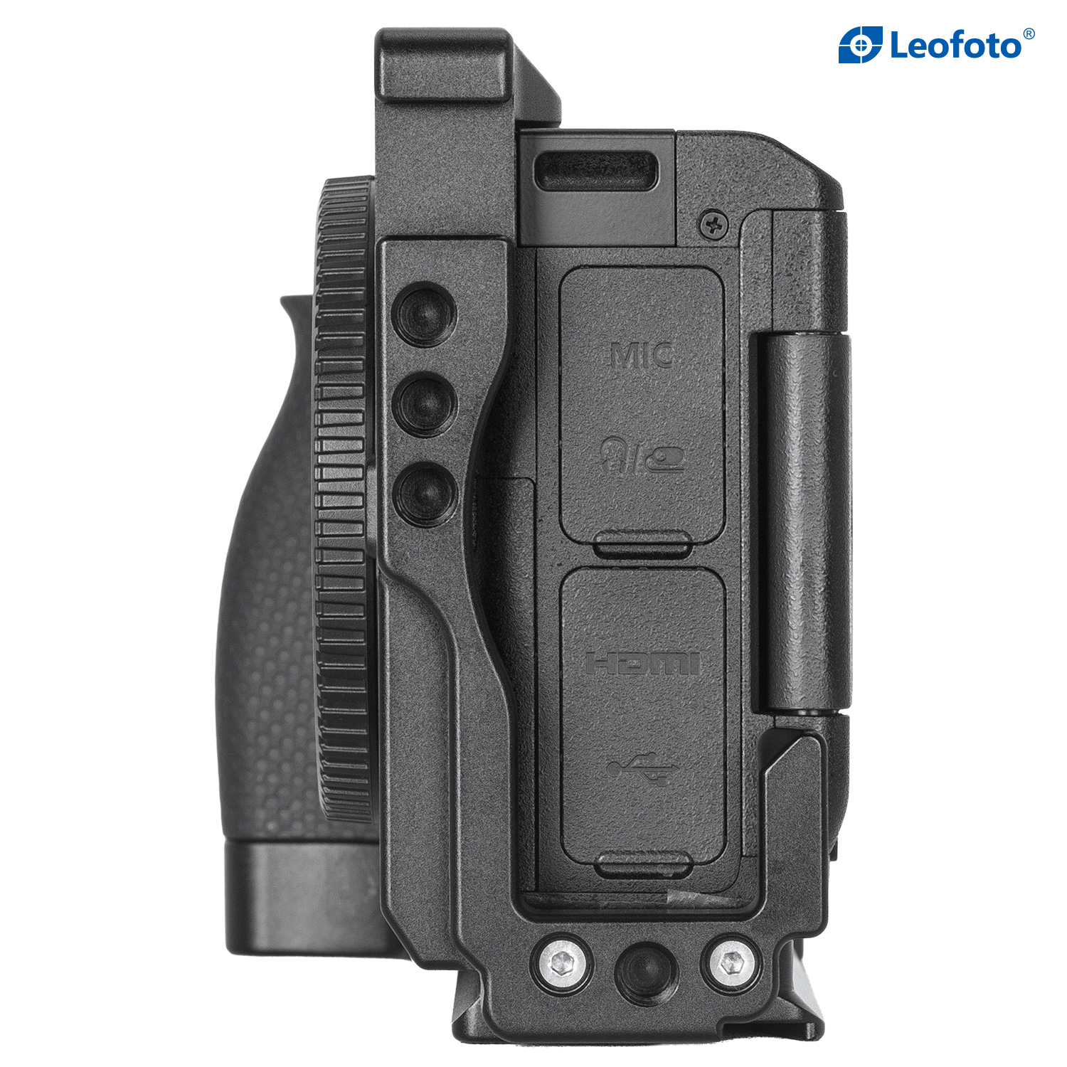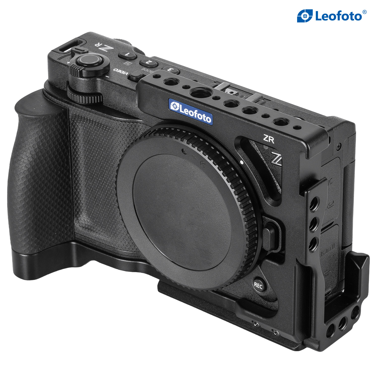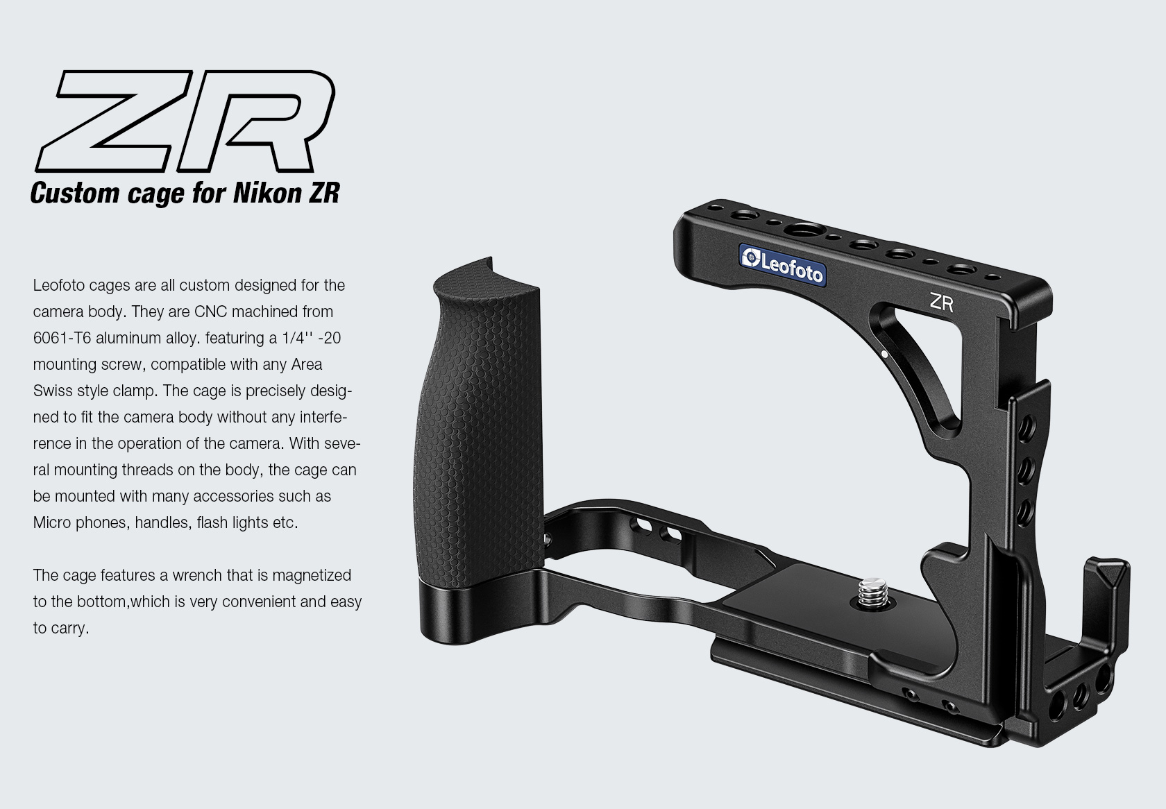 Protect and add accessories to your Nikon Zf camera with this Leofoto ZR Camera Cage. The form-fitting aluminum cage protects your camera without impeding access to your camera’s functions, displays, ports, or battery. The camera mounts on the cage via a 1/4″-20 stud screw, and the mounting surface features anti-slip pads that help hold your camera securely in the cage.